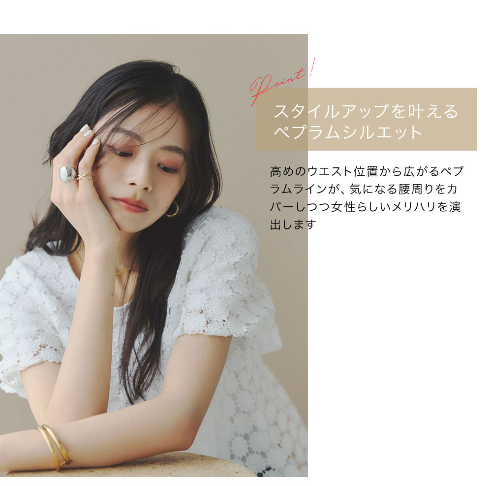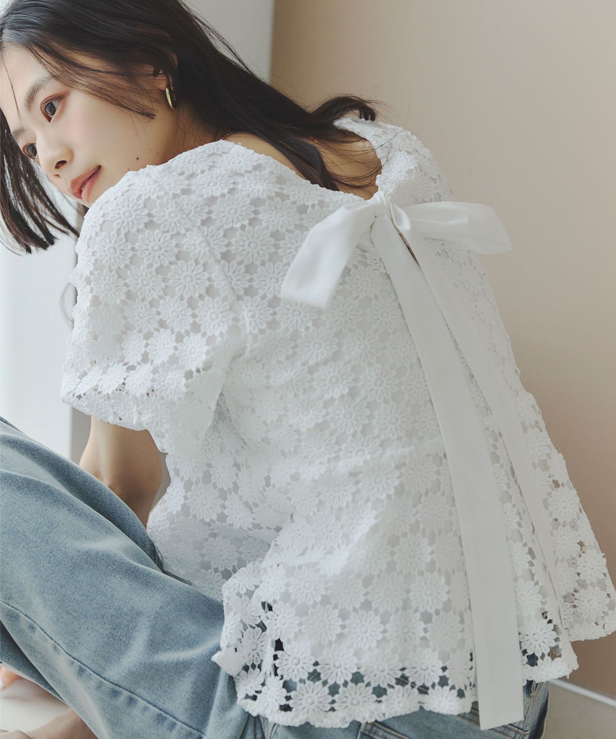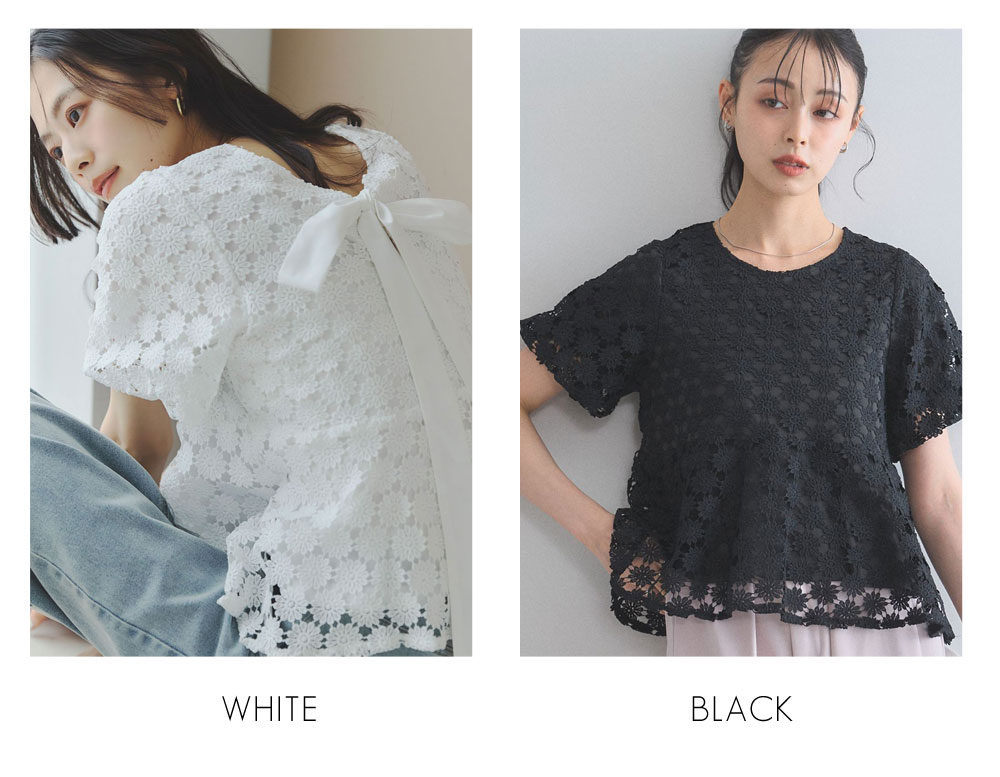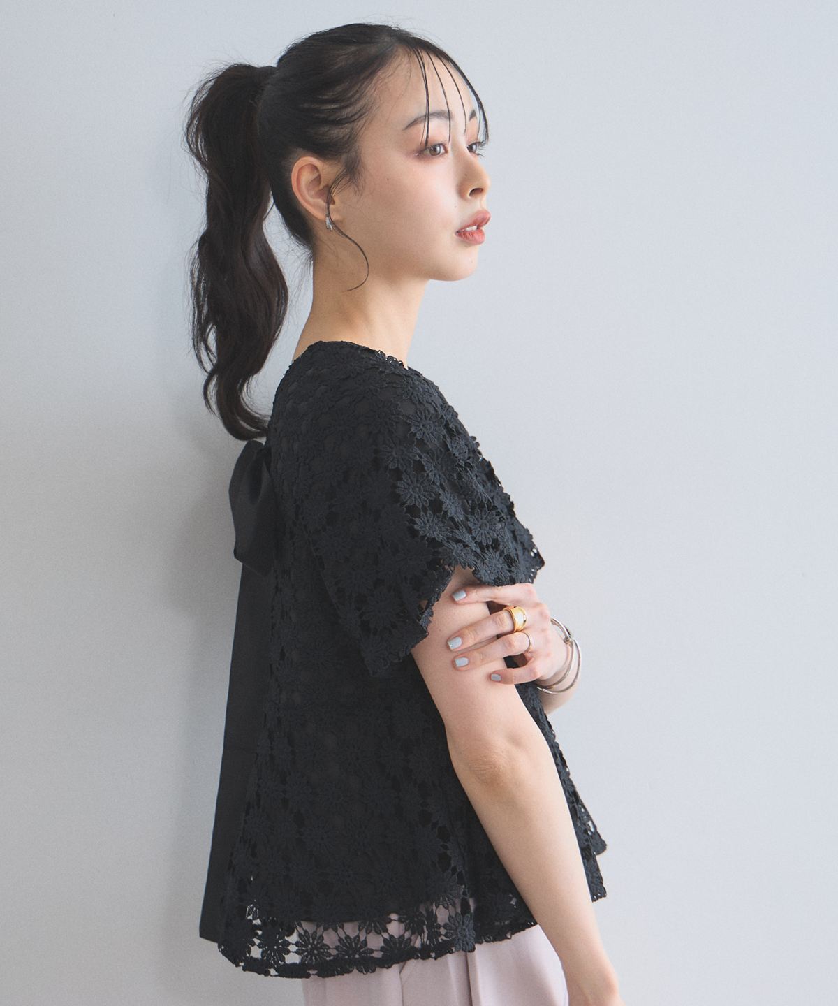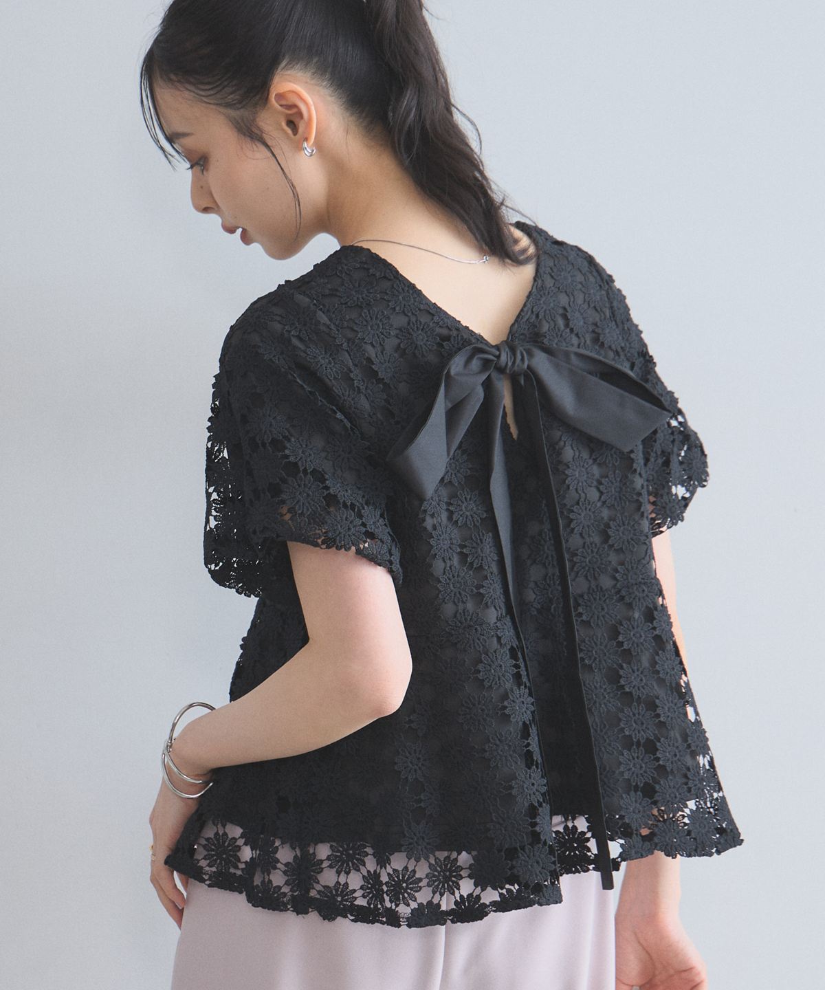 華やかな総レースが大人可愛い、バックリボン付きペプラムブラウス