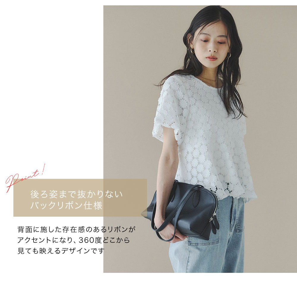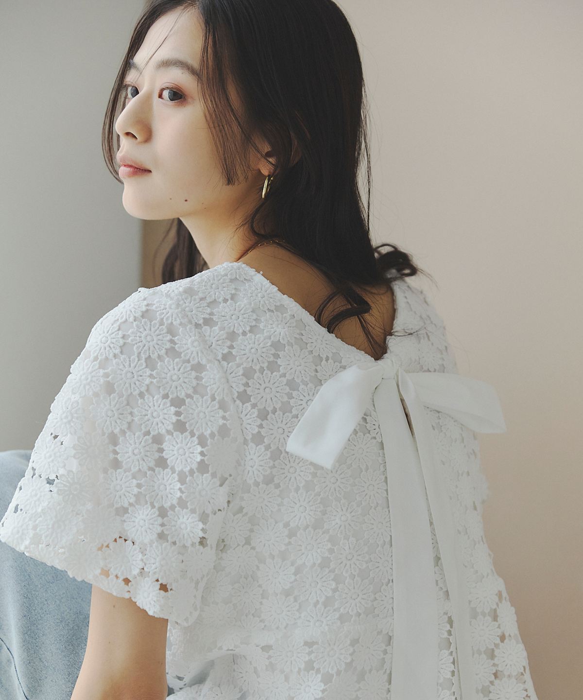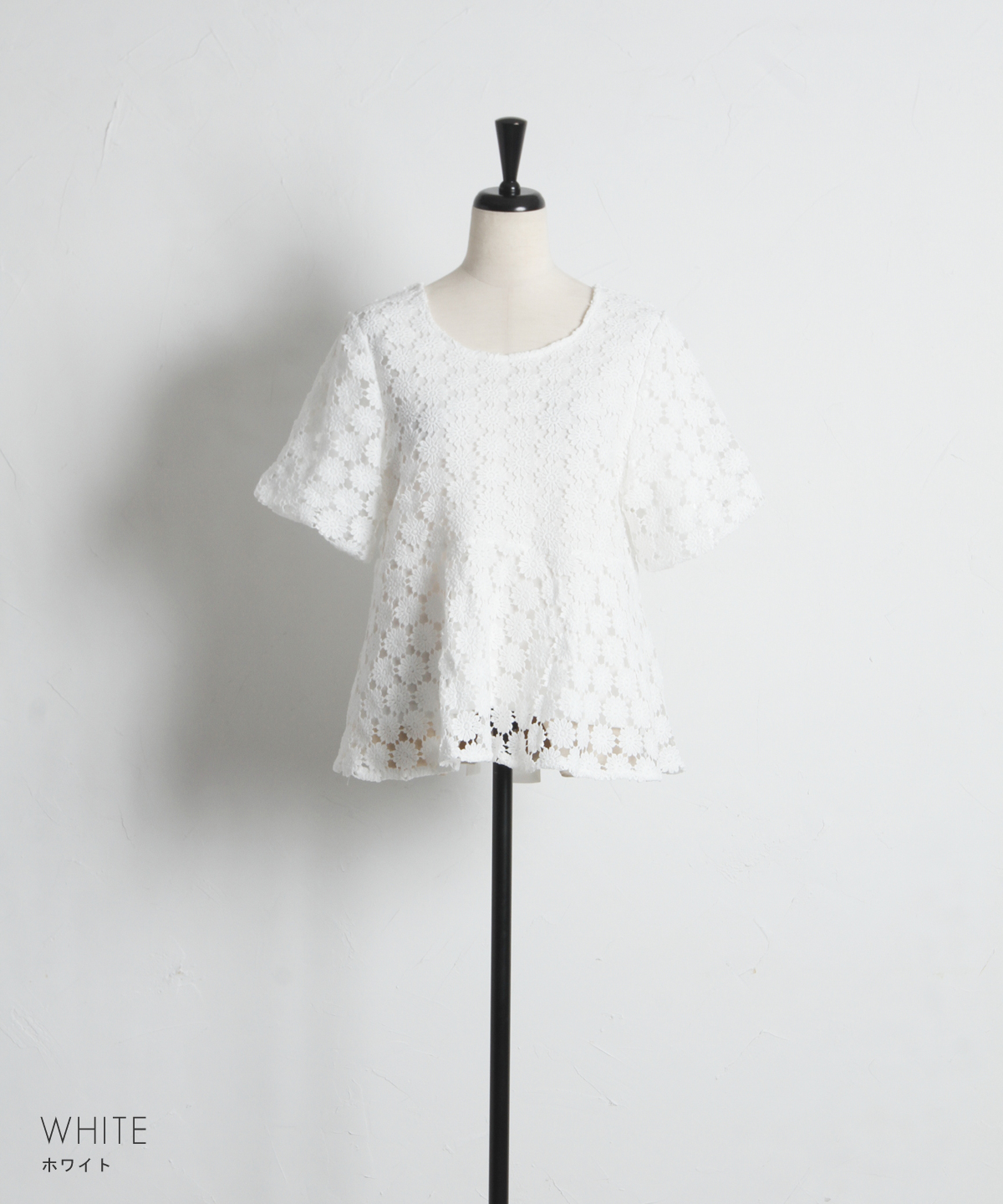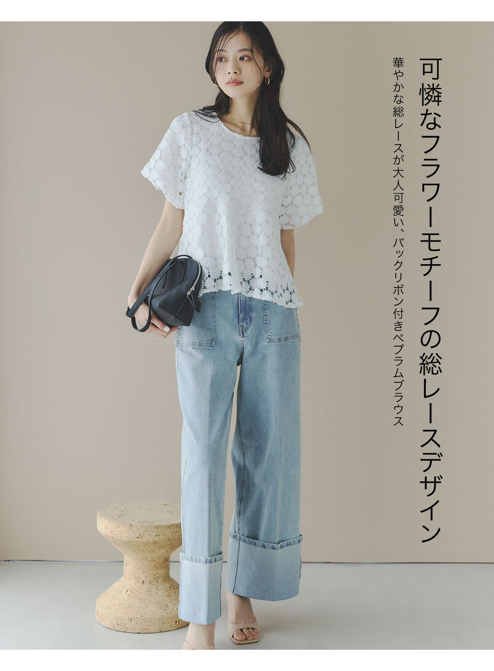 華やかな総レースが大人可愛い、バックリボン付きペプラムブラウス