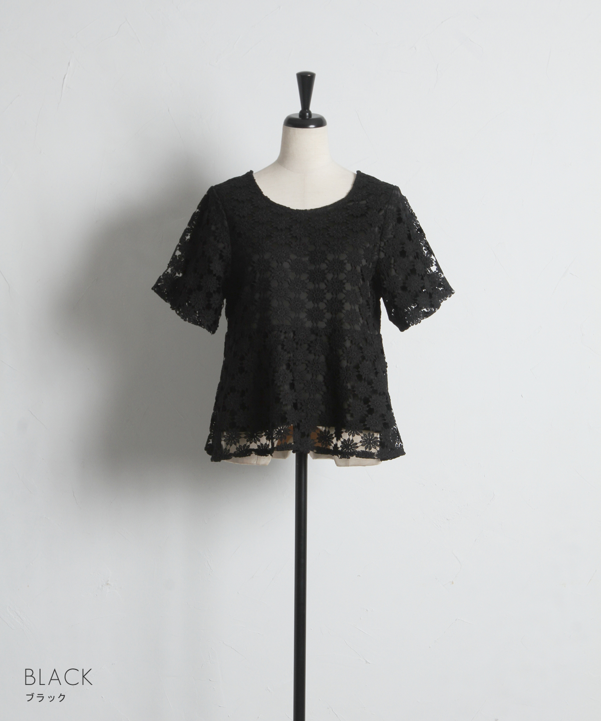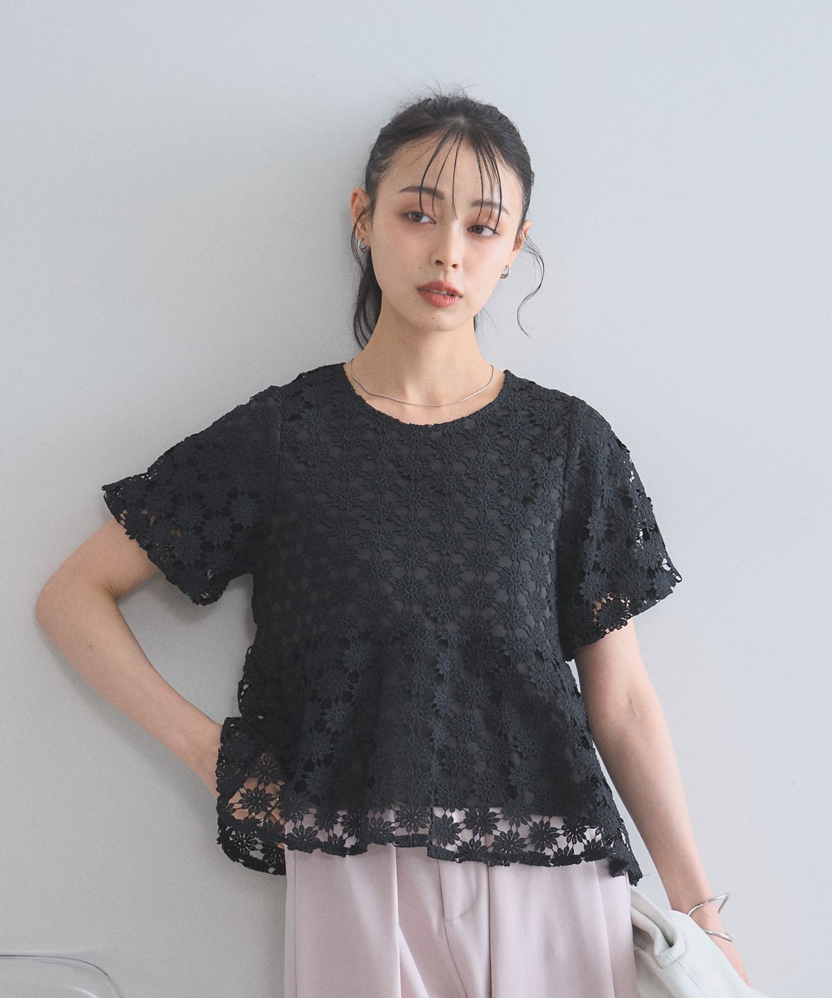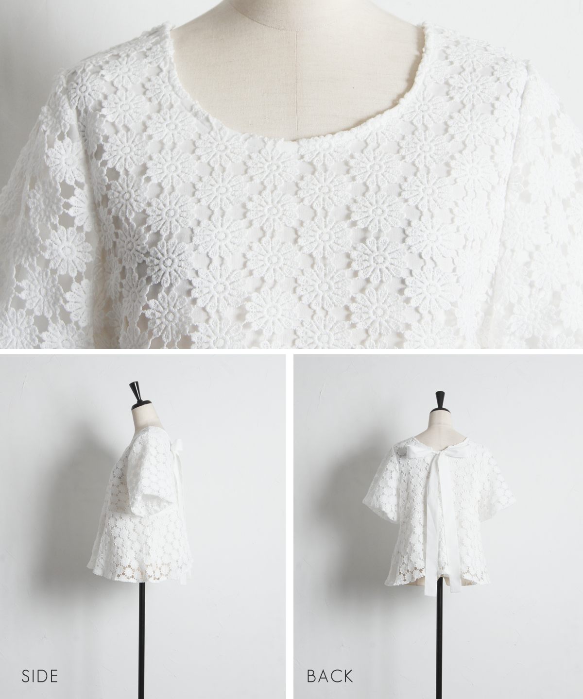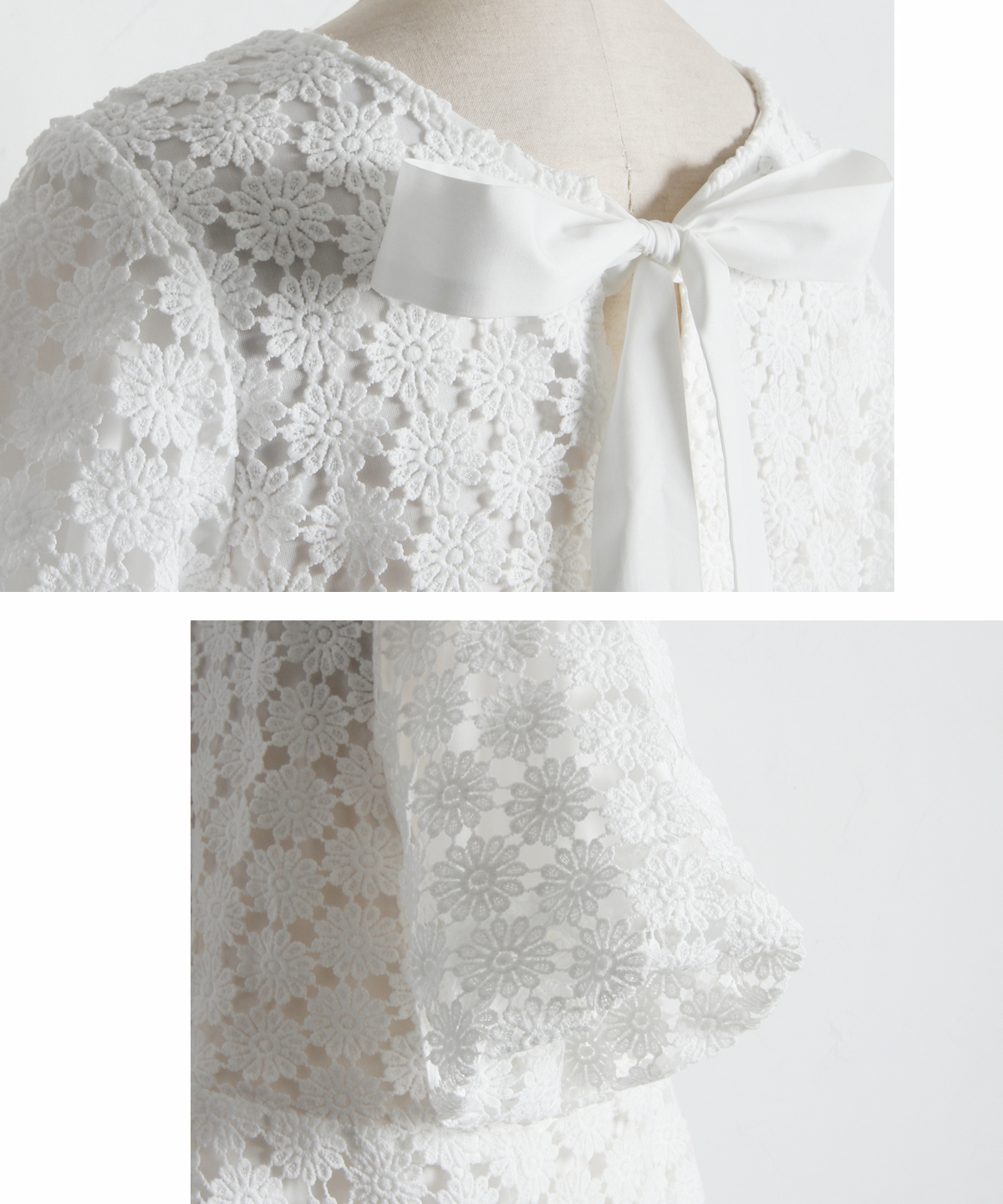 華やかな総レースが大人可愛い、バックリボン付きペプラムブラウス