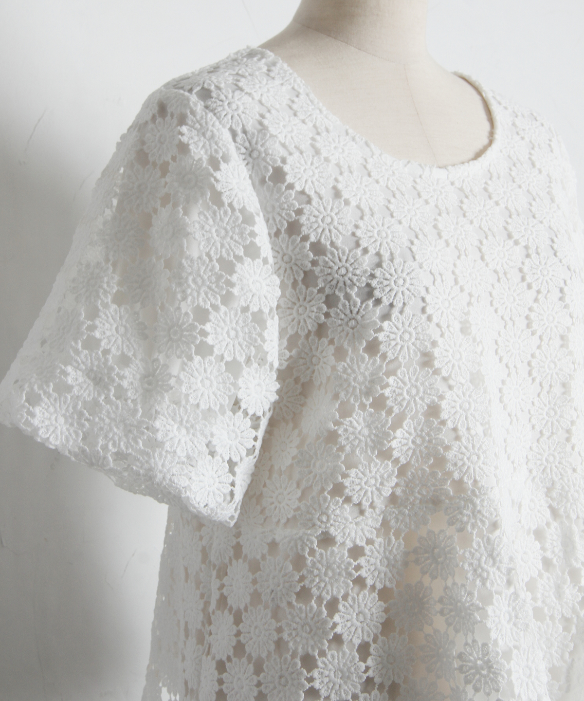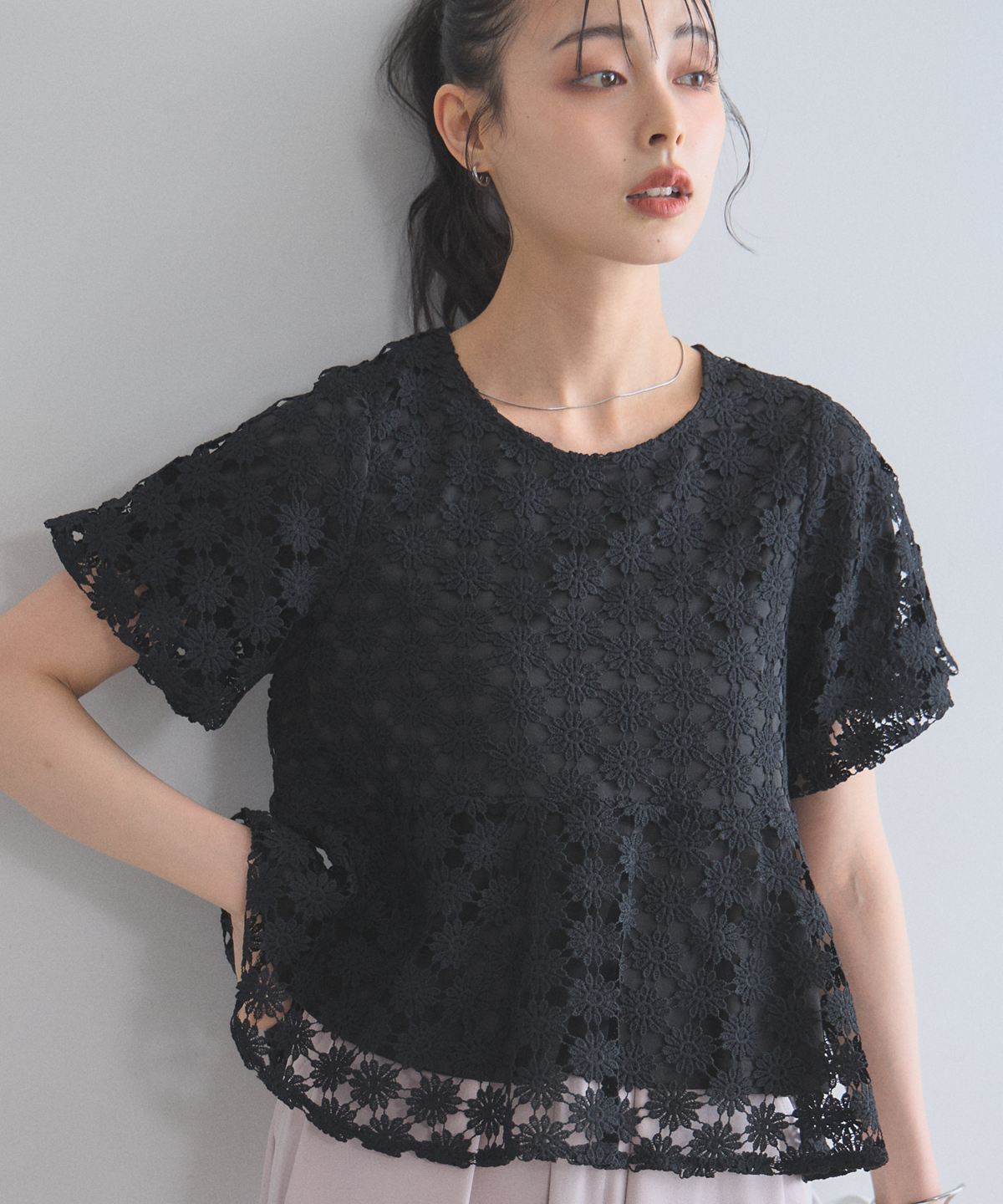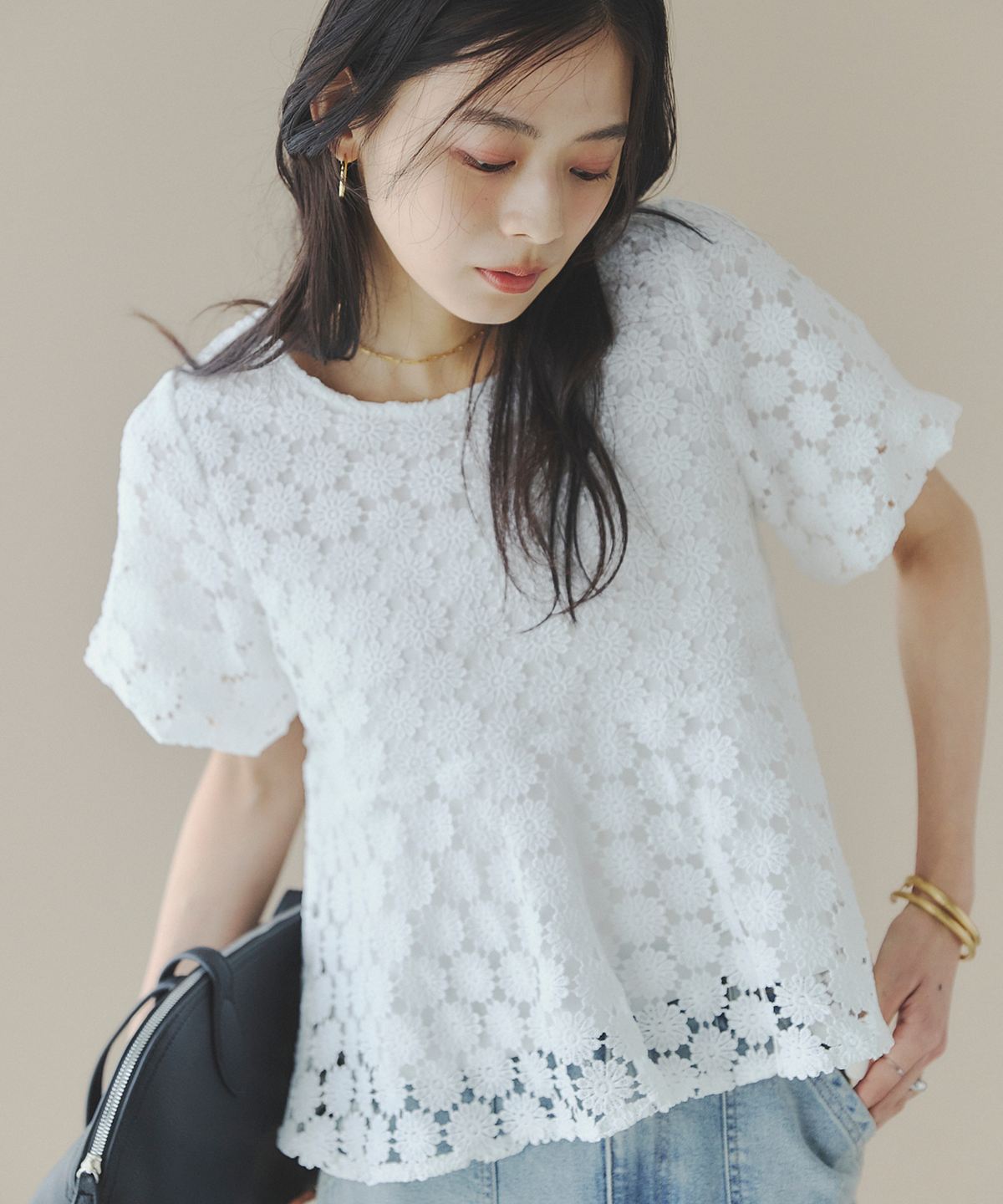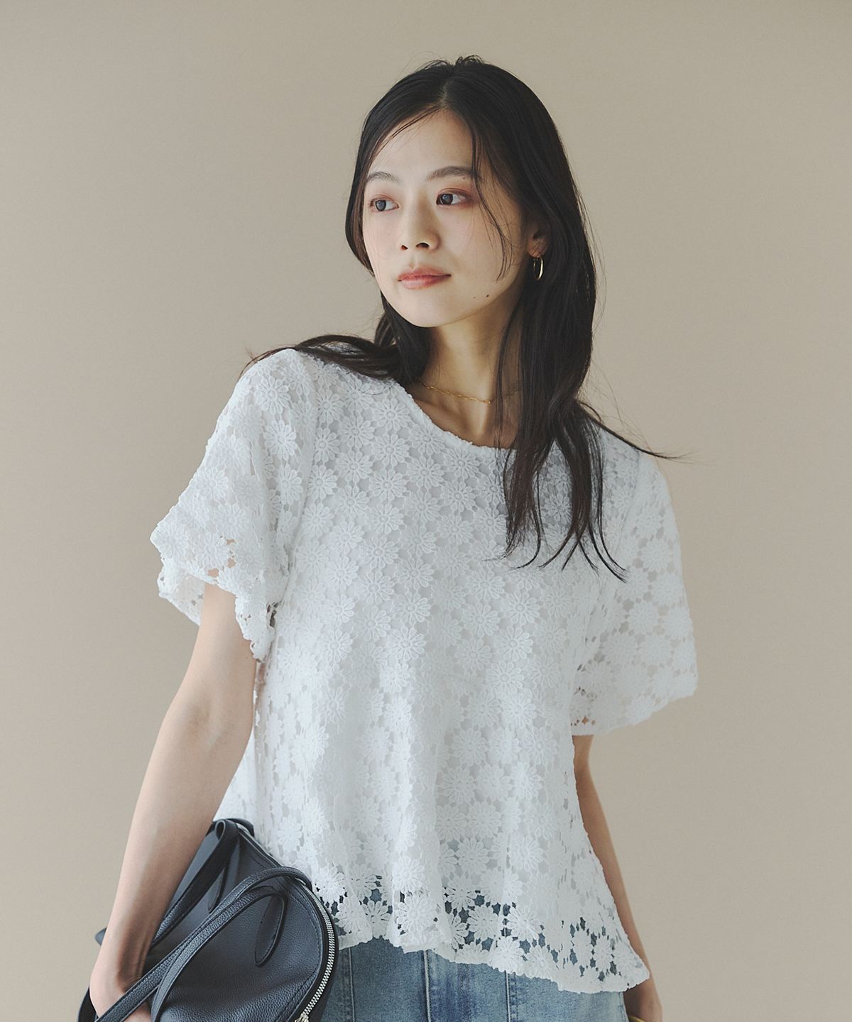 繊細な花柄レースを贅沢に使用し、着るだけで顔周りを華やかに彩ります。