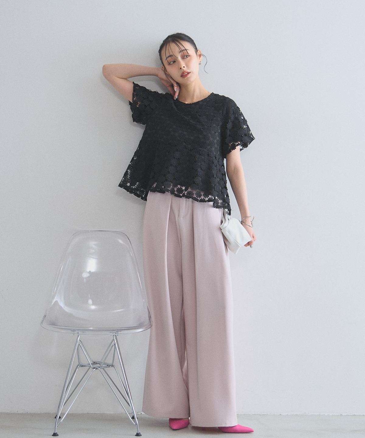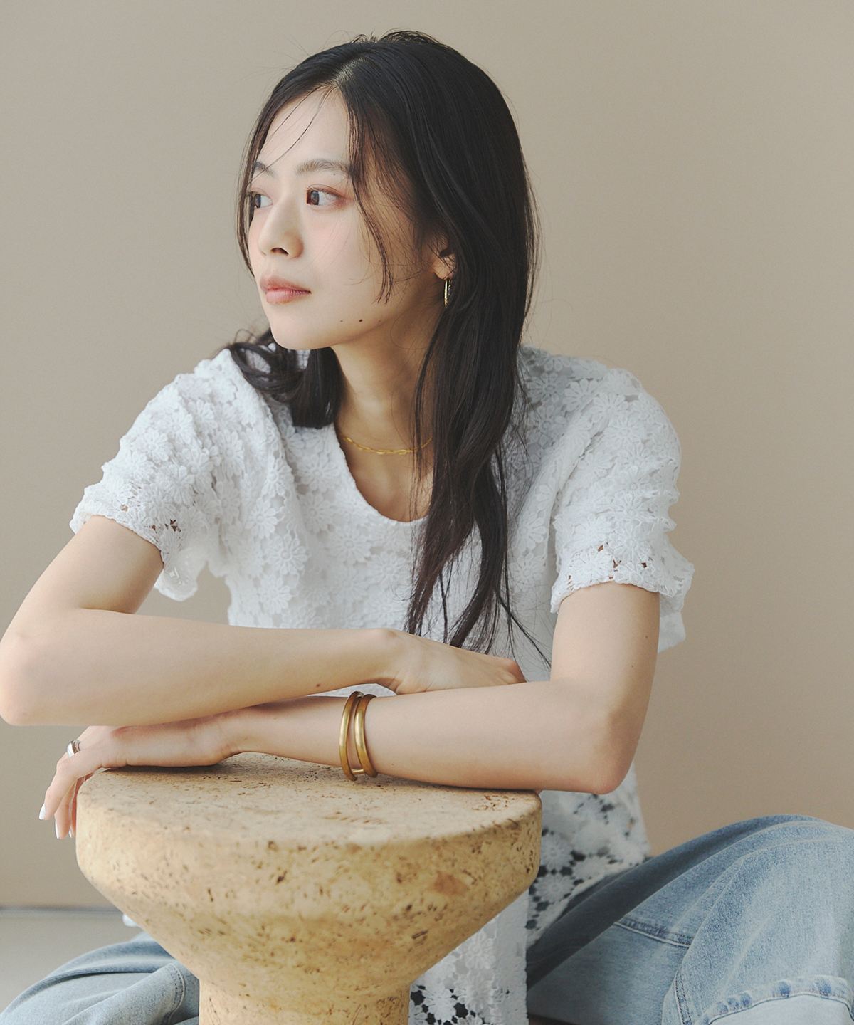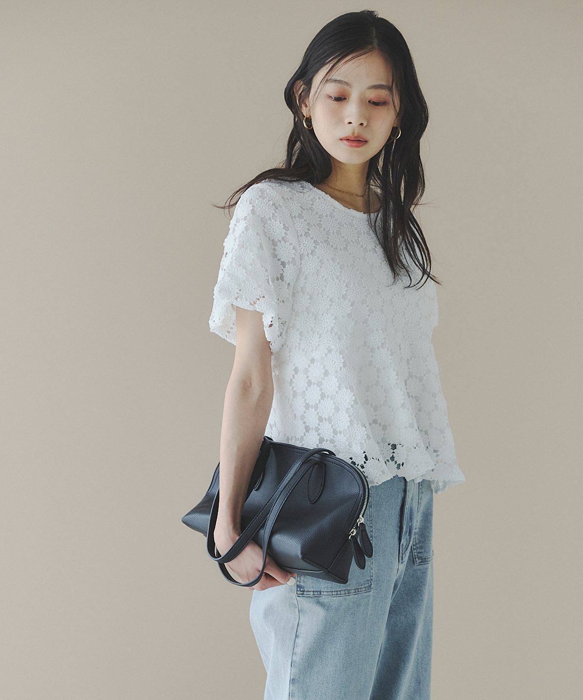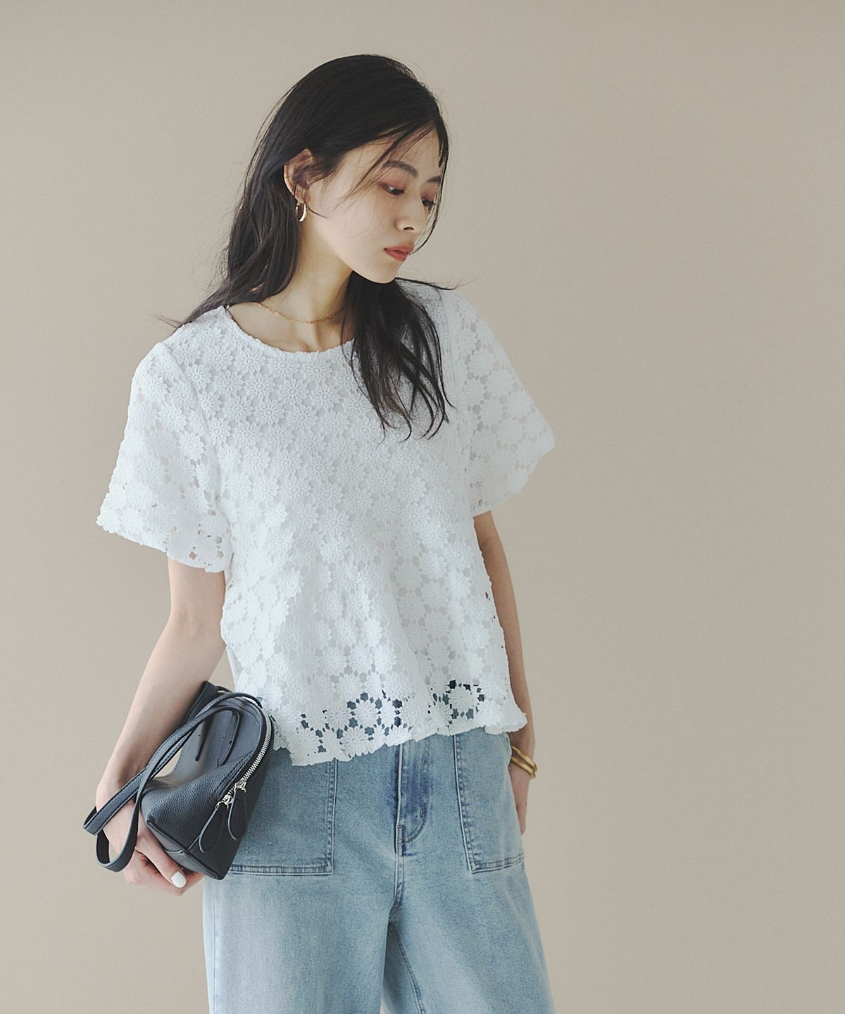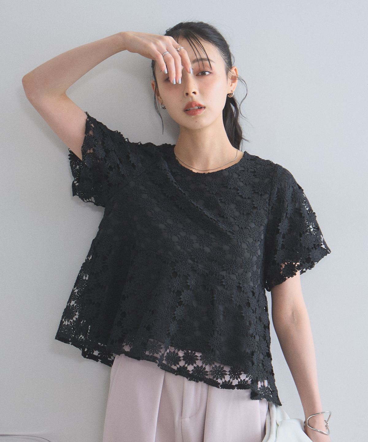 繊細な花柄レースを贅沢に使用し、着るだけで顔周りを華やかに彩ります。