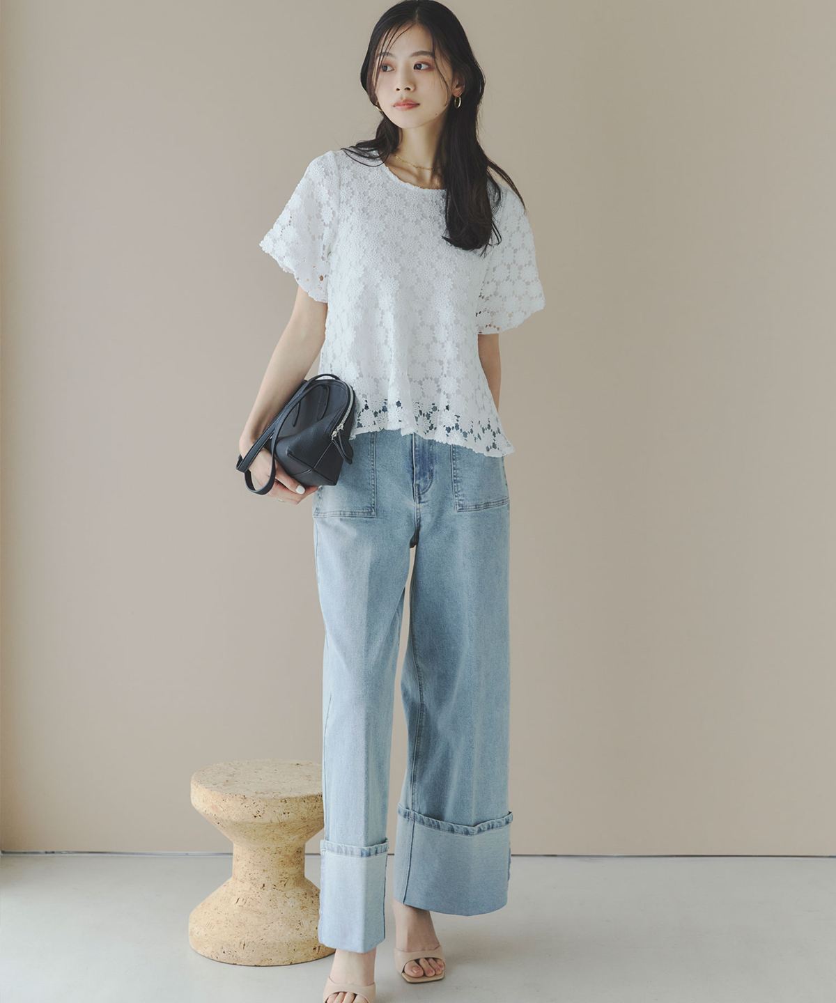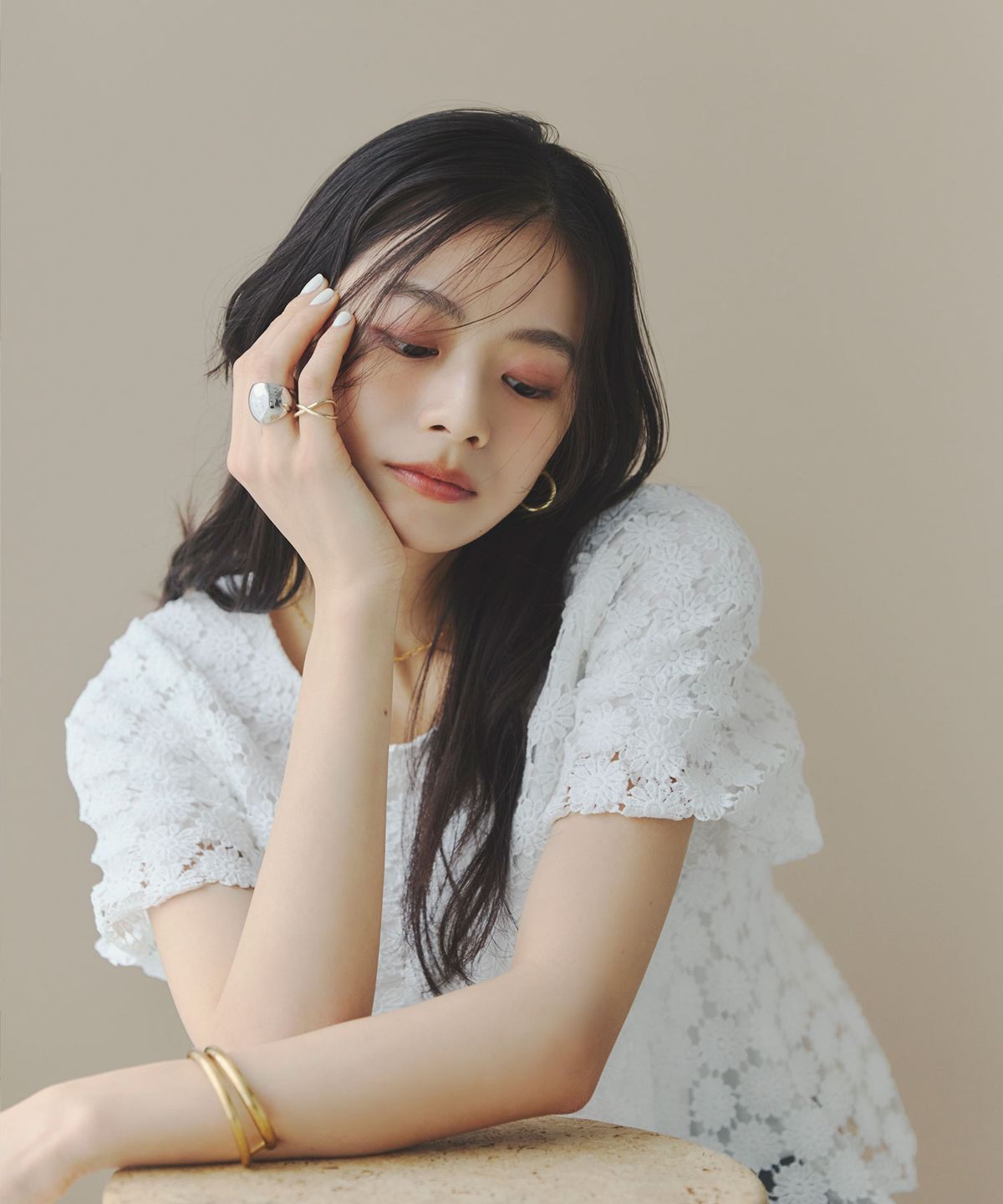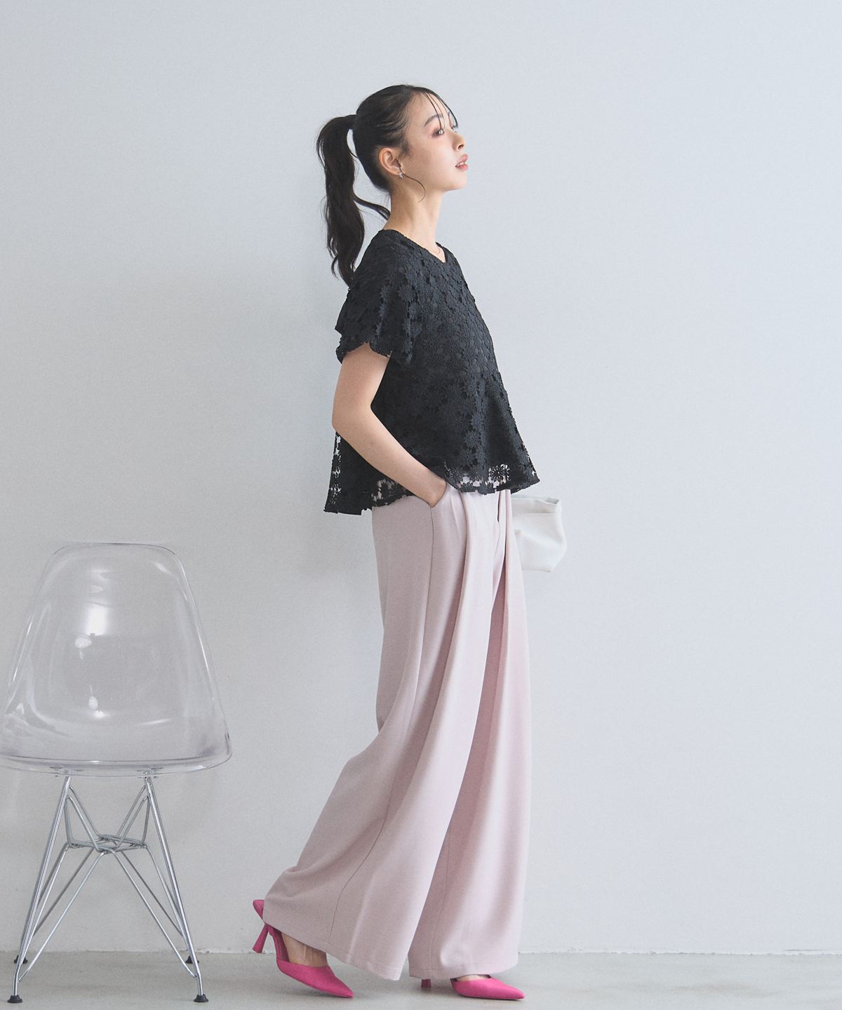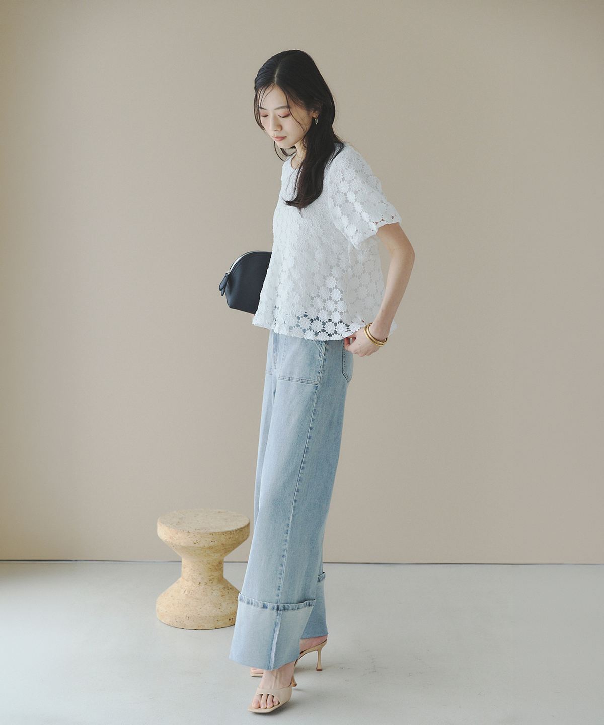 繊細な花柄レースを贅沢に使用し、着るだけで顔周りを華やかに彩ります。