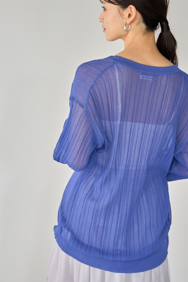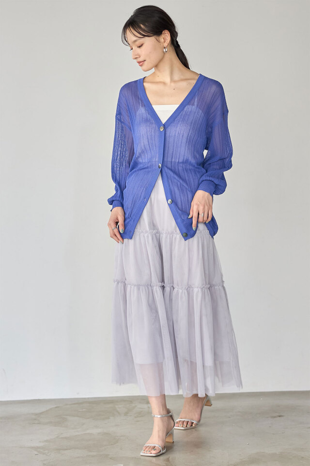 太もも辺りまでカバーしてくれる絶妙なロング丈だから、腰回りをすっぽりカバーしてくれるカーディガン。シアー素材だから重くなりすぎず、ロング丈でも軽やかに着て頂けます!