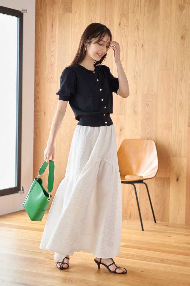 ストレッチが効いていて着心地が良く、軽量で持ち運びにも便利なカーディガン。ショルダー部分には細かくギャザーを入れ上品さをアピールし、コンパクトシルエットで華奢見え効果を発揮◎