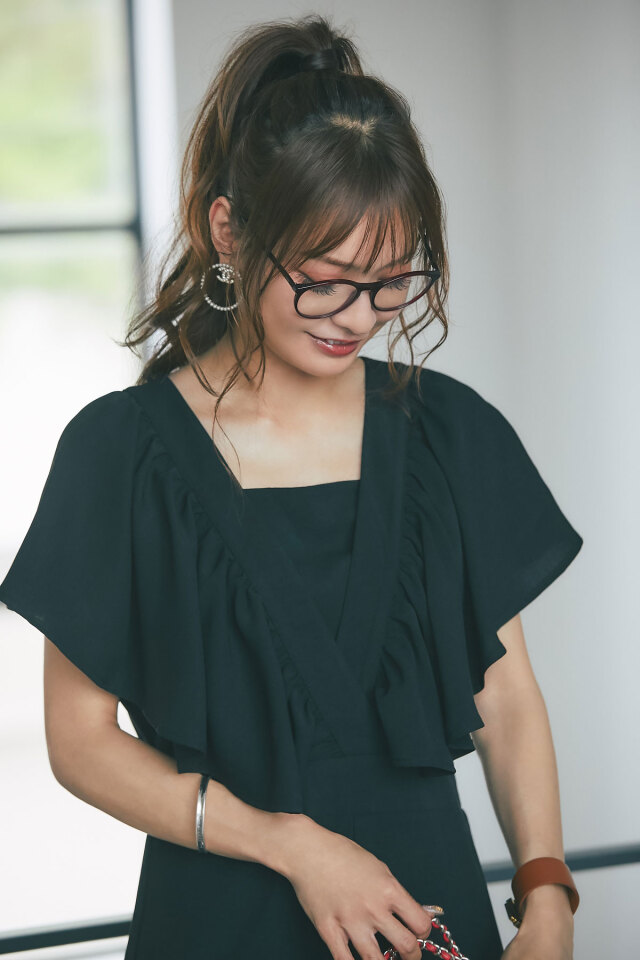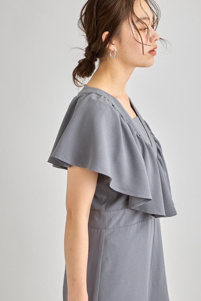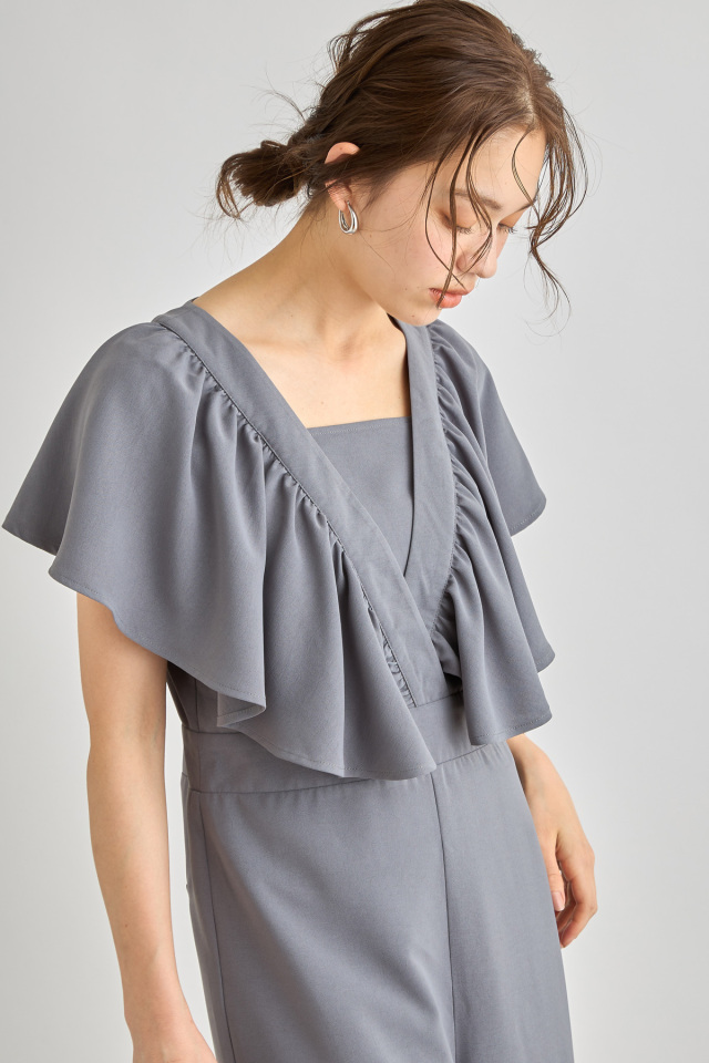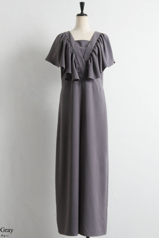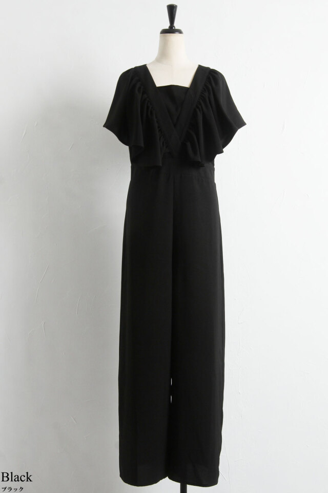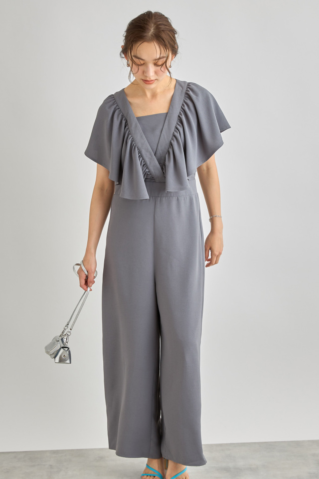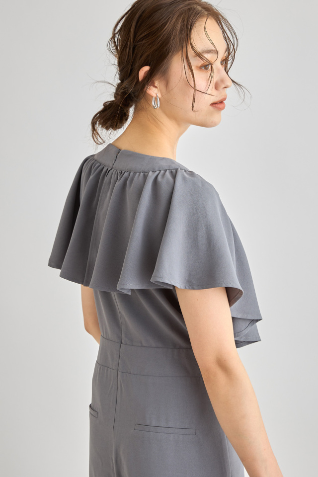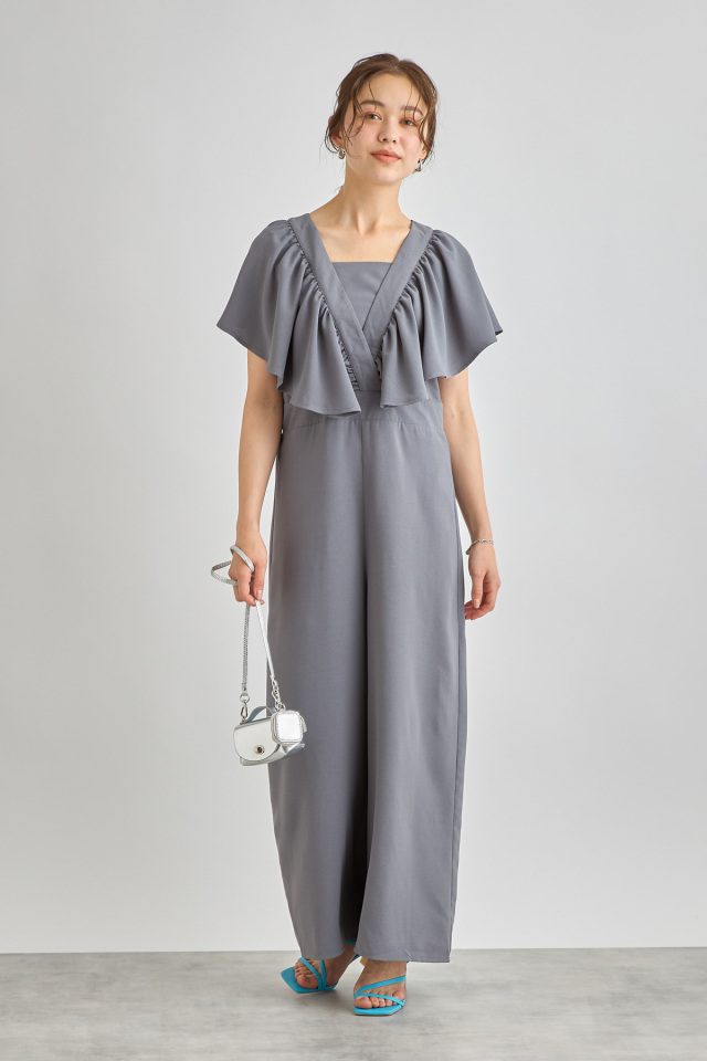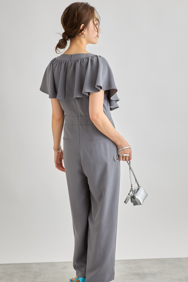 リネン見えするシワになりにくいポリエステル100%生地を使用したこれからの季節に嬉しいロンパース。大ぶりのラッフルデザインが上半身の華奢見えを叶えてくれる着映えアイテム。