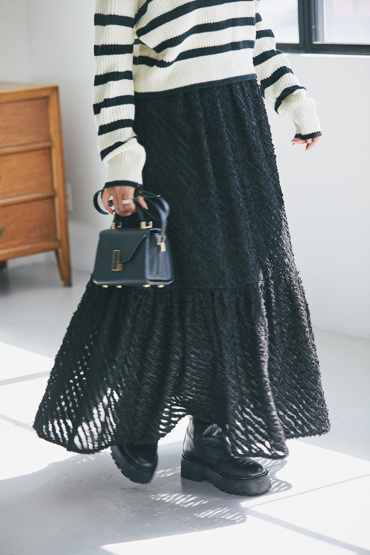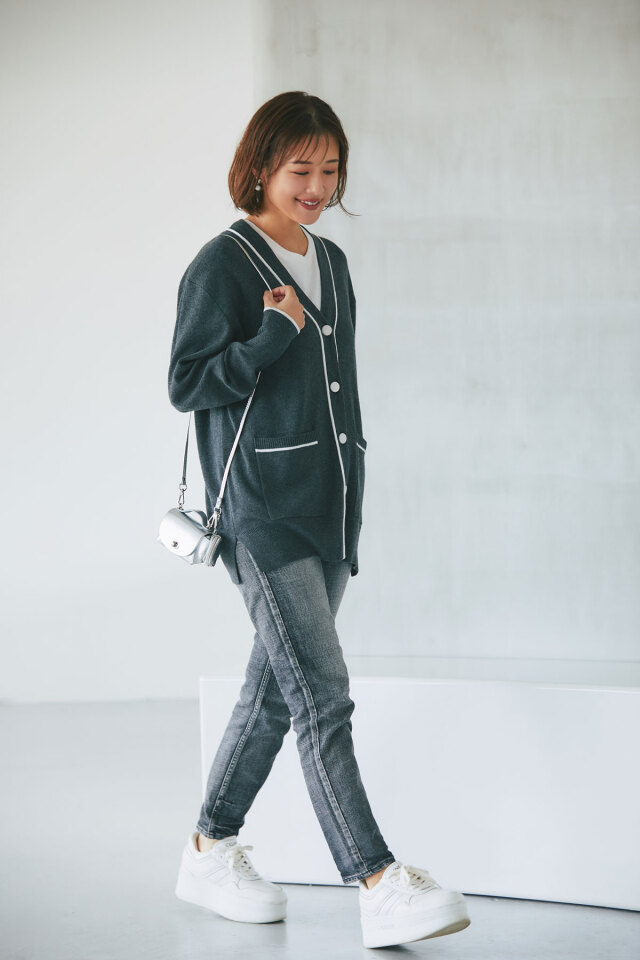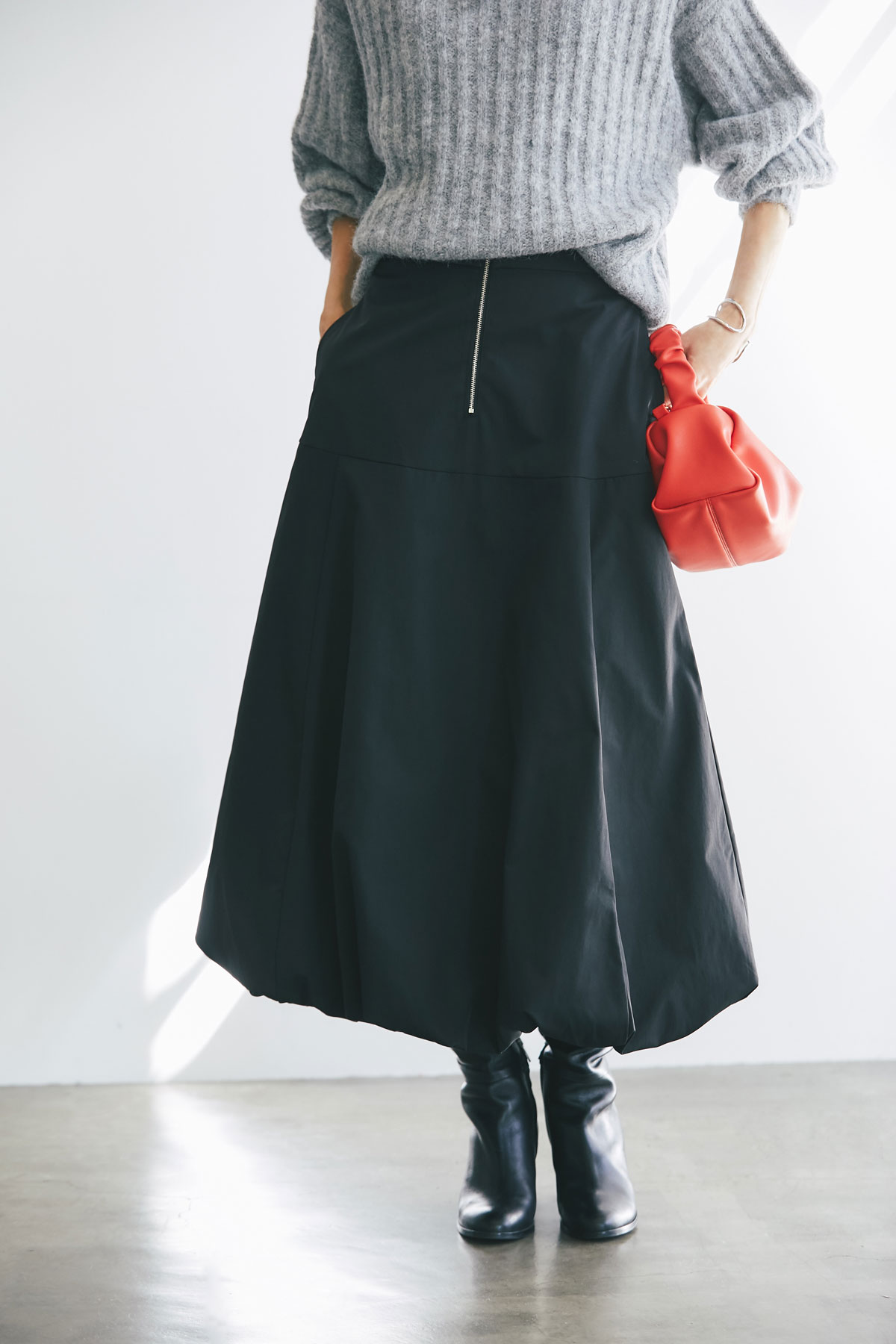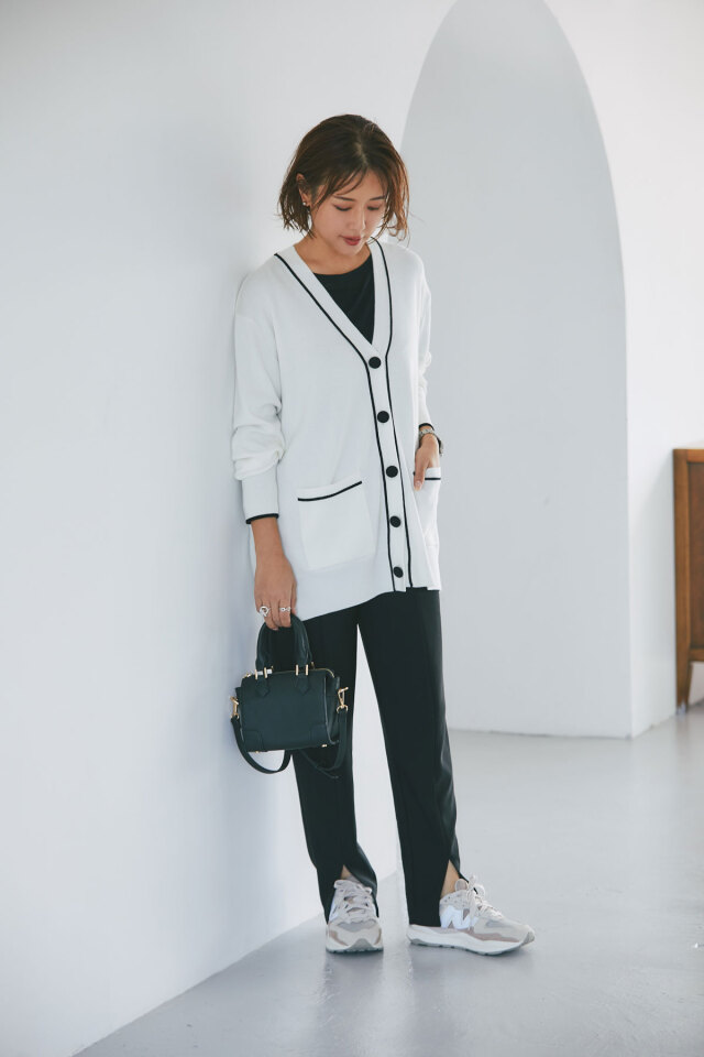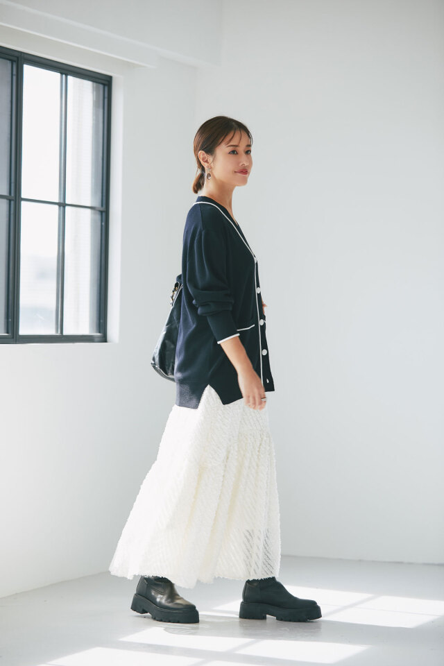 パンツにもスカートにも合わせやすいミドル丈のデザインで、