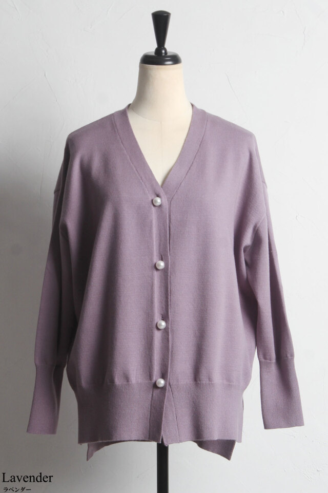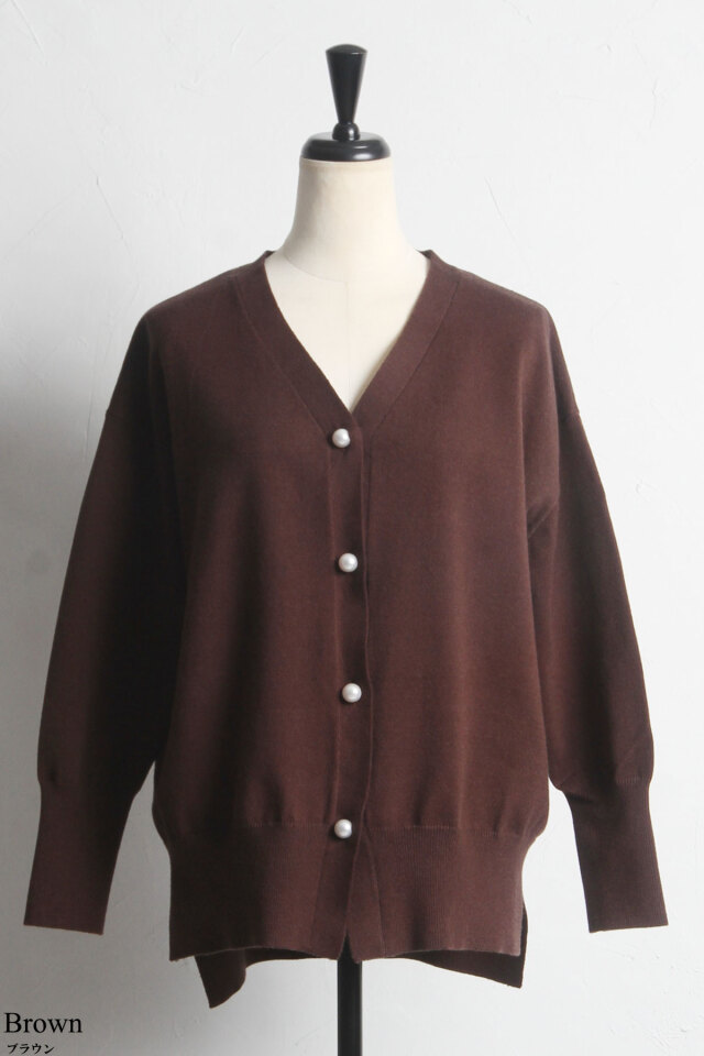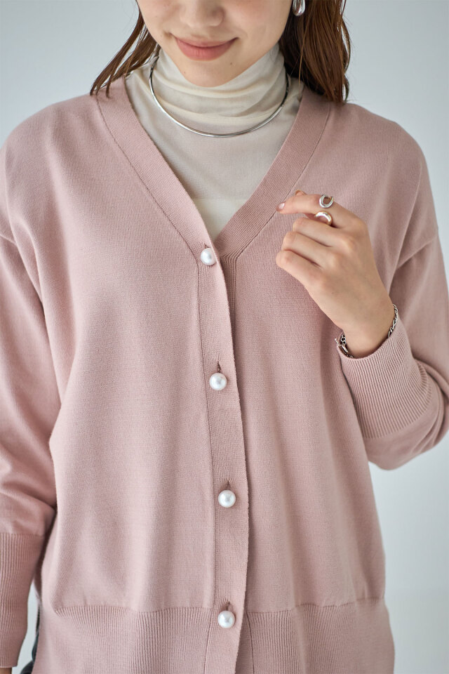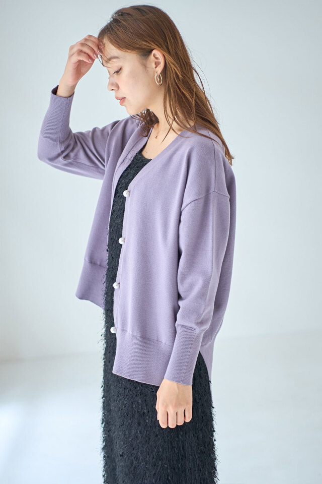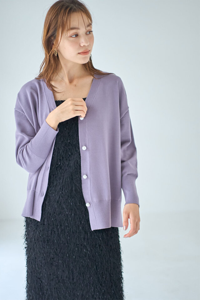 品よくこなれ感のあるスタイリングに仕上がるパールボタンVネックカーディガン