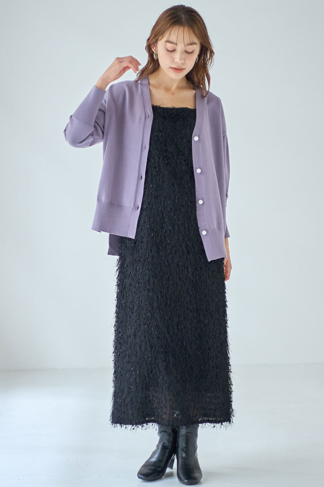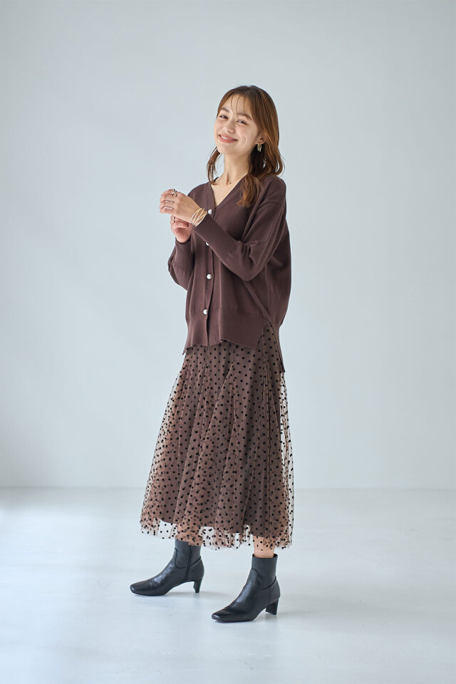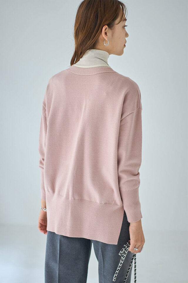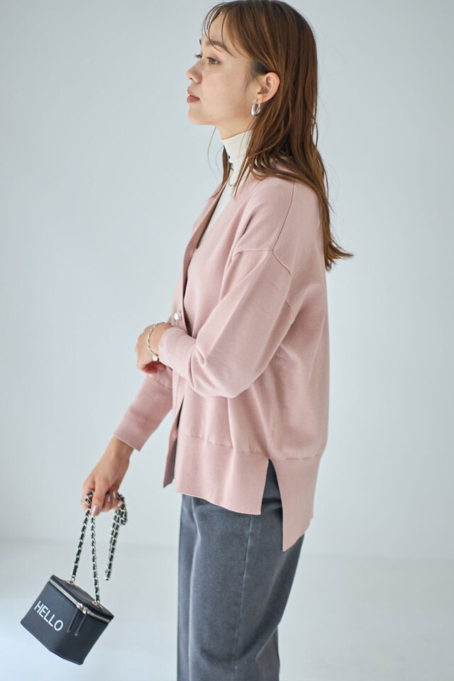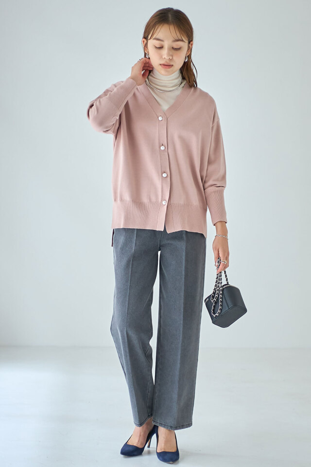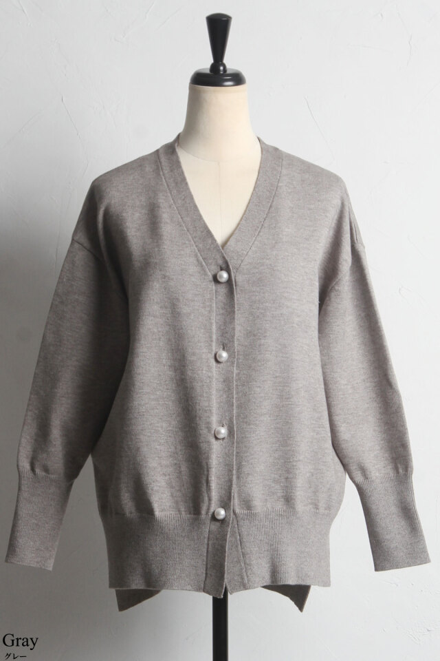 品よくこなれ感のあるスタイリングに仕上がるパールボタンVネックカーディガン