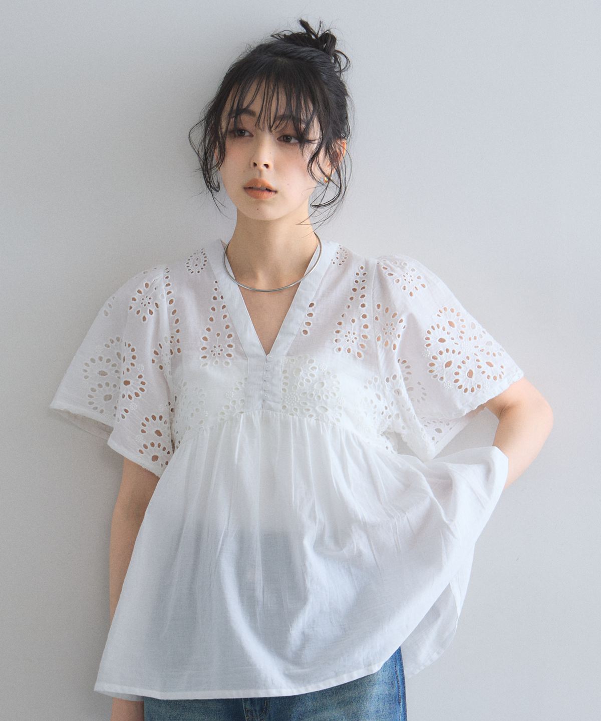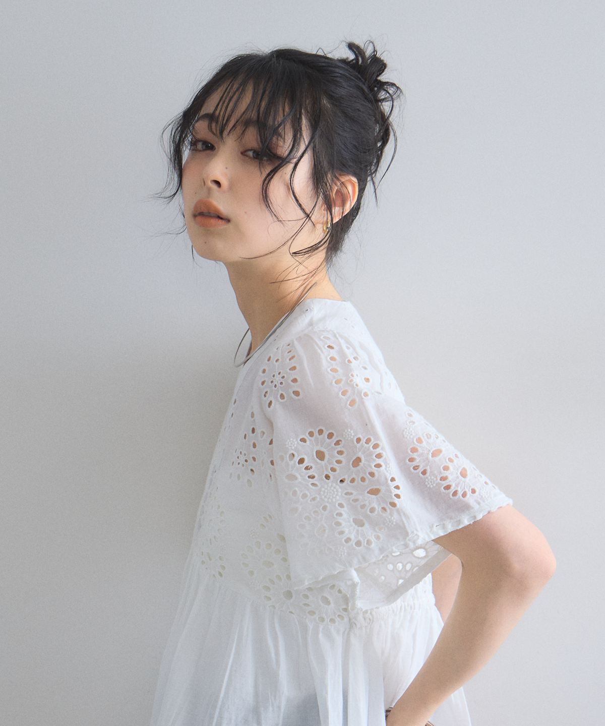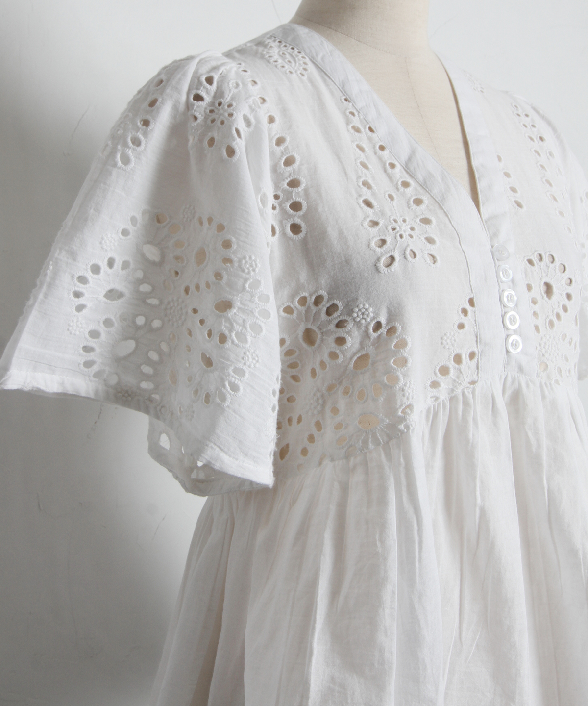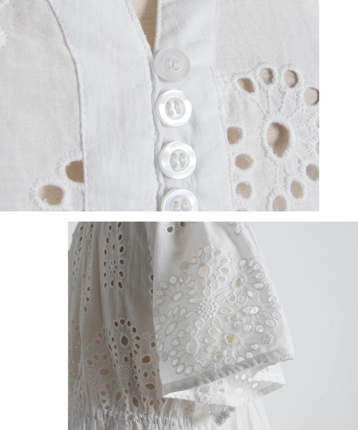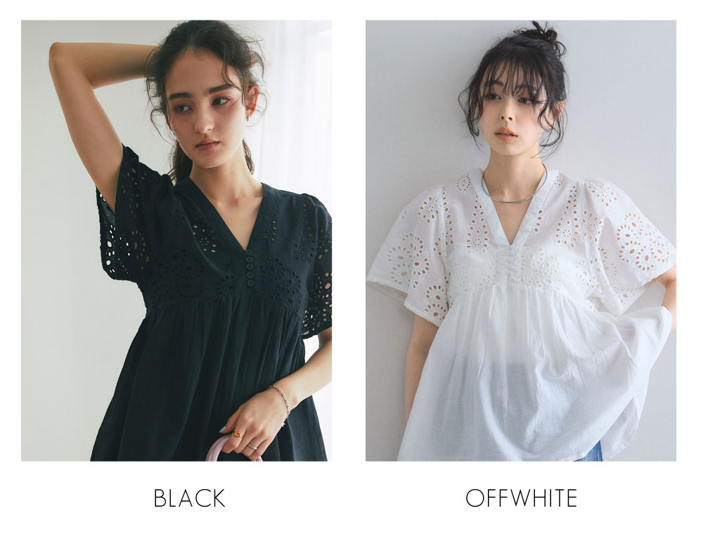 袖やバストラインに施されたアイレットレースが、涼しげな抜け感とフェミニンさを演出します。