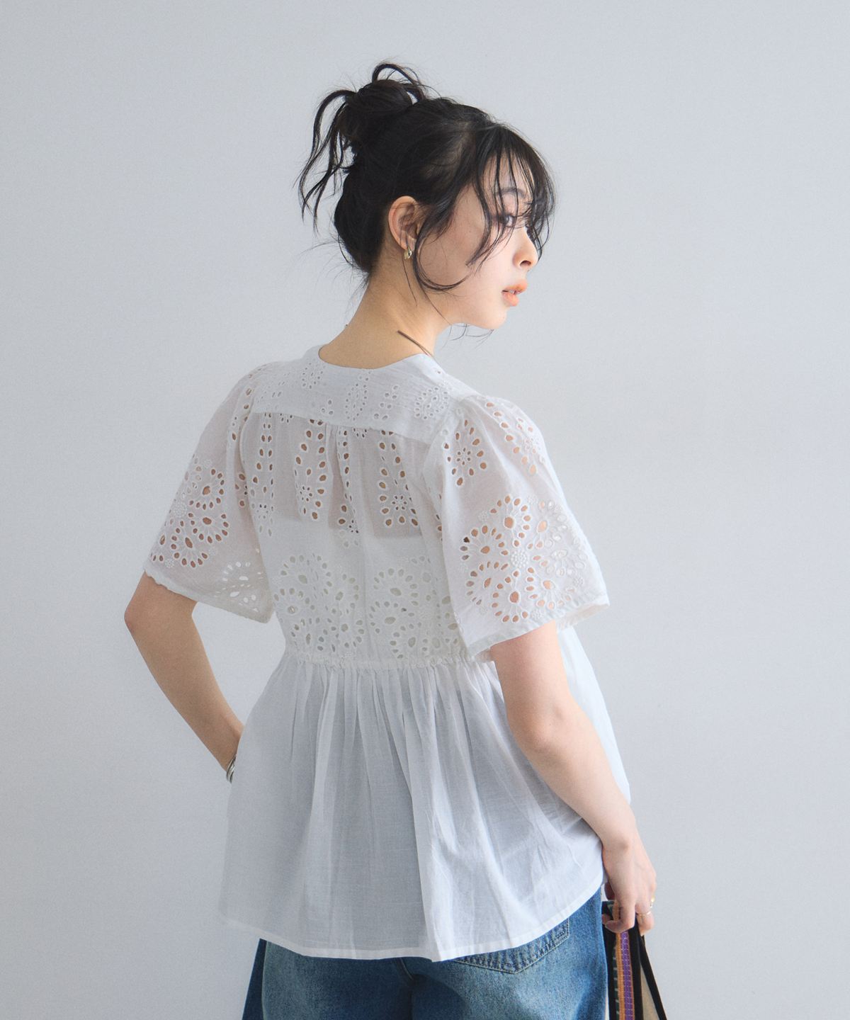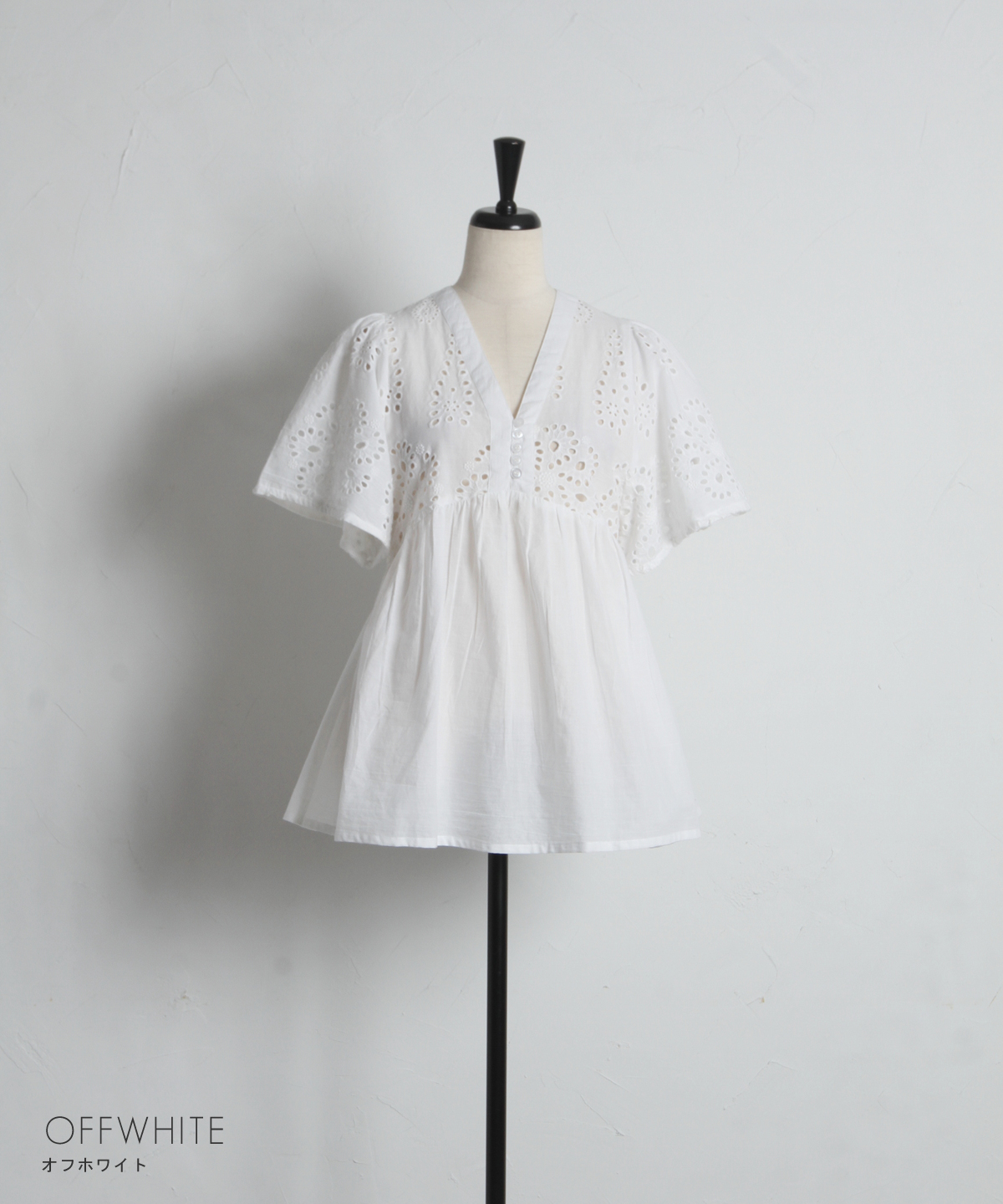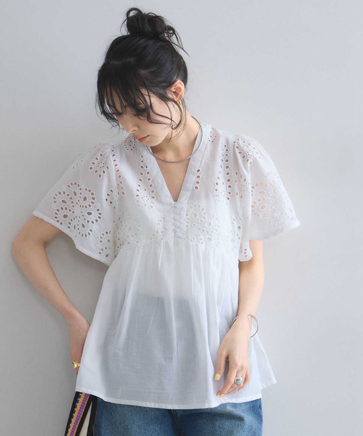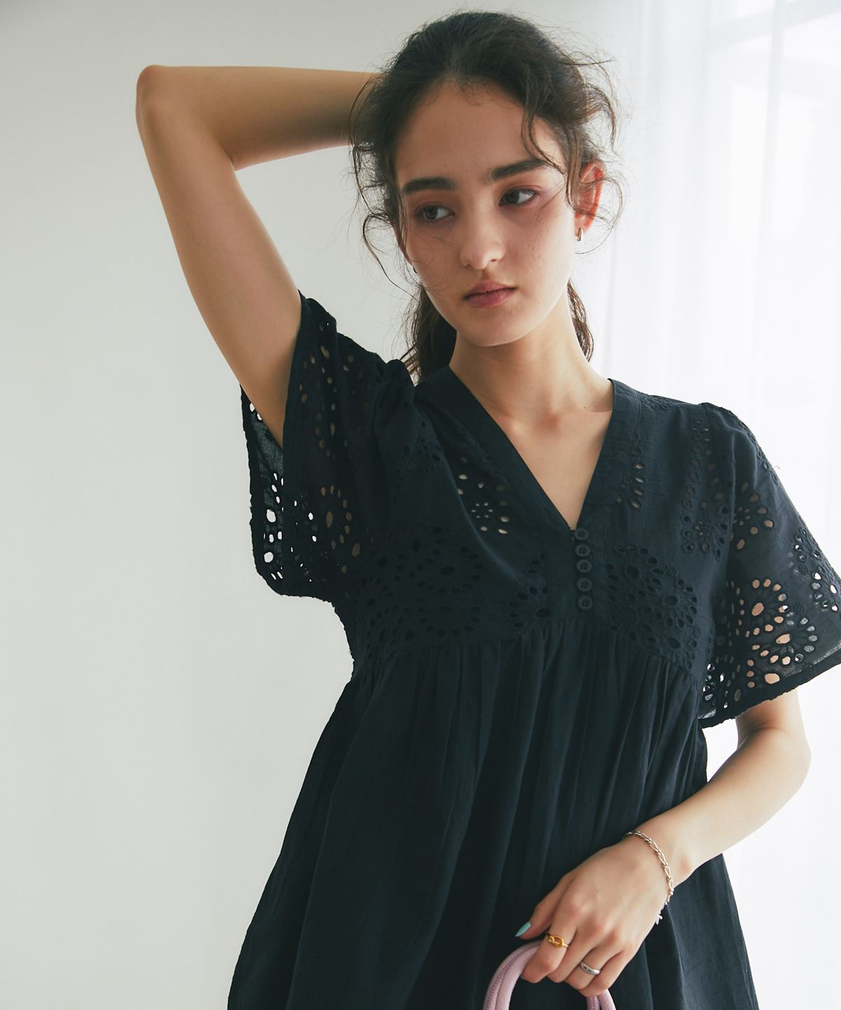 袖やバストラインに施されたアイレットレースが、涼しげな抜け感とフェミニンさを演出します。