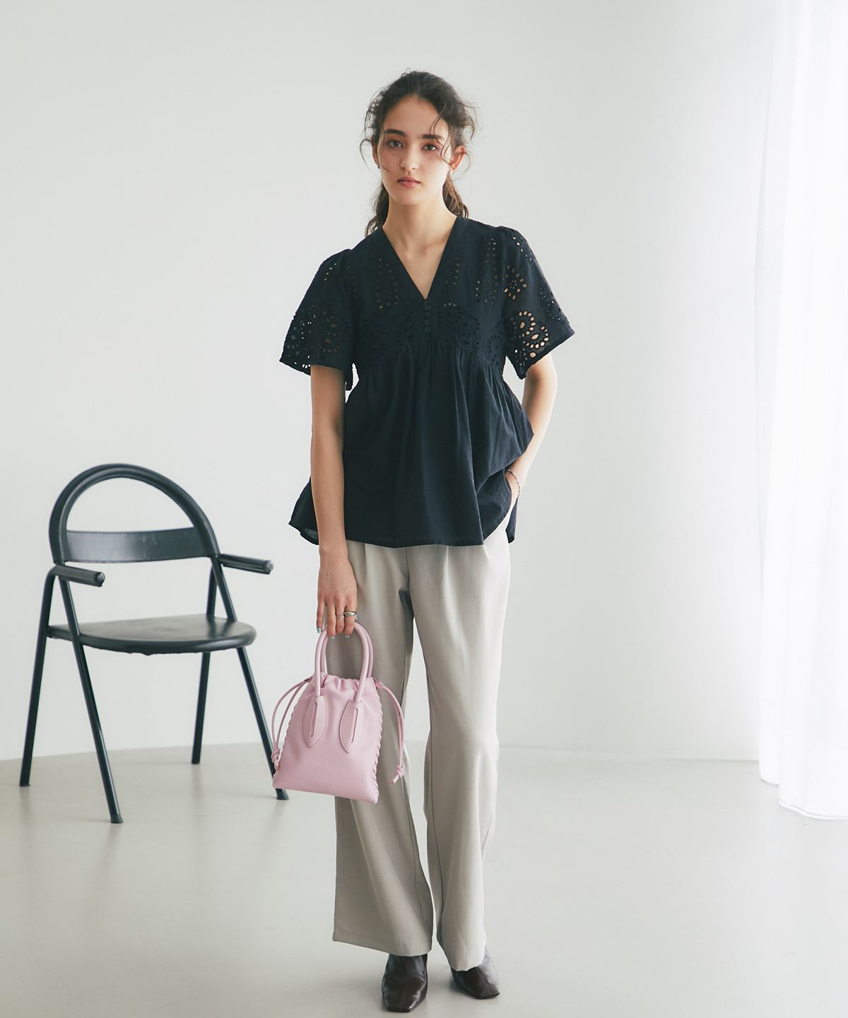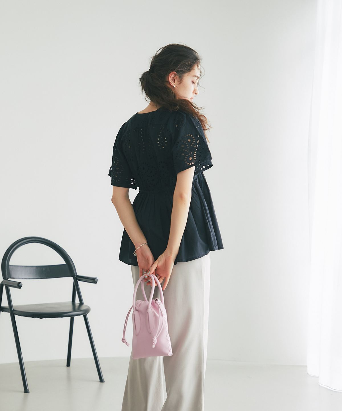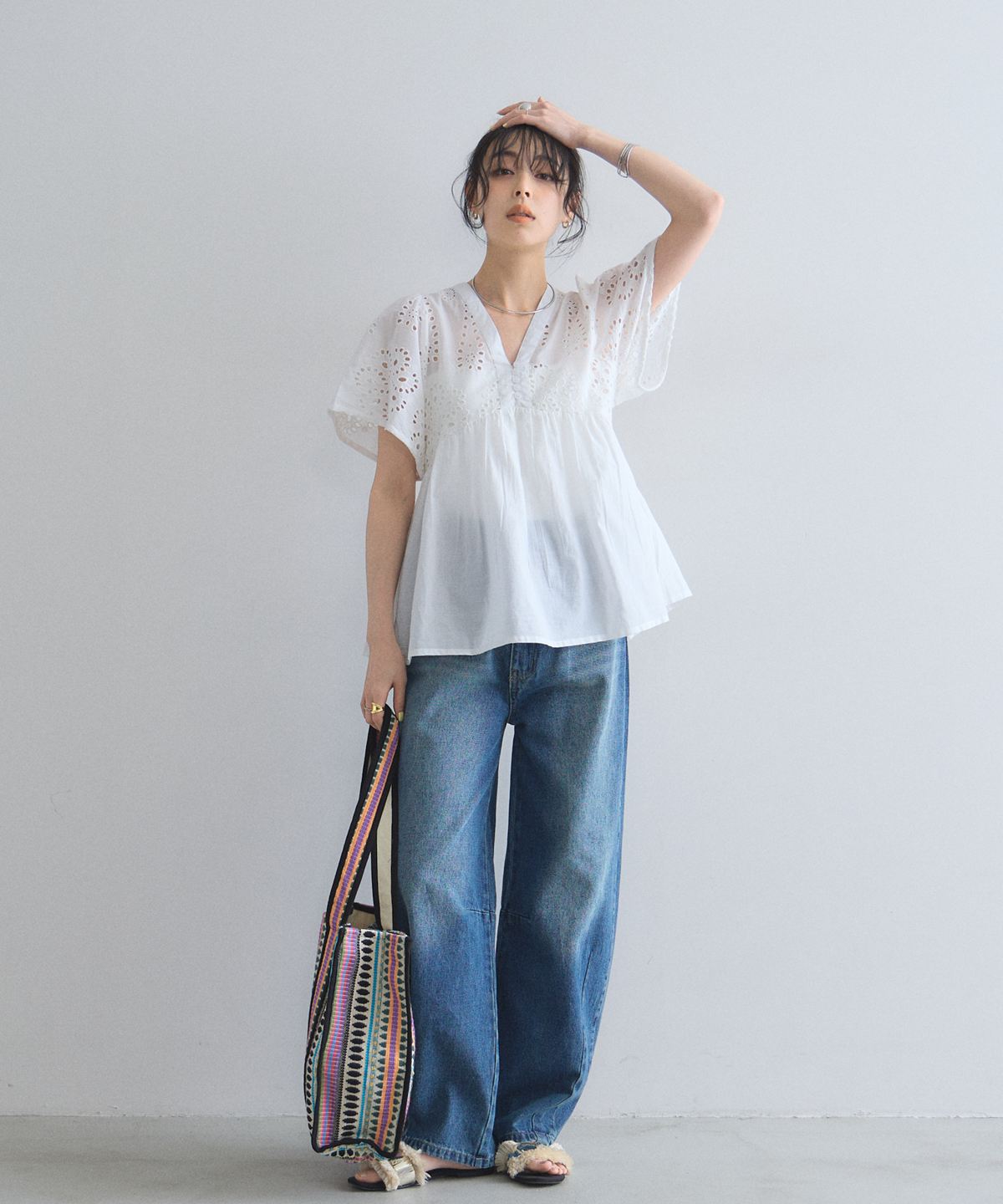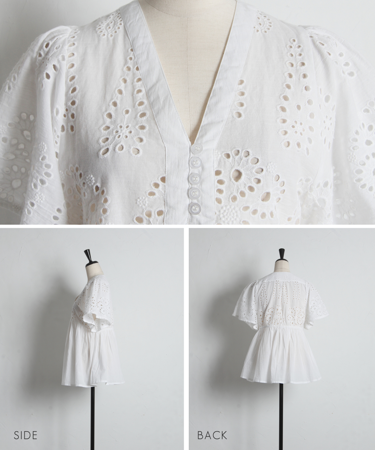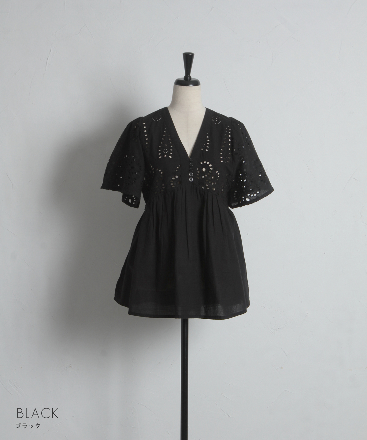 袖やバストラインに施されたアイレットレースが、涼しげな抜け感とフェミニンさを演出します。