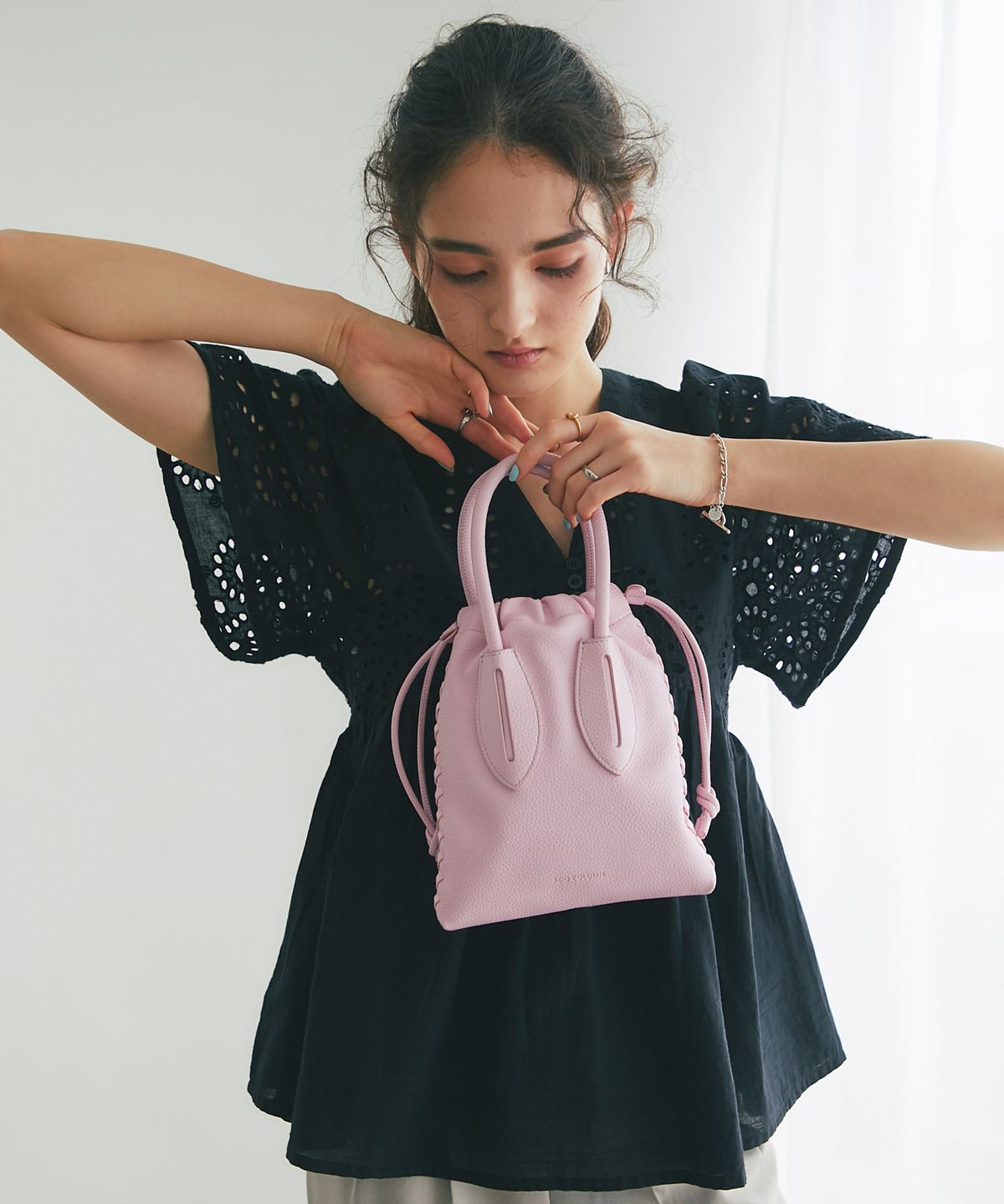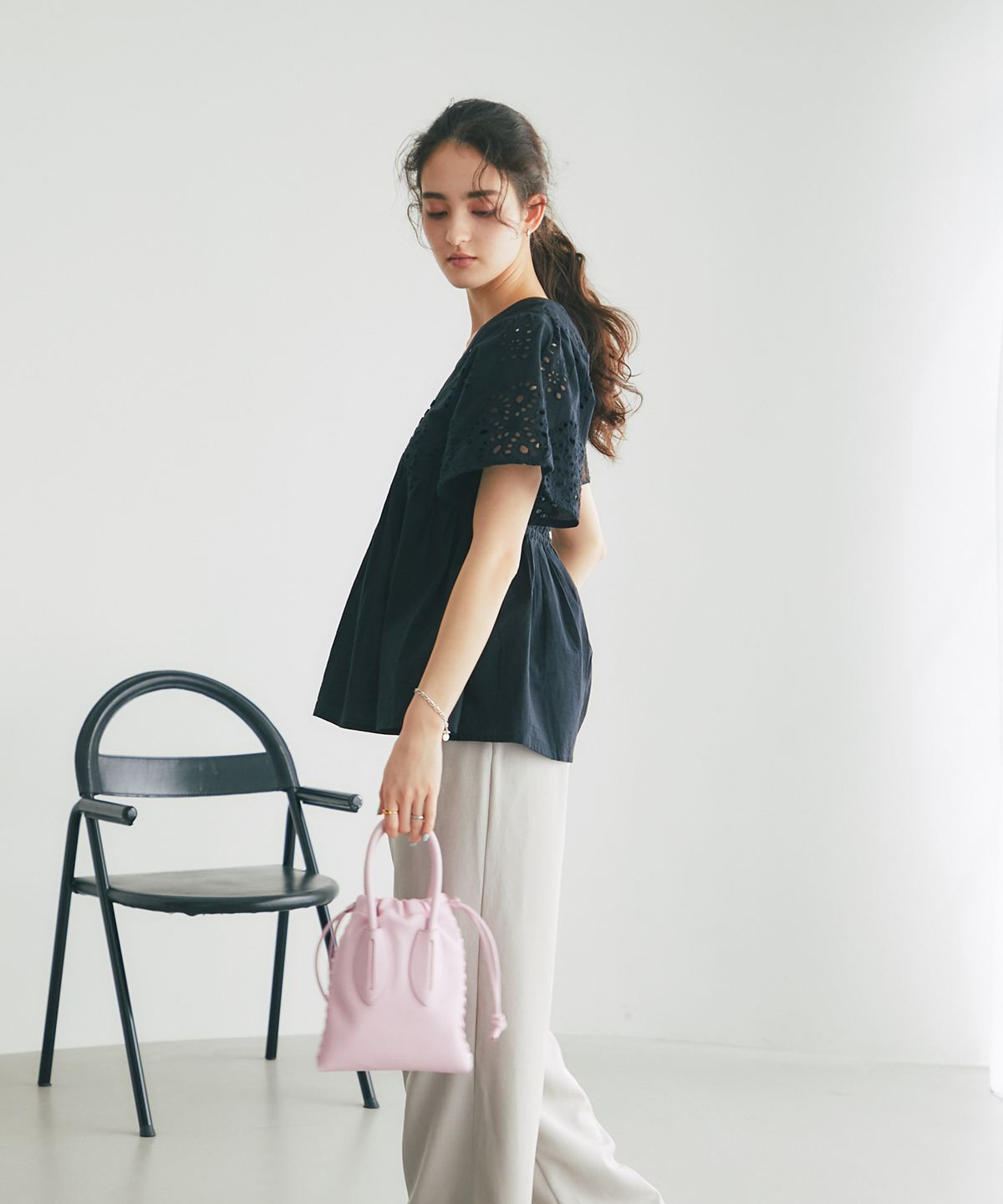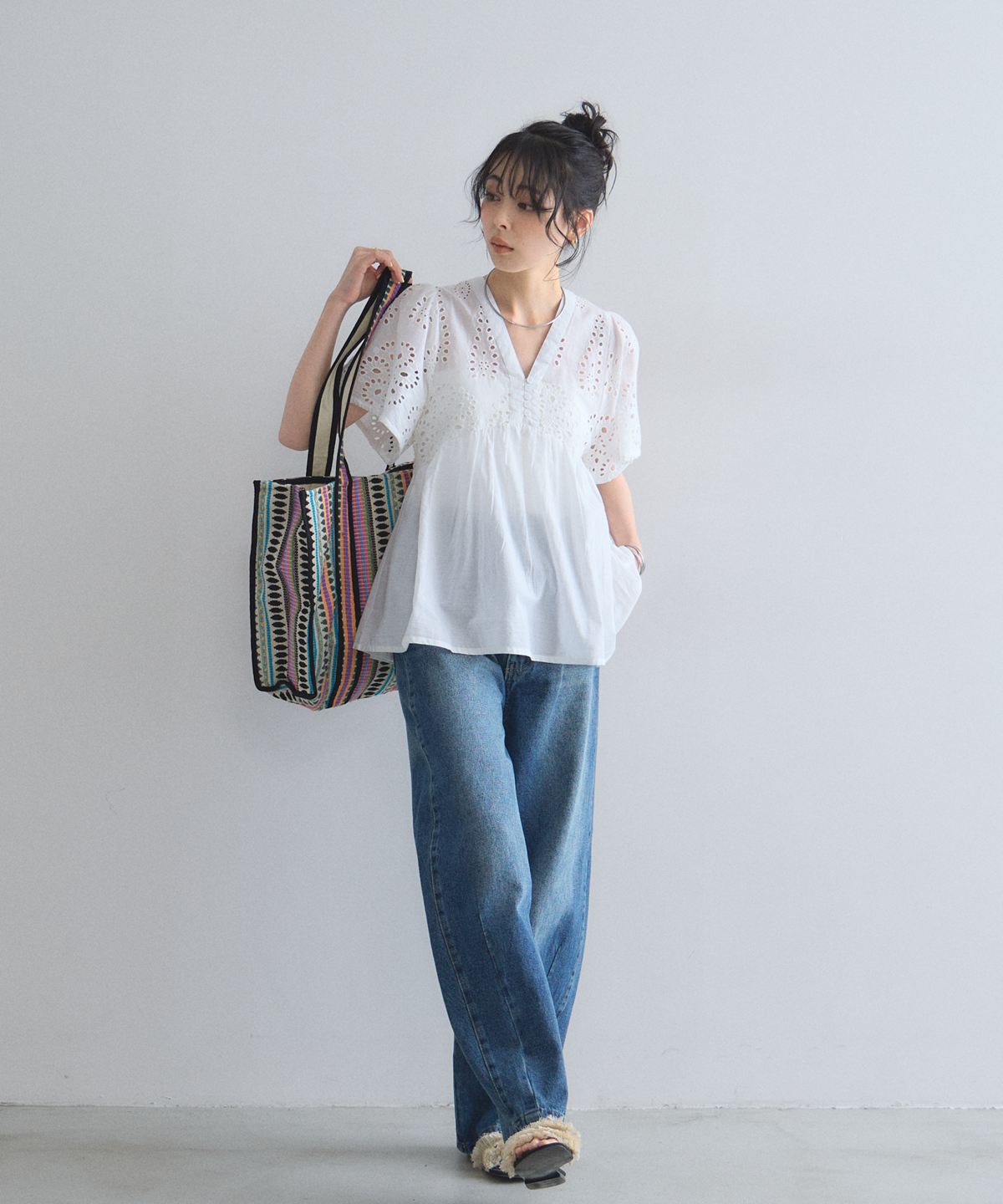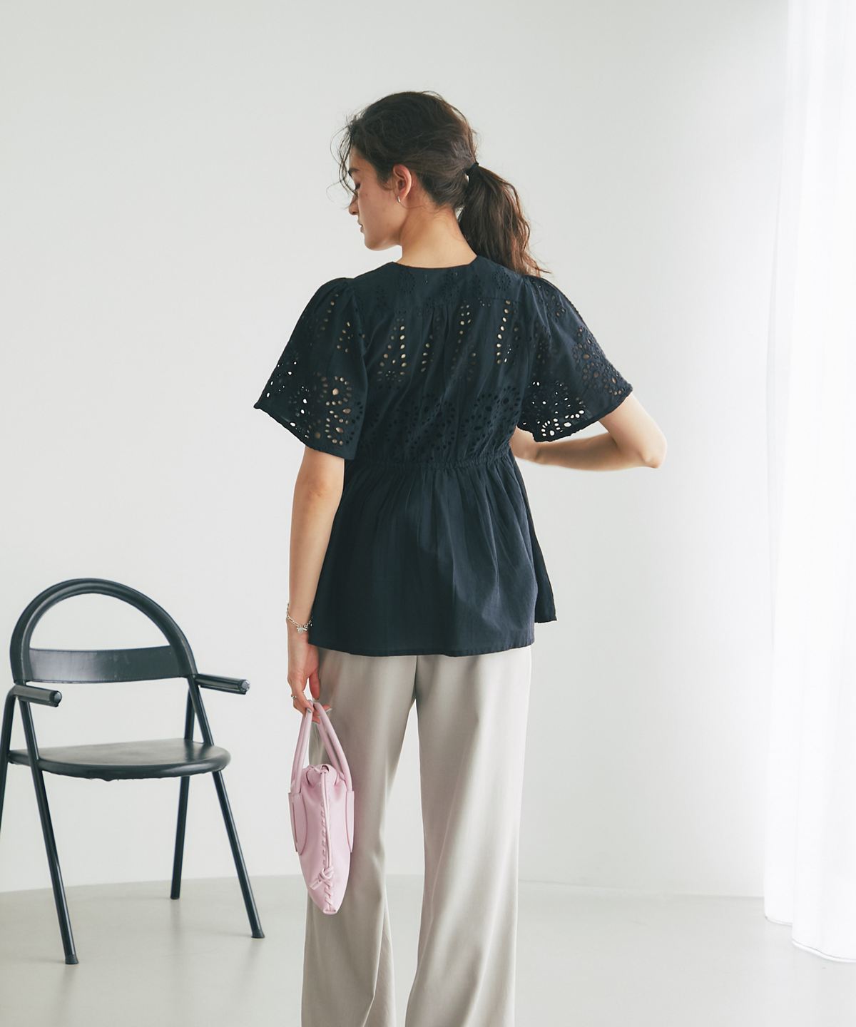 袖やバストラインに施されたアイレットレースが、涼しげな抜け感とフェミニンさを演出します。