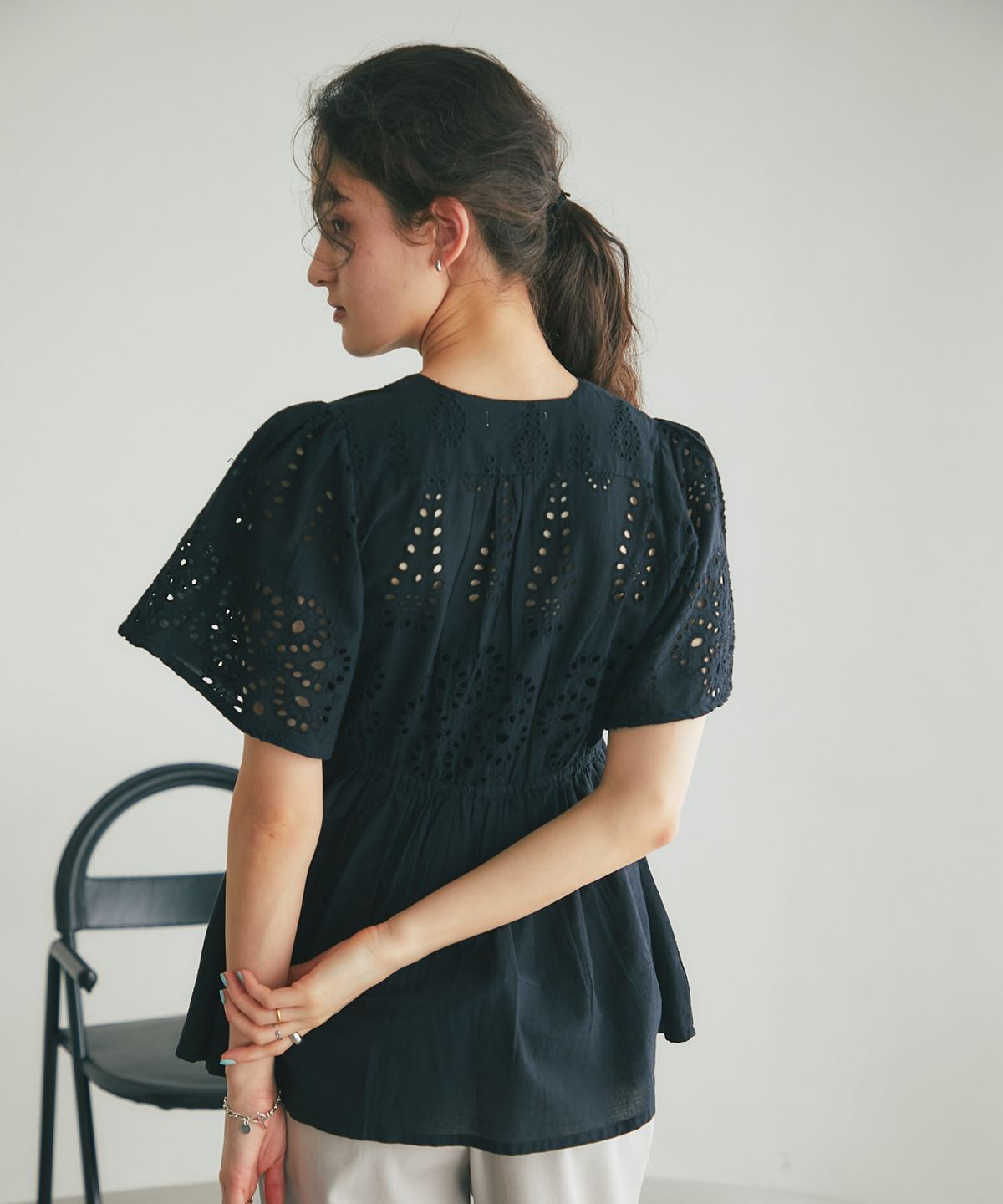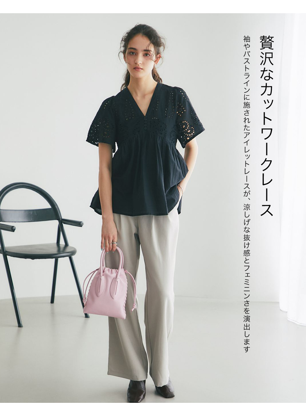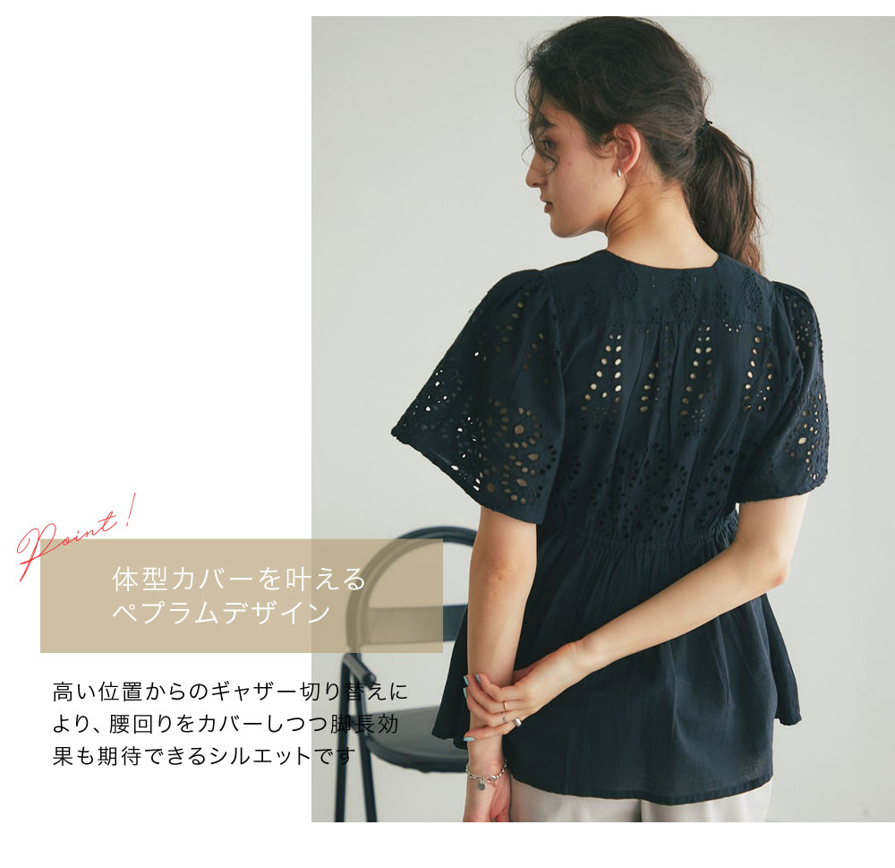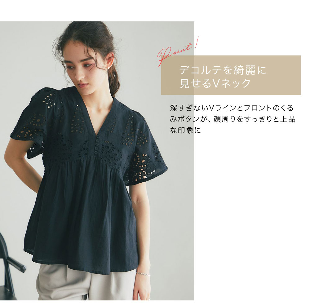 繊細なコットンレースとふんわりとしたシルエットが、大人の日常を華やかに彩るブラウスです。