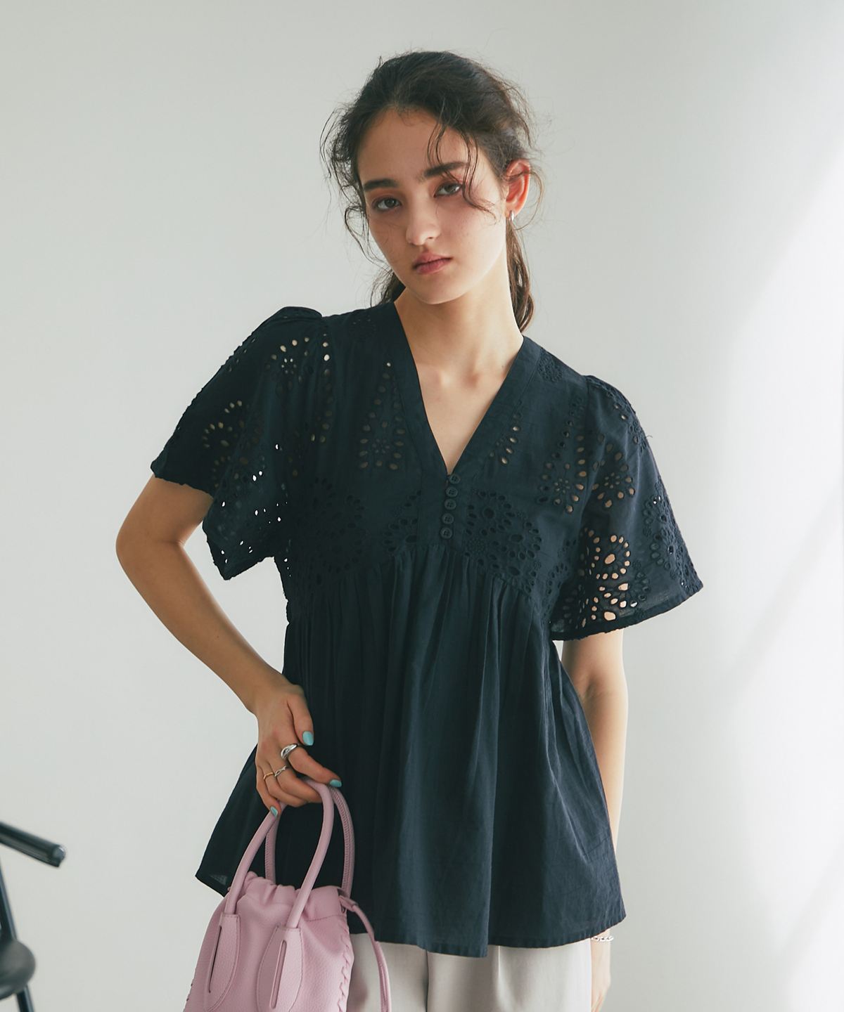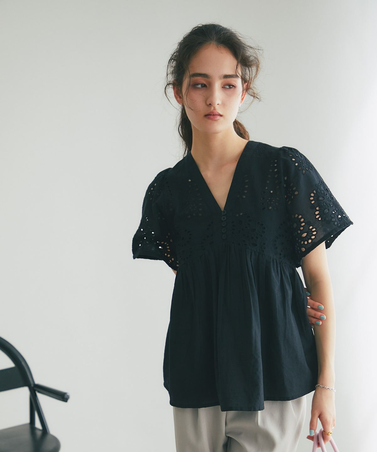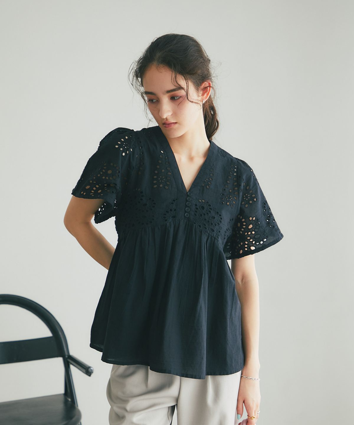 繊細なコットンレースとふんわりとしたシルエットが、大人の日常を華やかに彩るブラウスです。