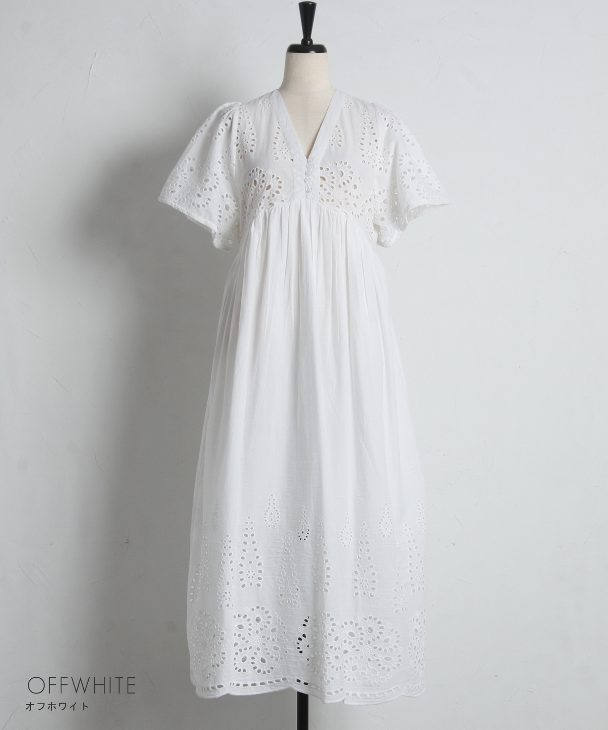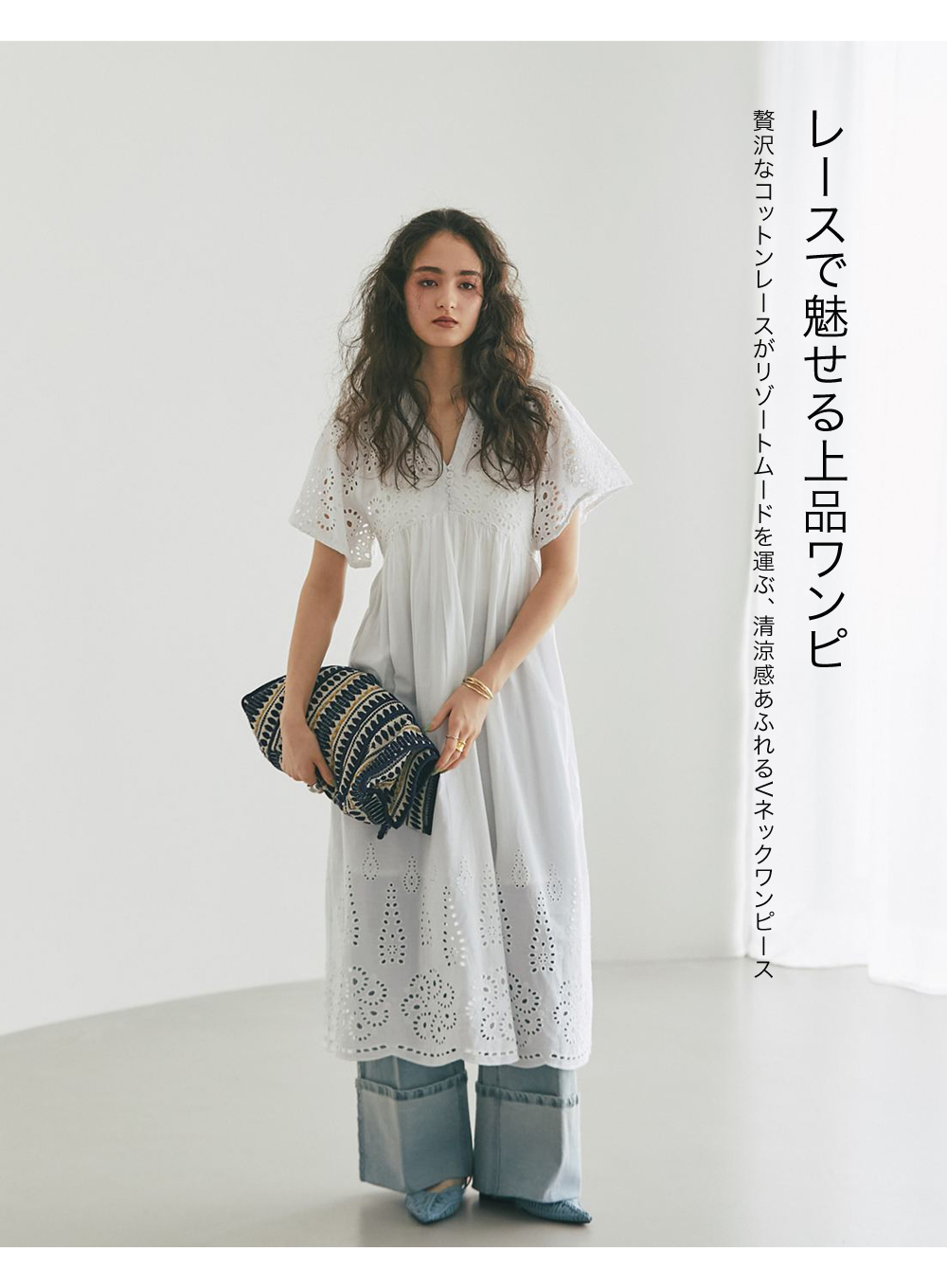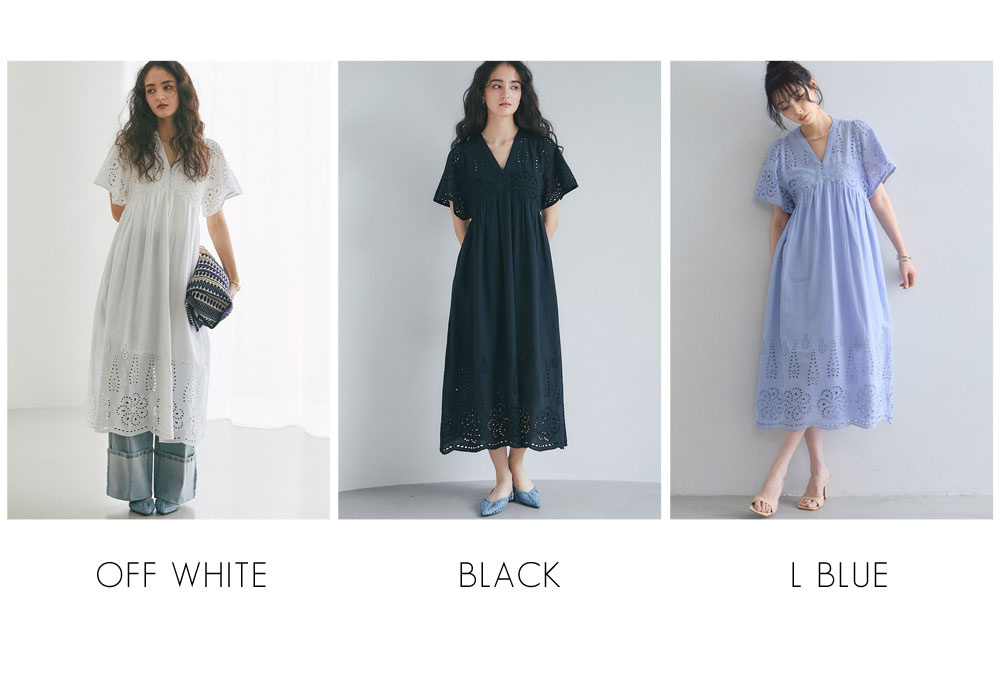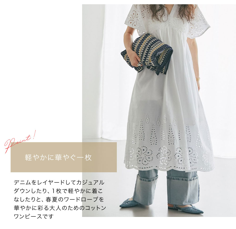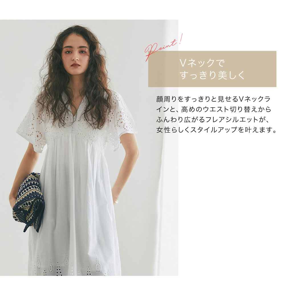 贅沢なコットンレースがリゾートムードを運ぶ、清涼感あふれるVネックワンピース。