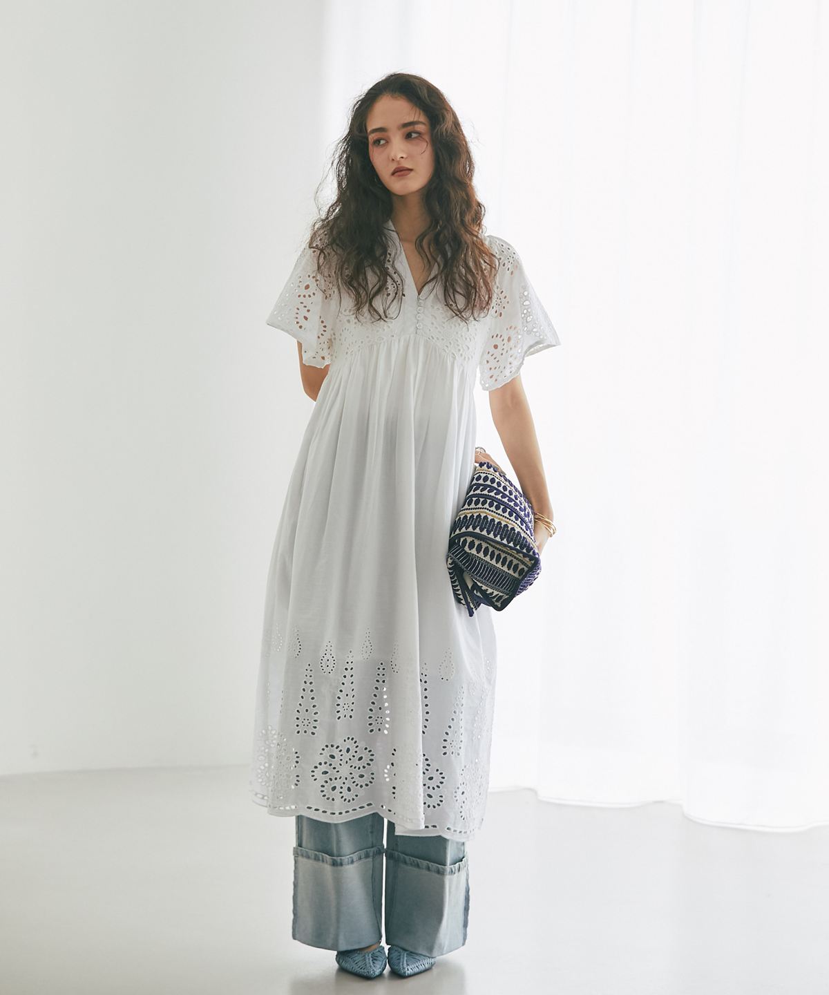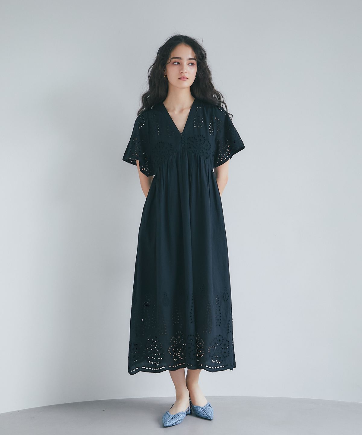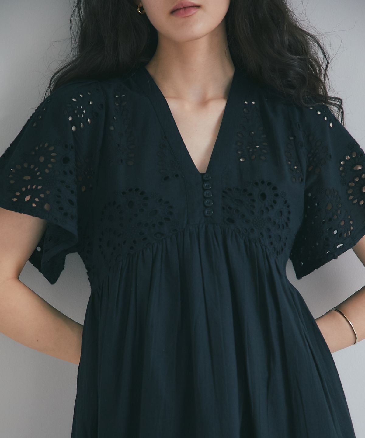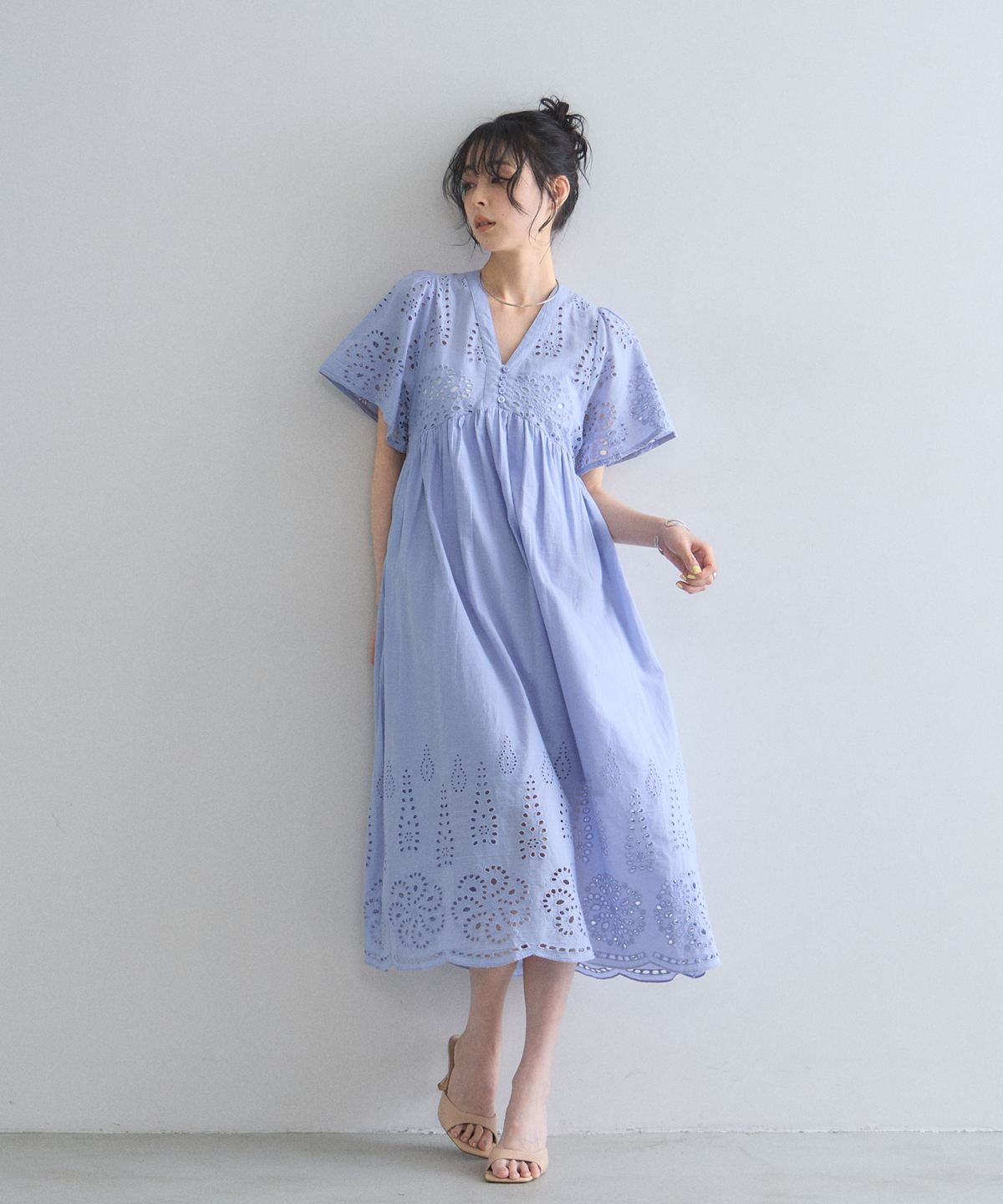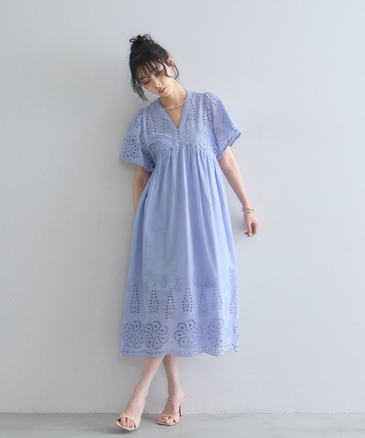贅沢なコットンレースがリゾートムードを運ぶ、清涼感あふれるVネックワンピース。
