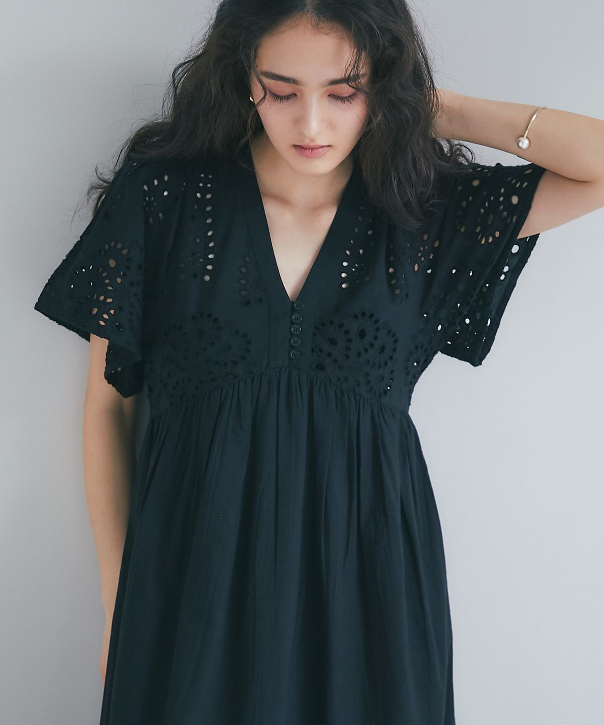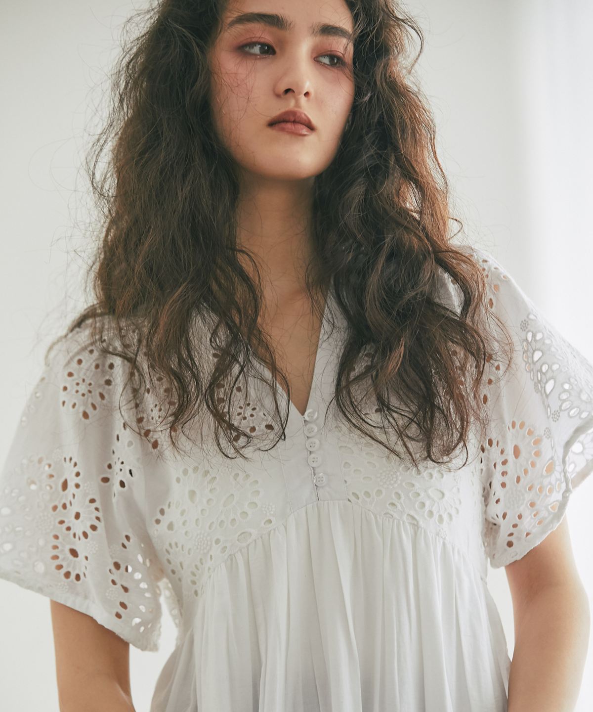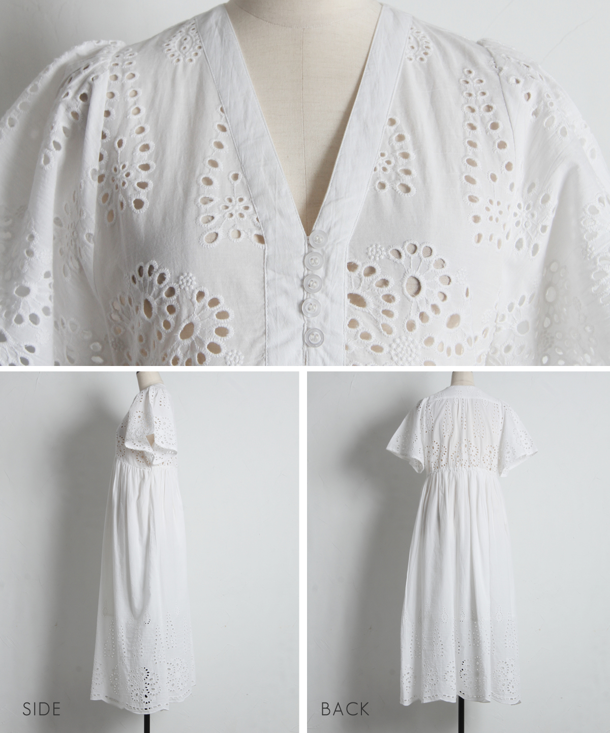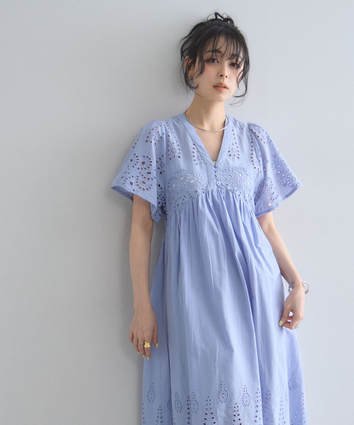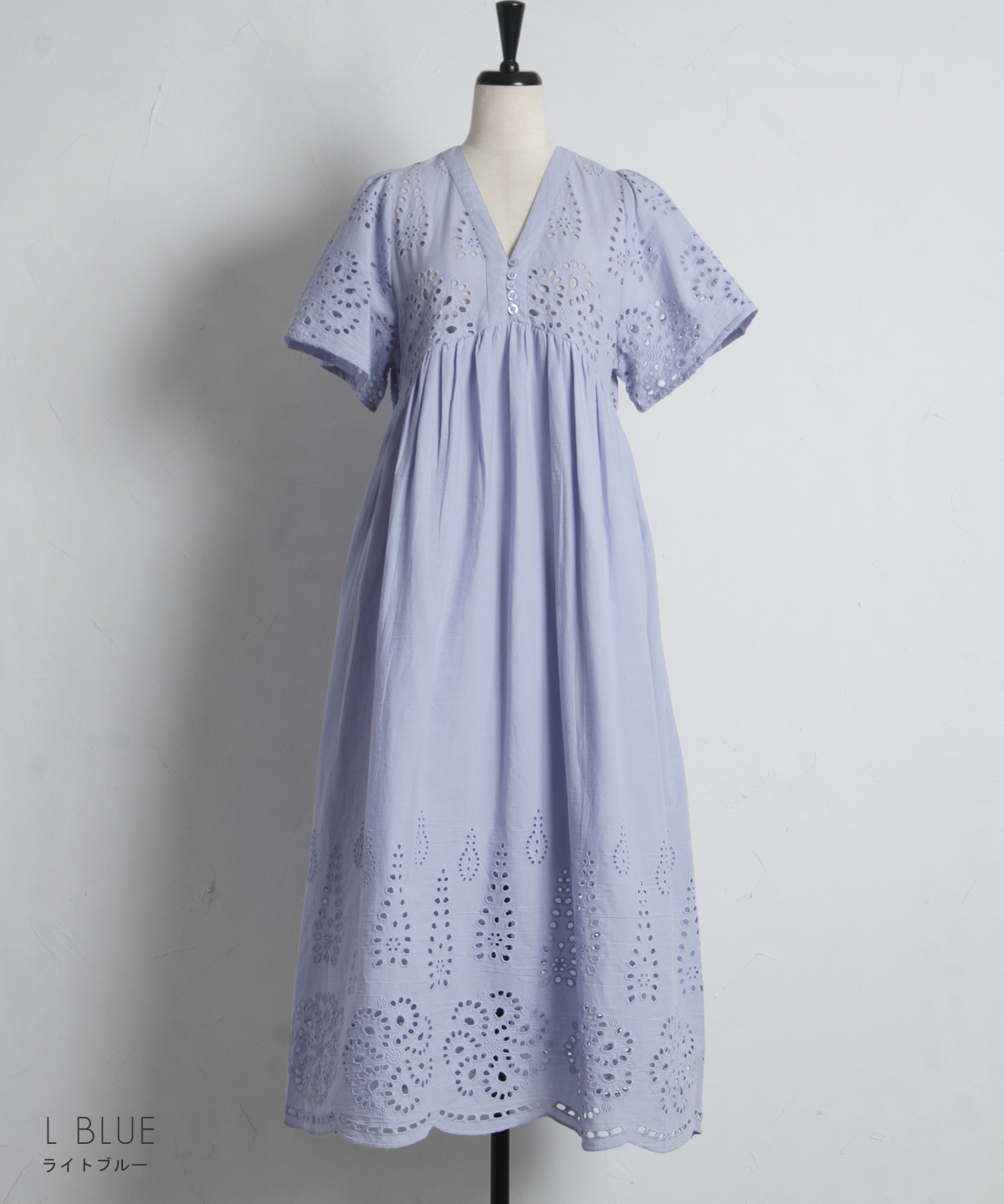 贅沢なコットンレースがリゾートムードを運ぶ、清涼感あふれるVネックワンピース。