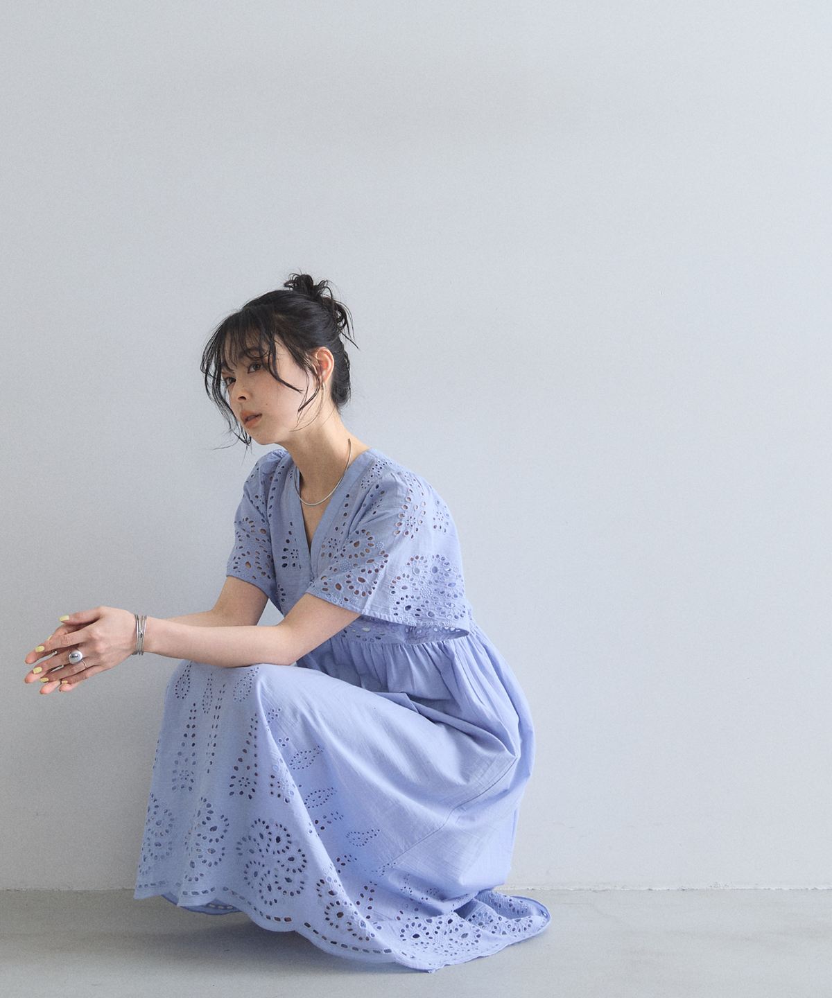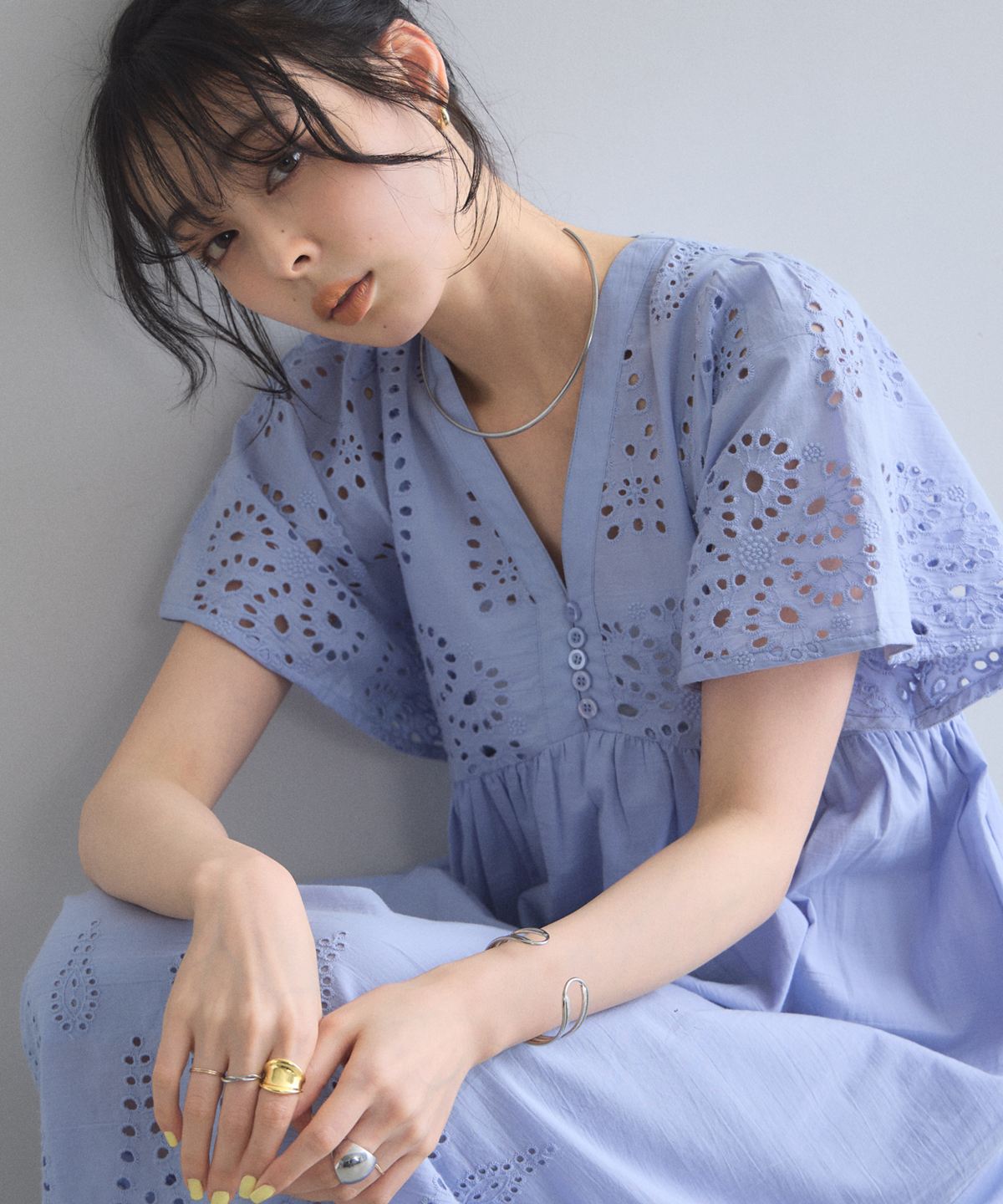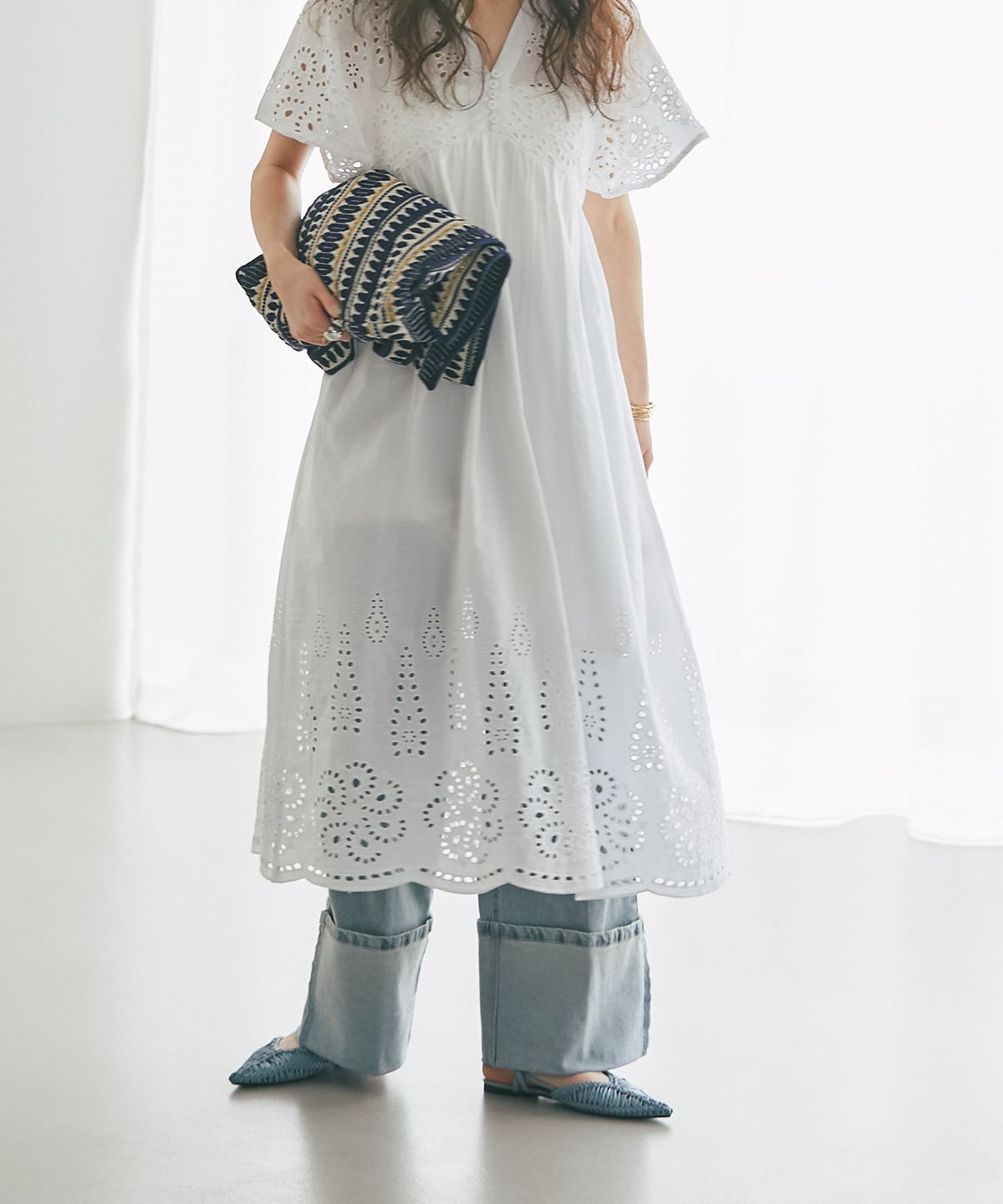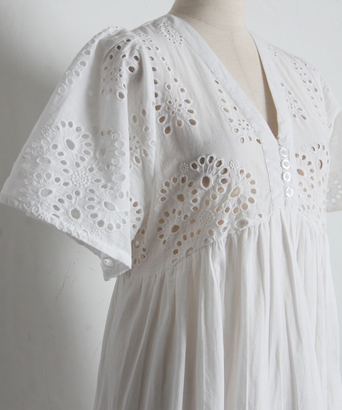 贅沢なコットンレースがリゾートムードを運ぶ、清涼感あふれるVネックワンピース。