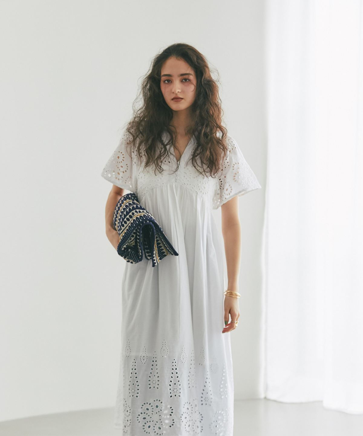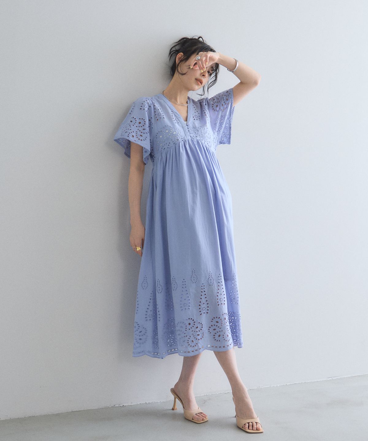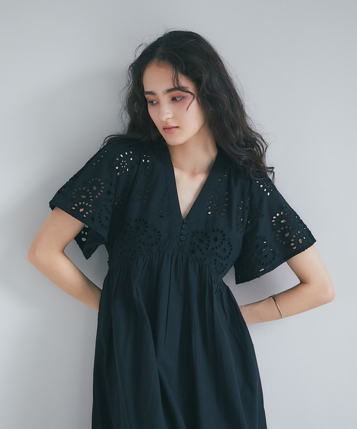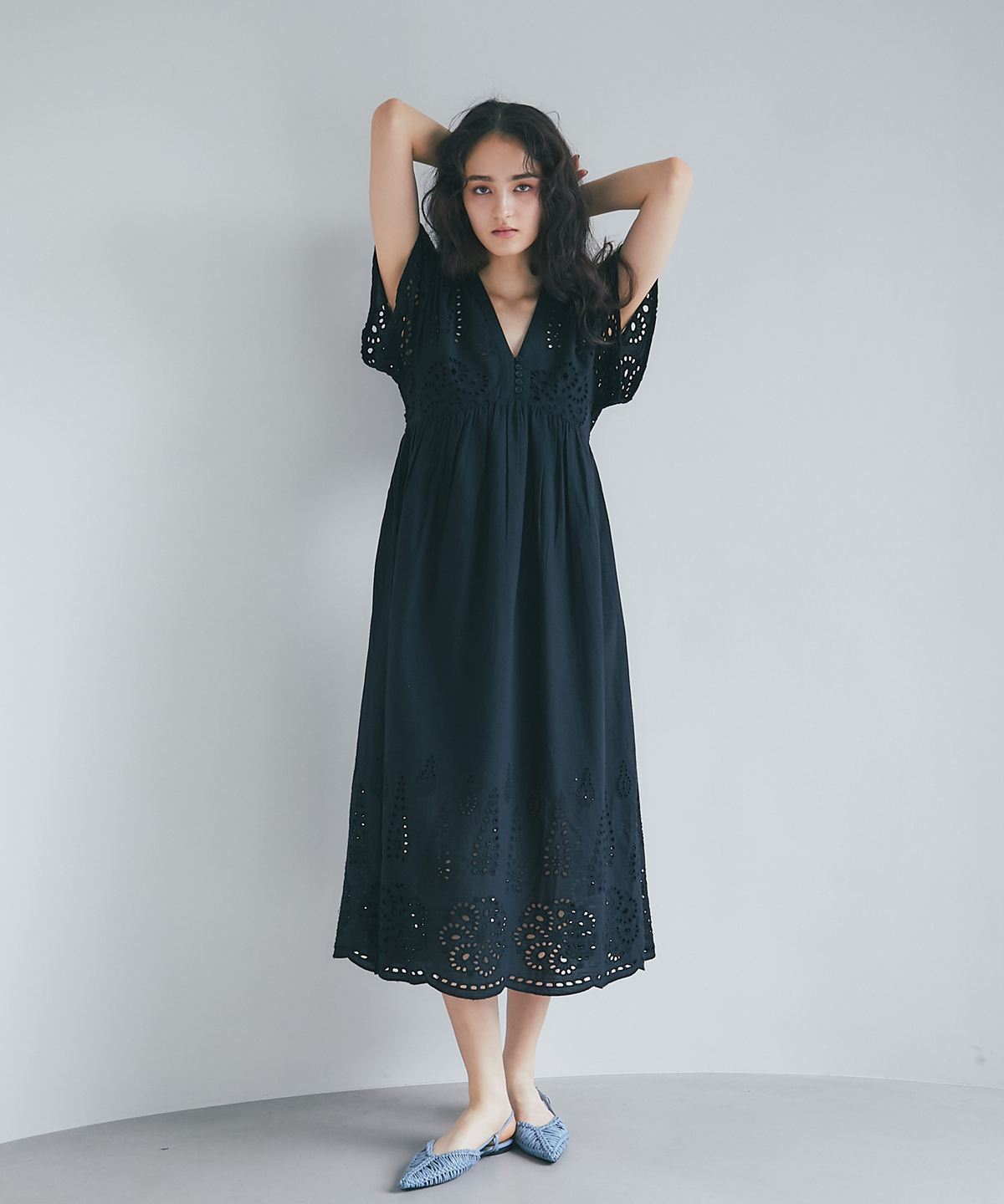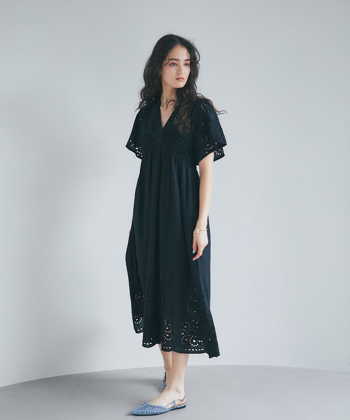 贅沢なコットンレースがリゾートムードを運ぶ、清涼感あふれるVネックワンピース。