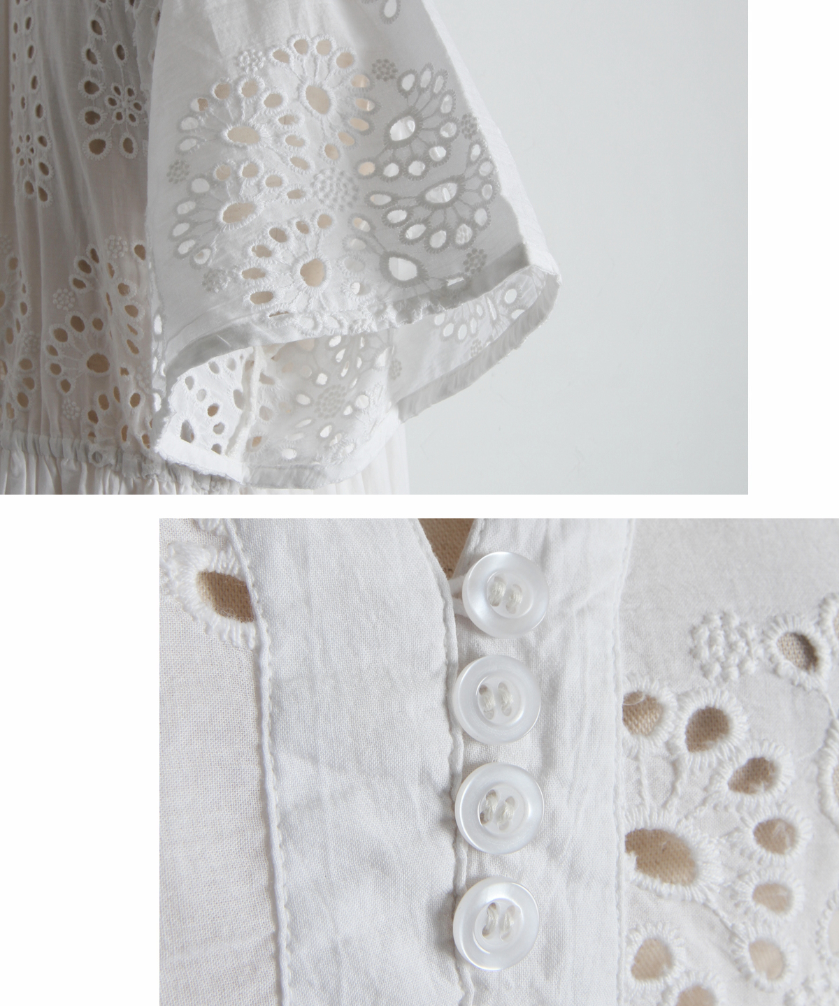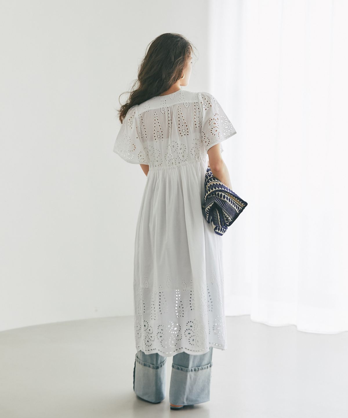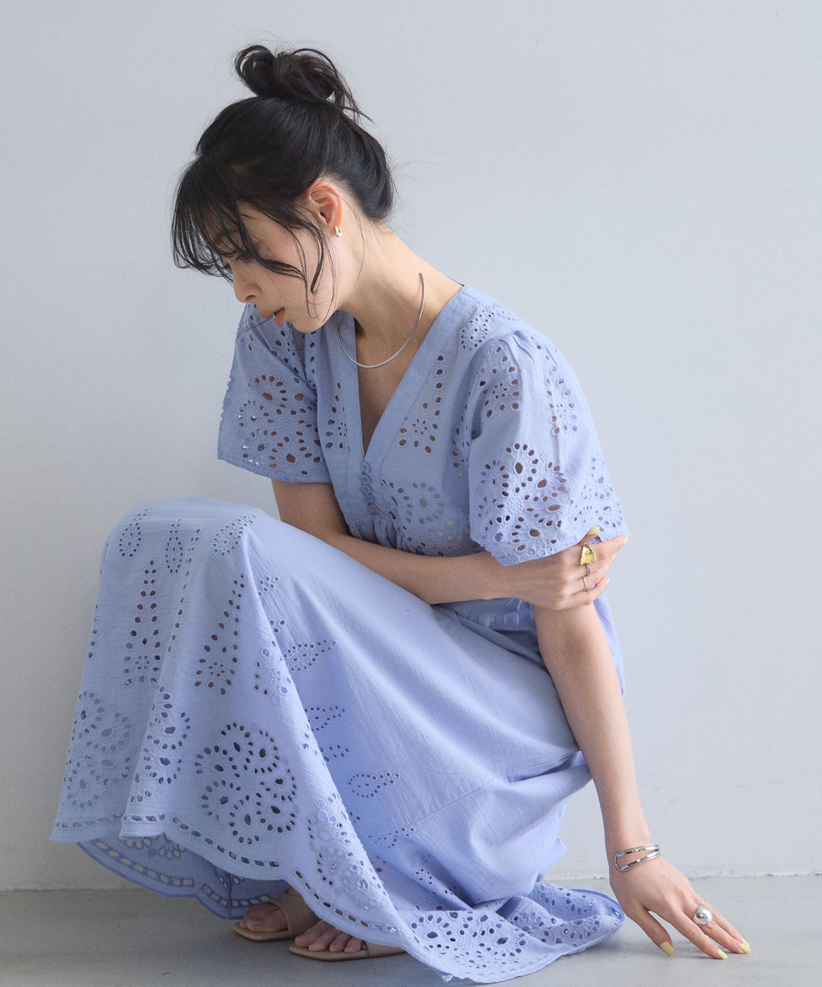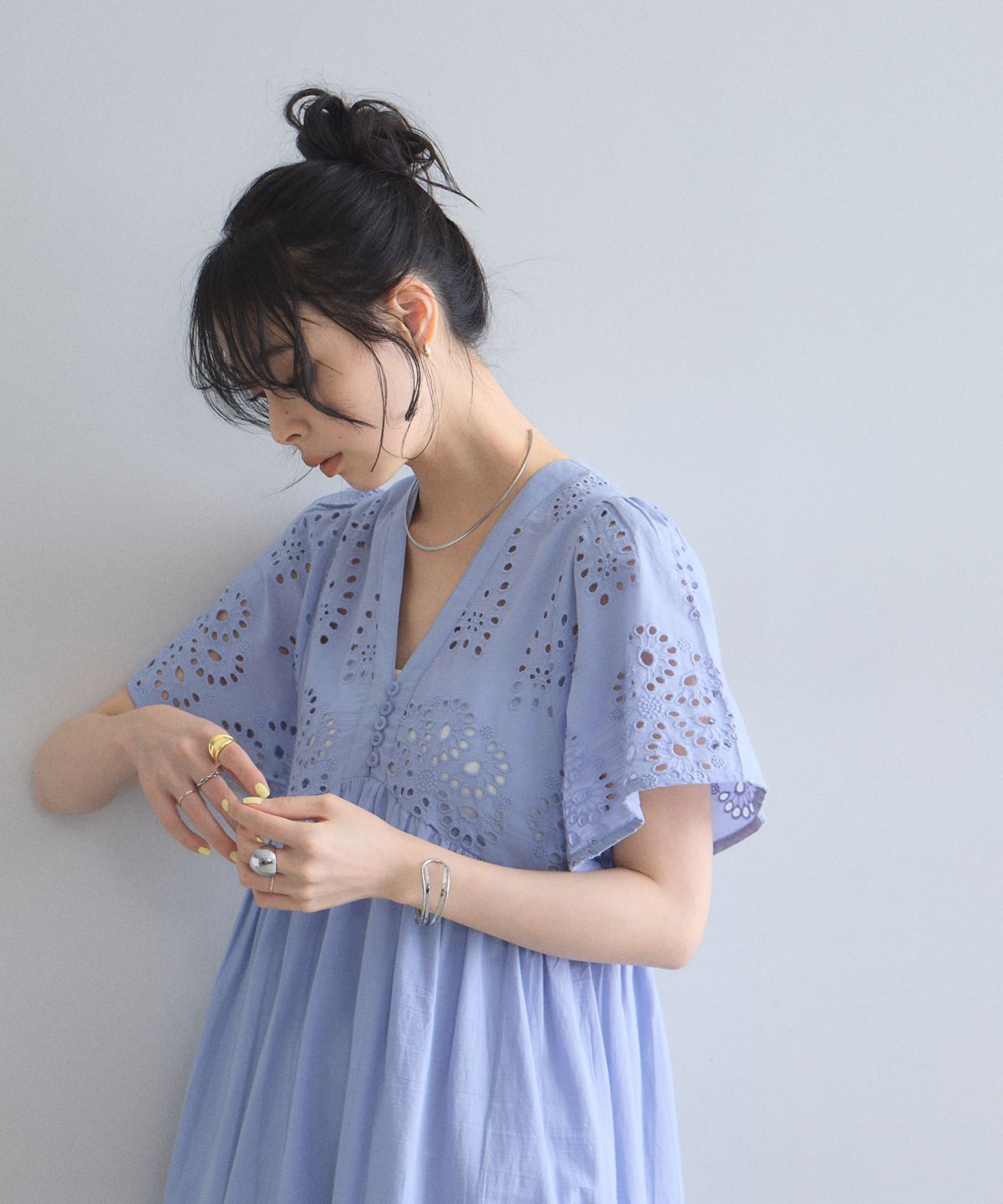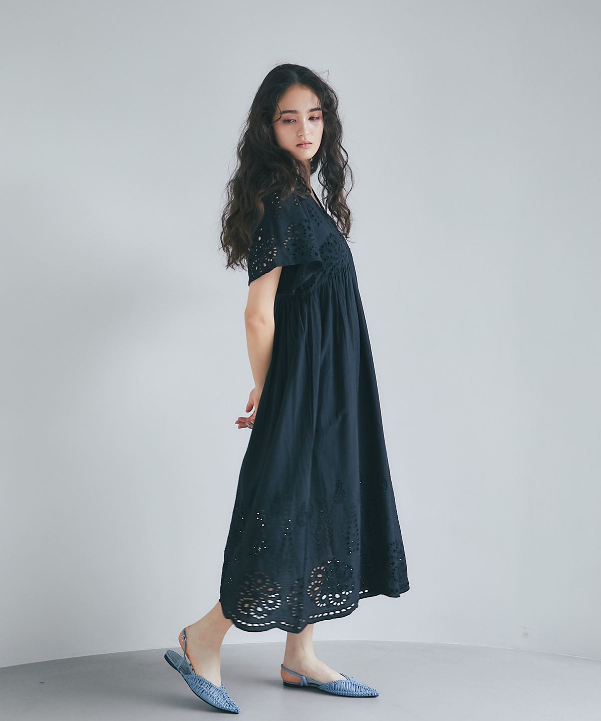 贅沢なコットンレースがリゾートムードを運ぶ、清涼感あふれるVネックワンピース。