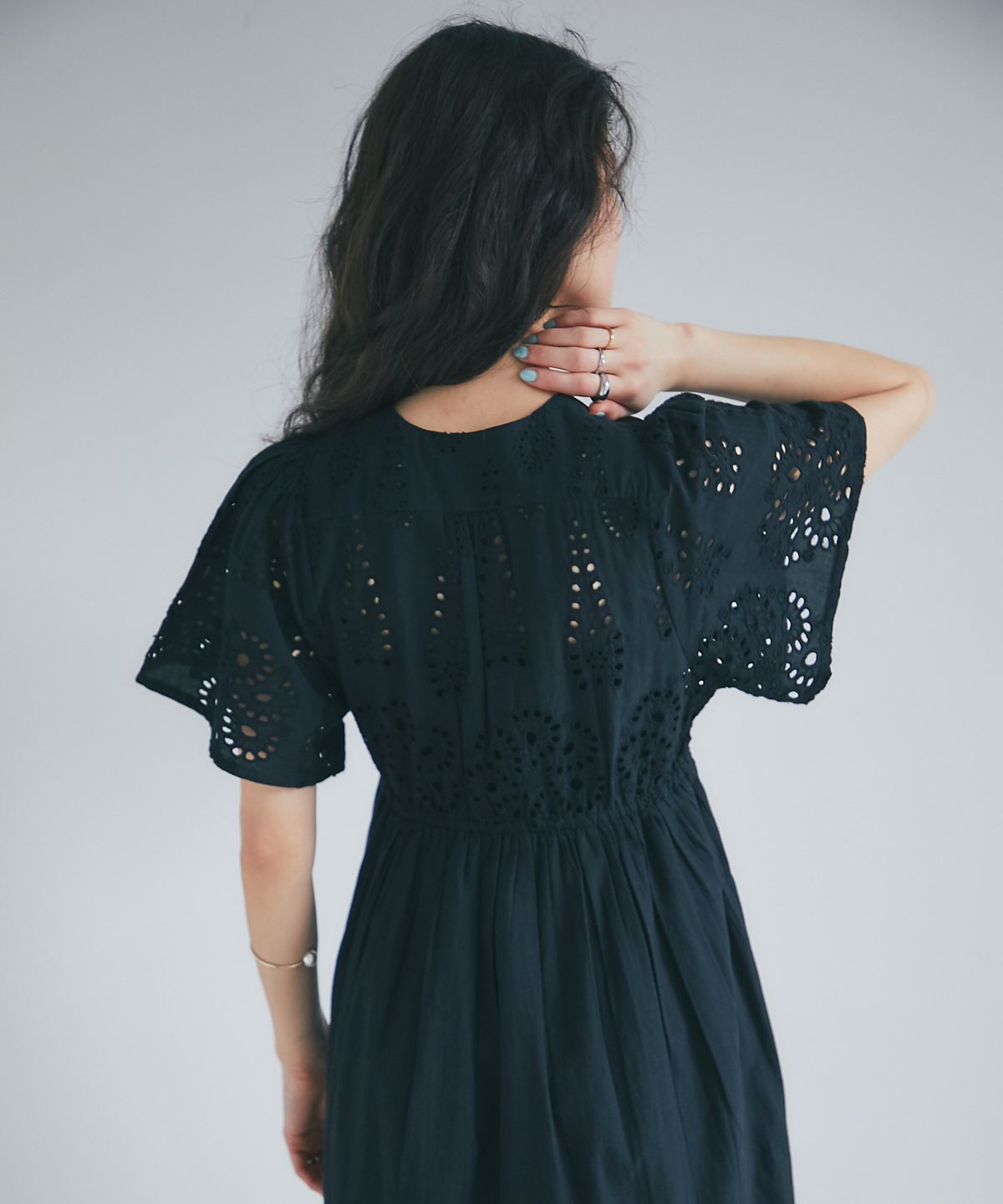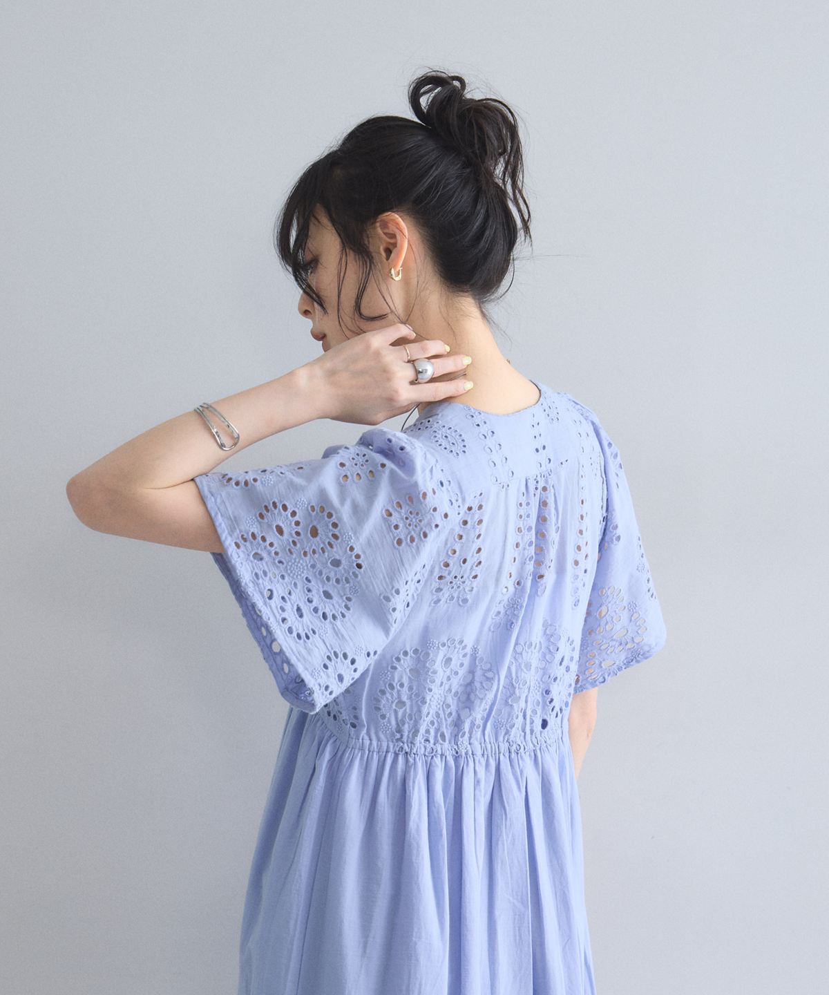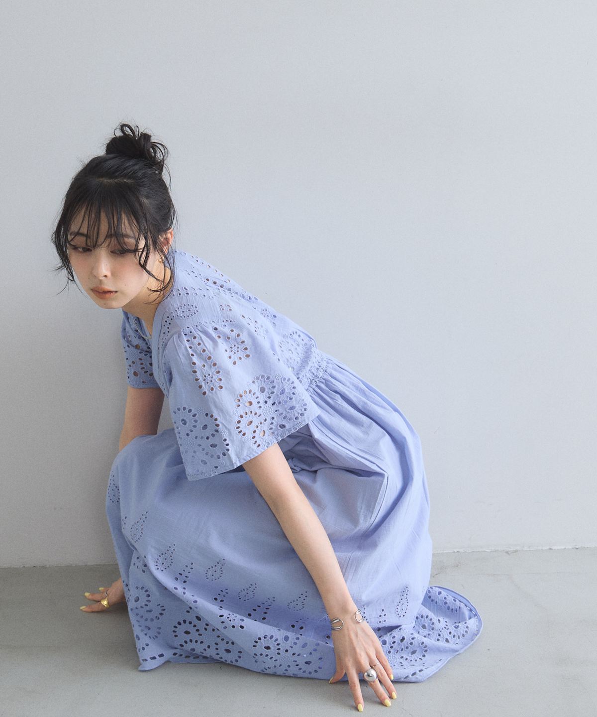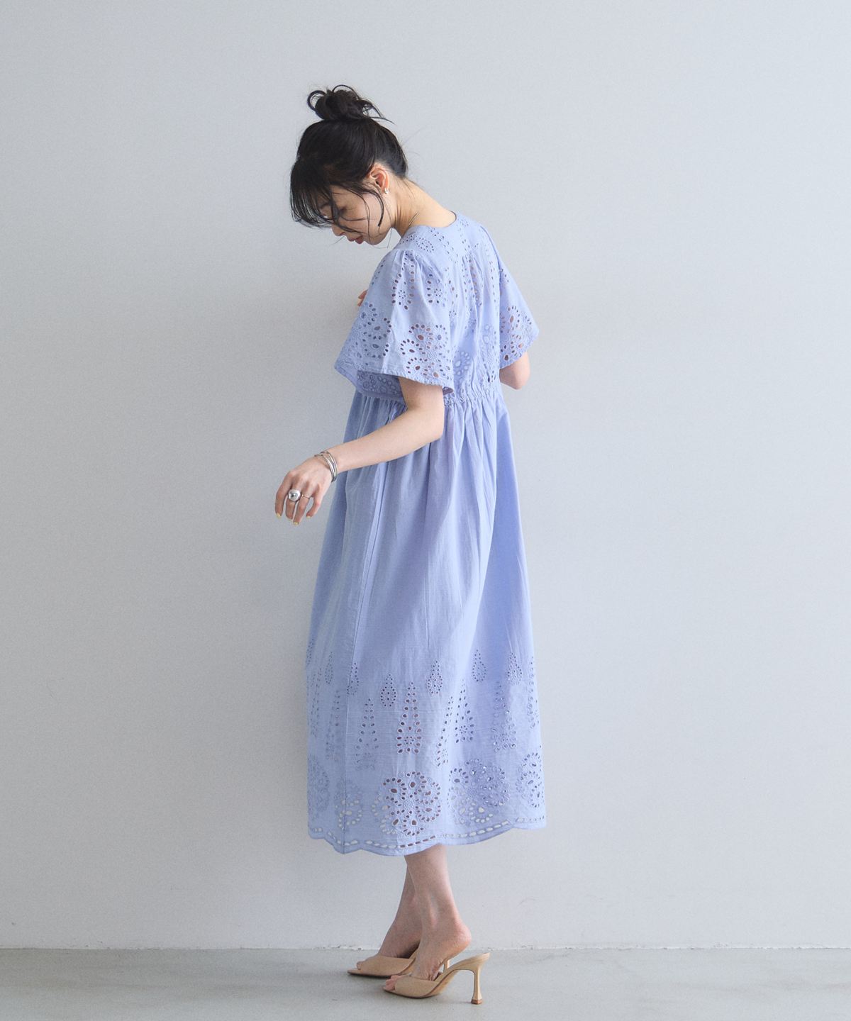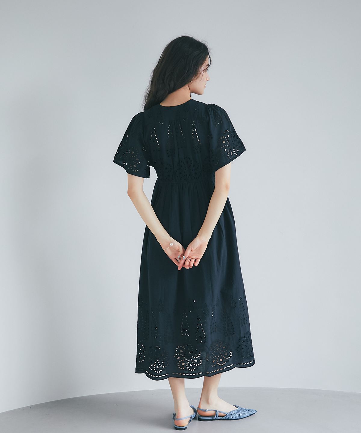 贅沢なコットンレースがリゾートムードを運ぶ、清涼感あふれるVネックワンピース。