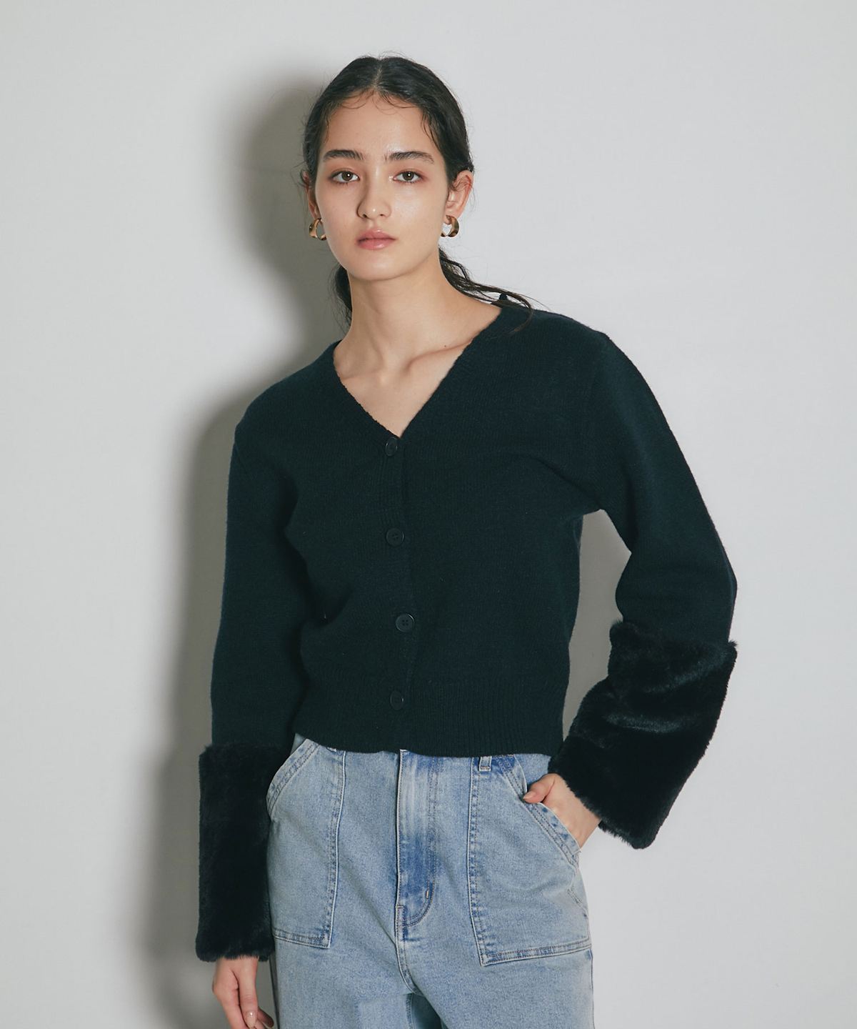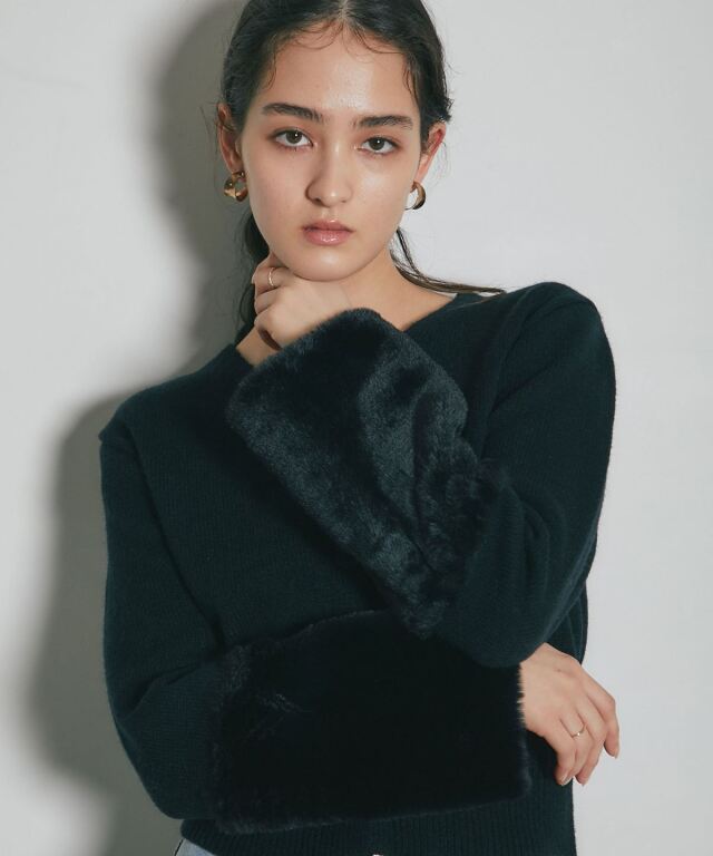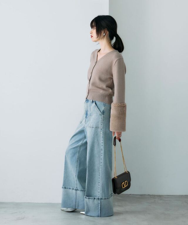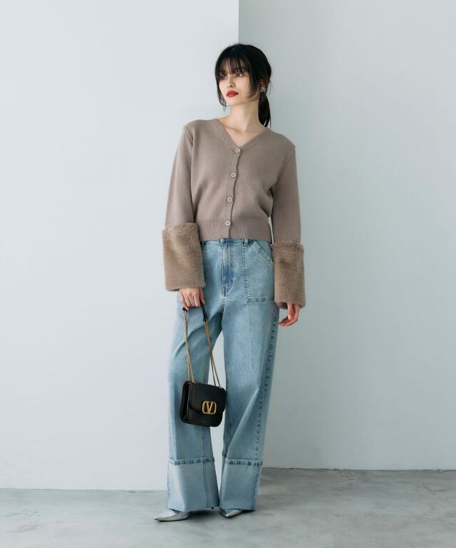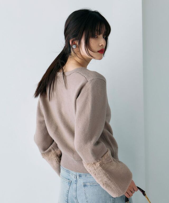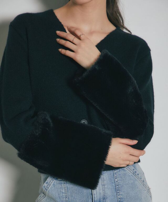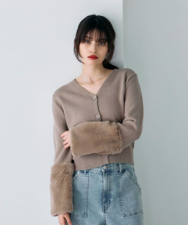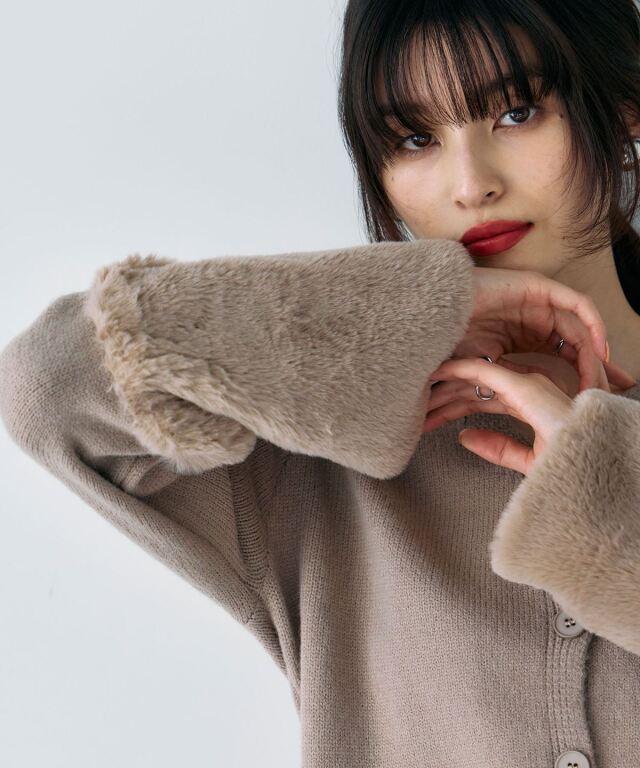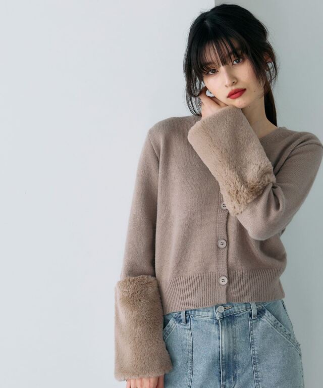 袖ファーで季節感を添える、羽織るだけで華やぐカーディガン。