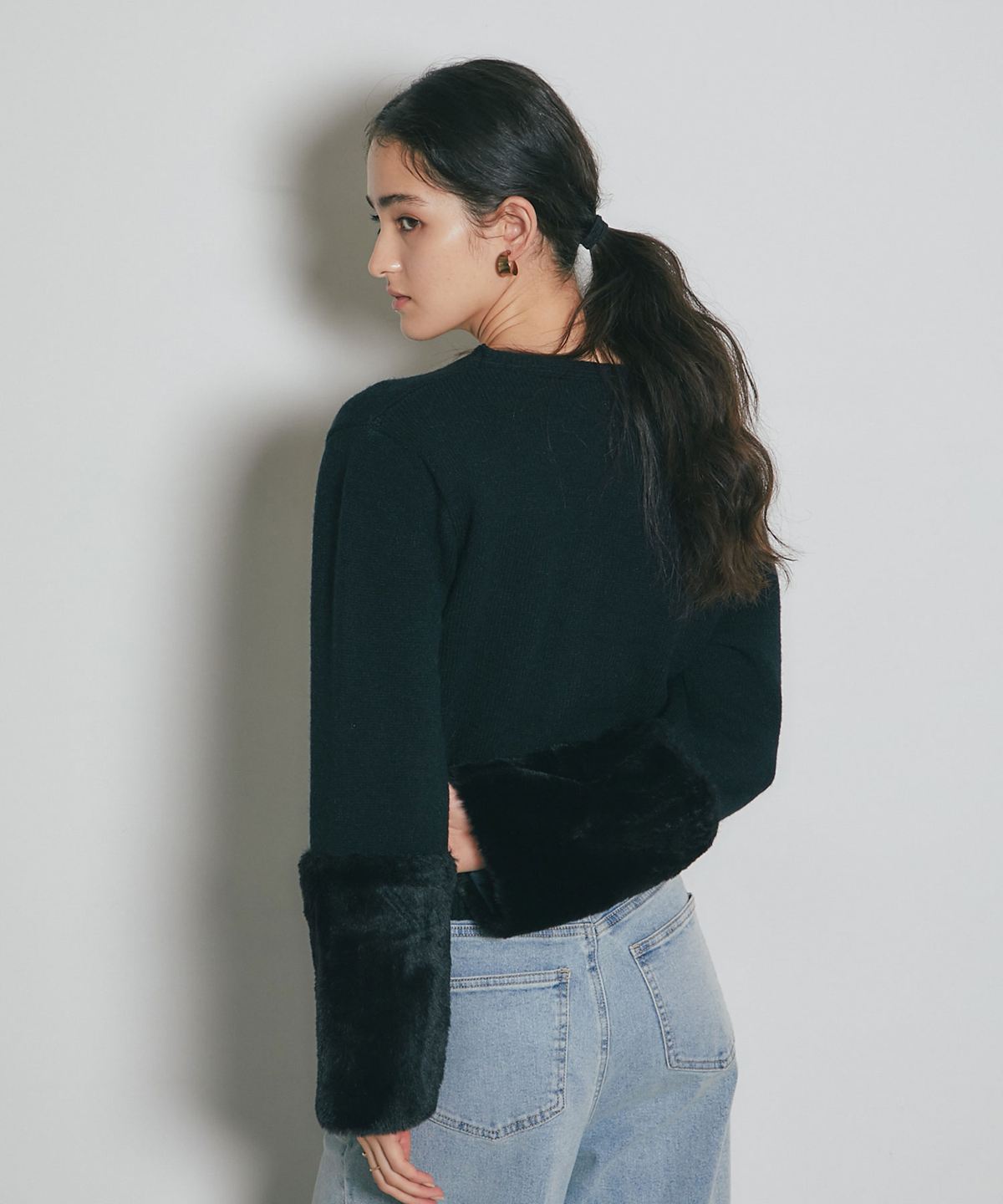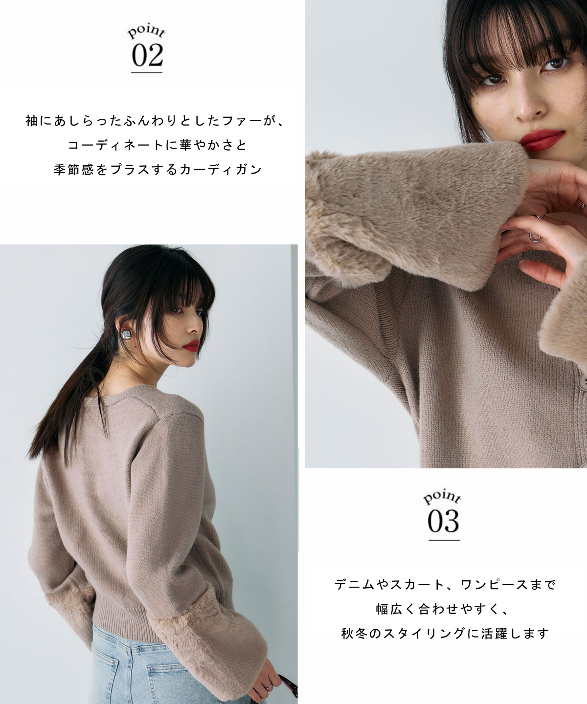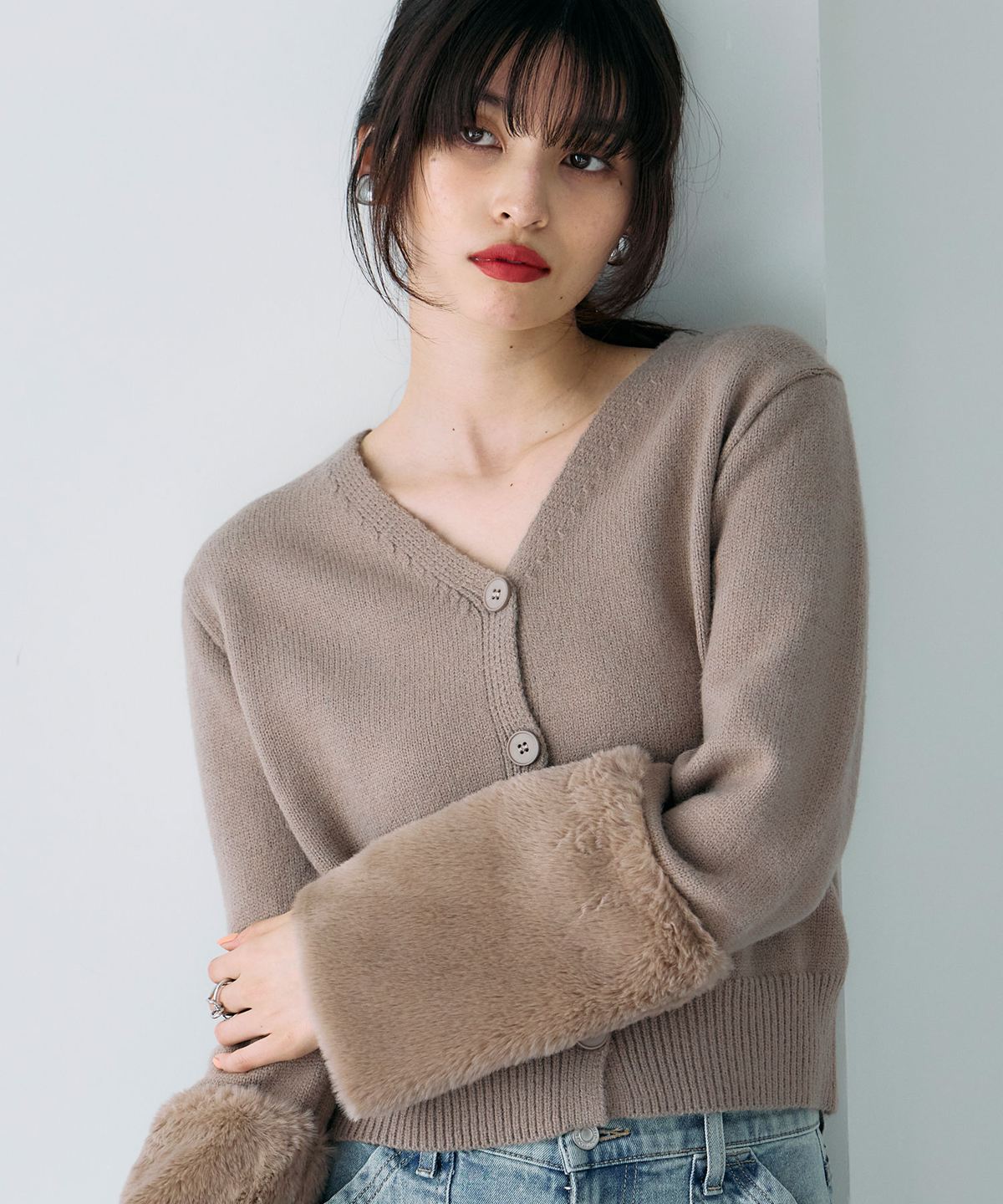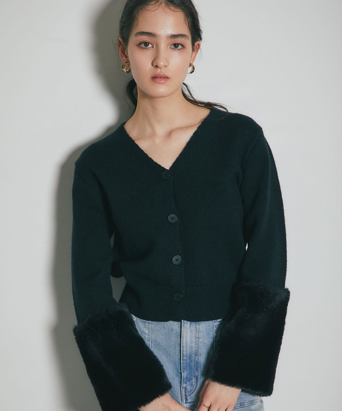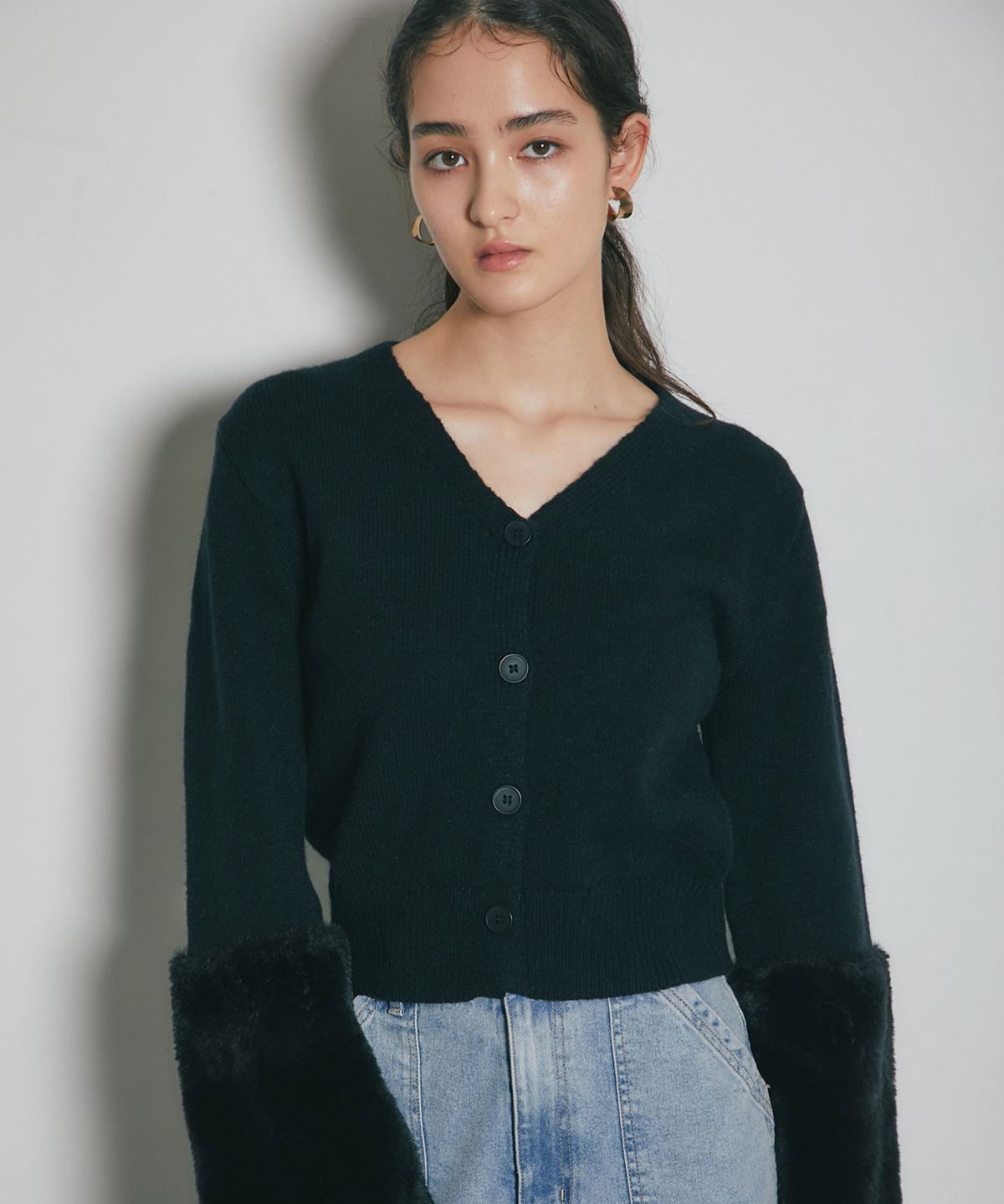 袖ファーで季節感を添える、羽織るだけで華やぐカーディガン。