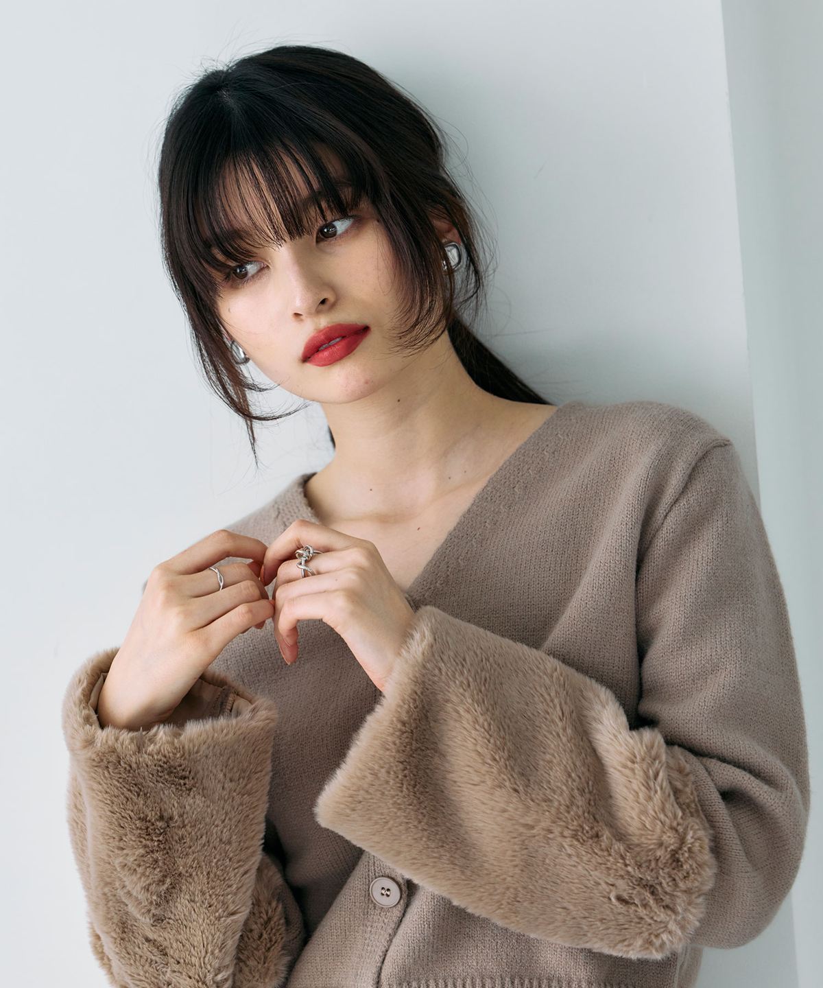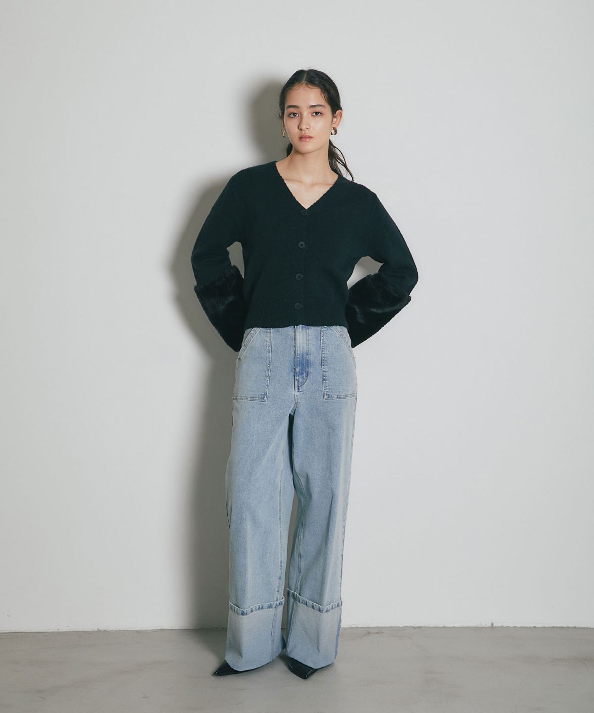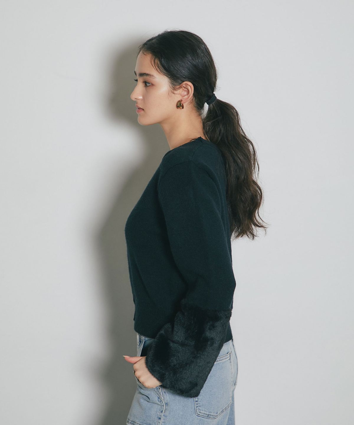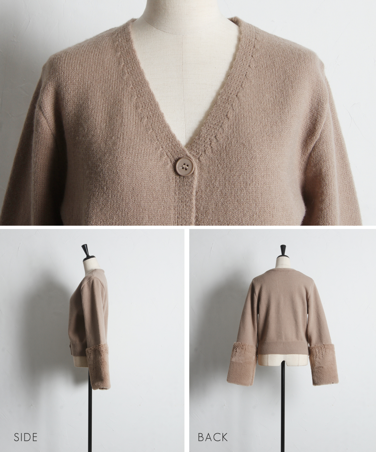 袖ファーで季節感を添える、羽織るだけで華やぐカーディガン。