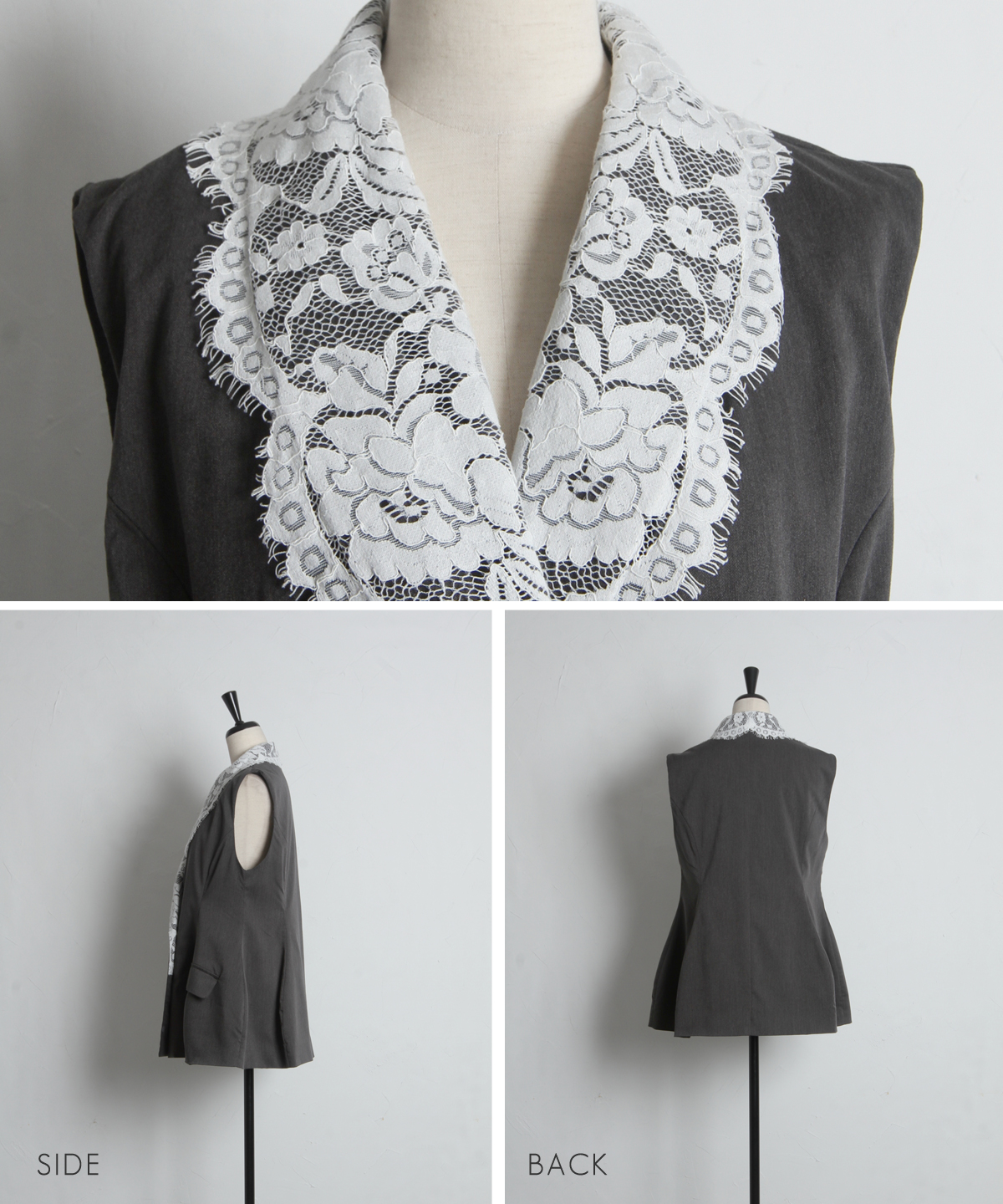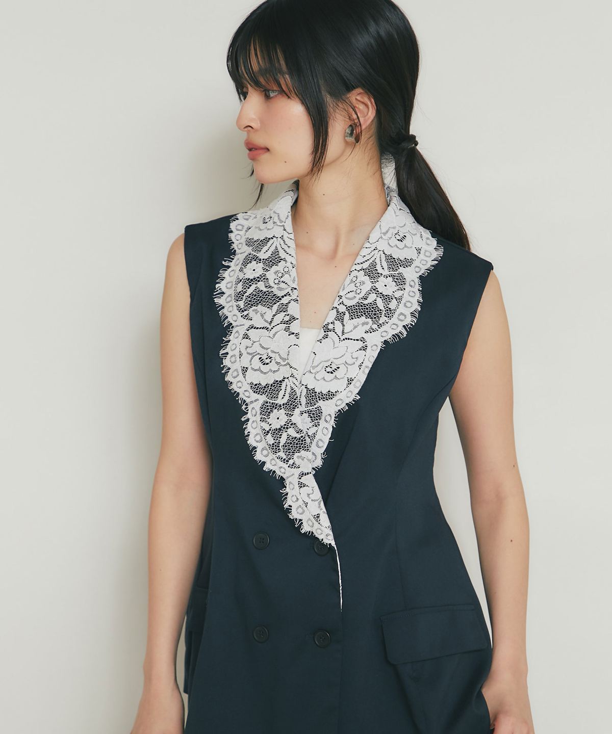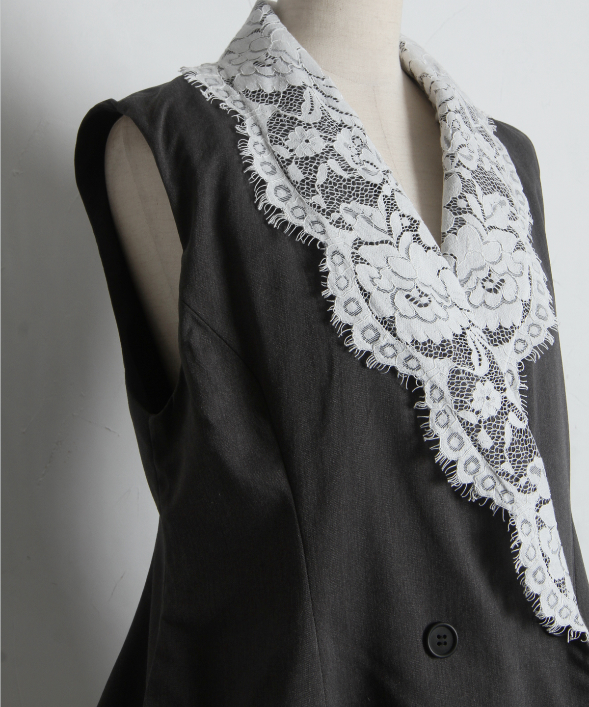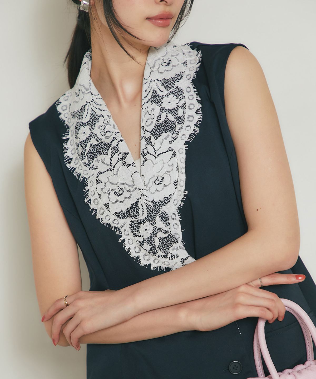 贅沢なレースを重ねたショールカラーが目を惹くジレです。