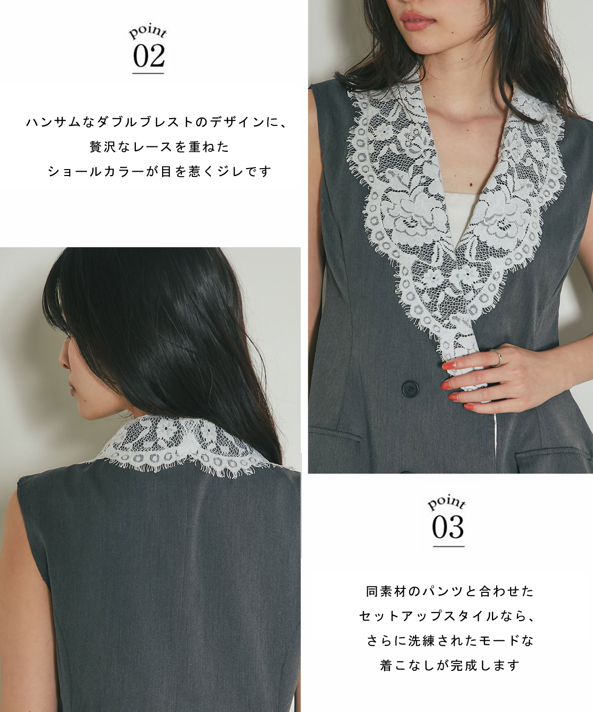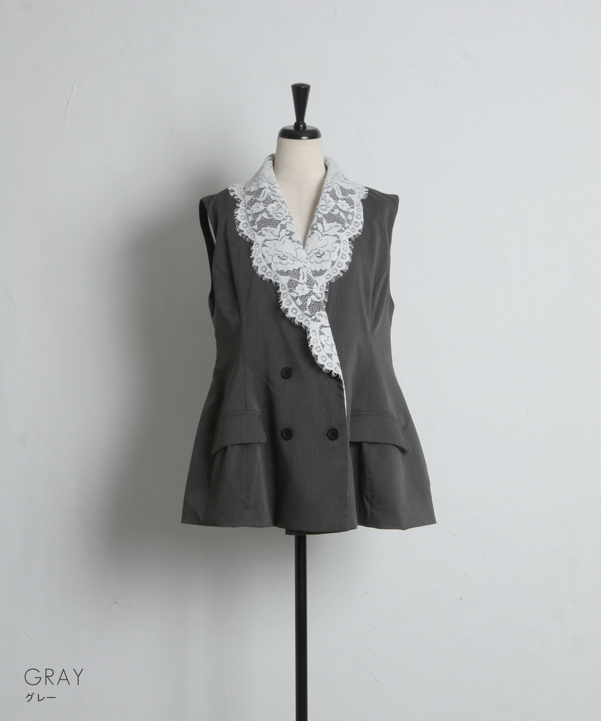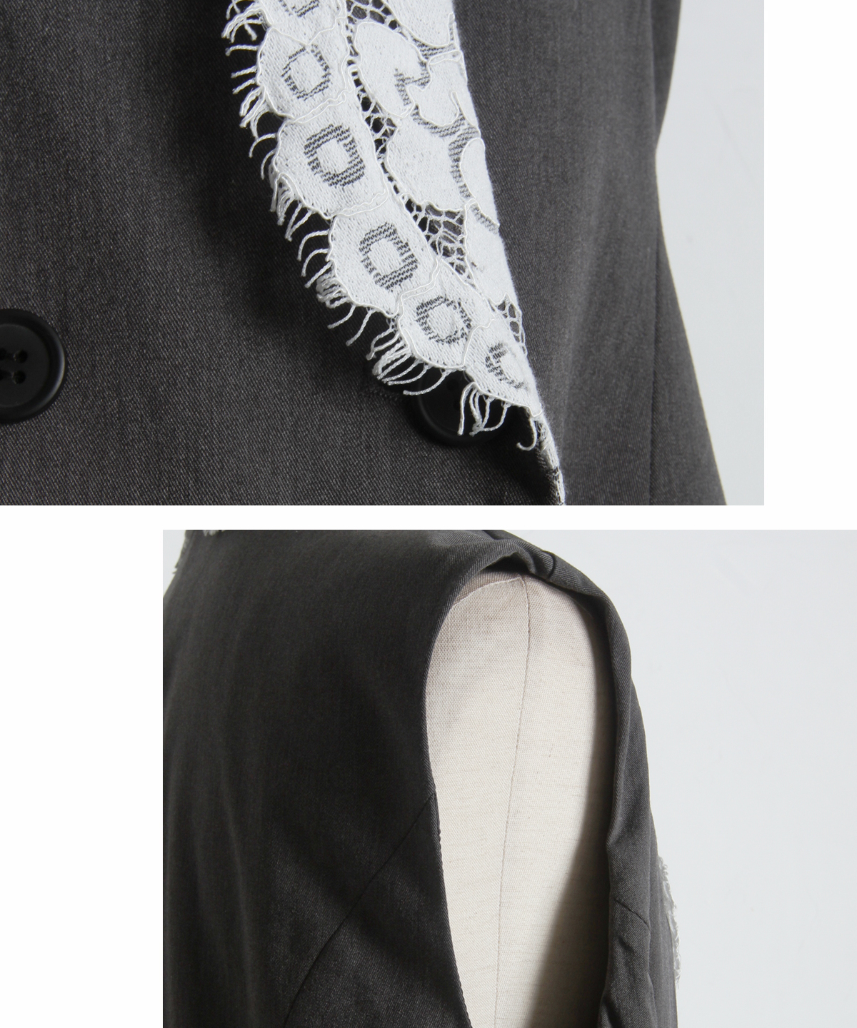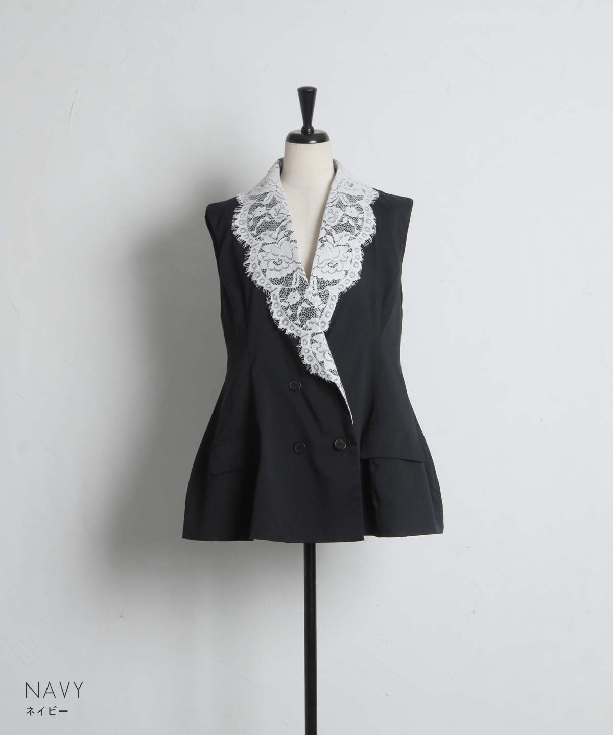 贅沢なレースを重ねたショールカラーが目を惹くジレです。