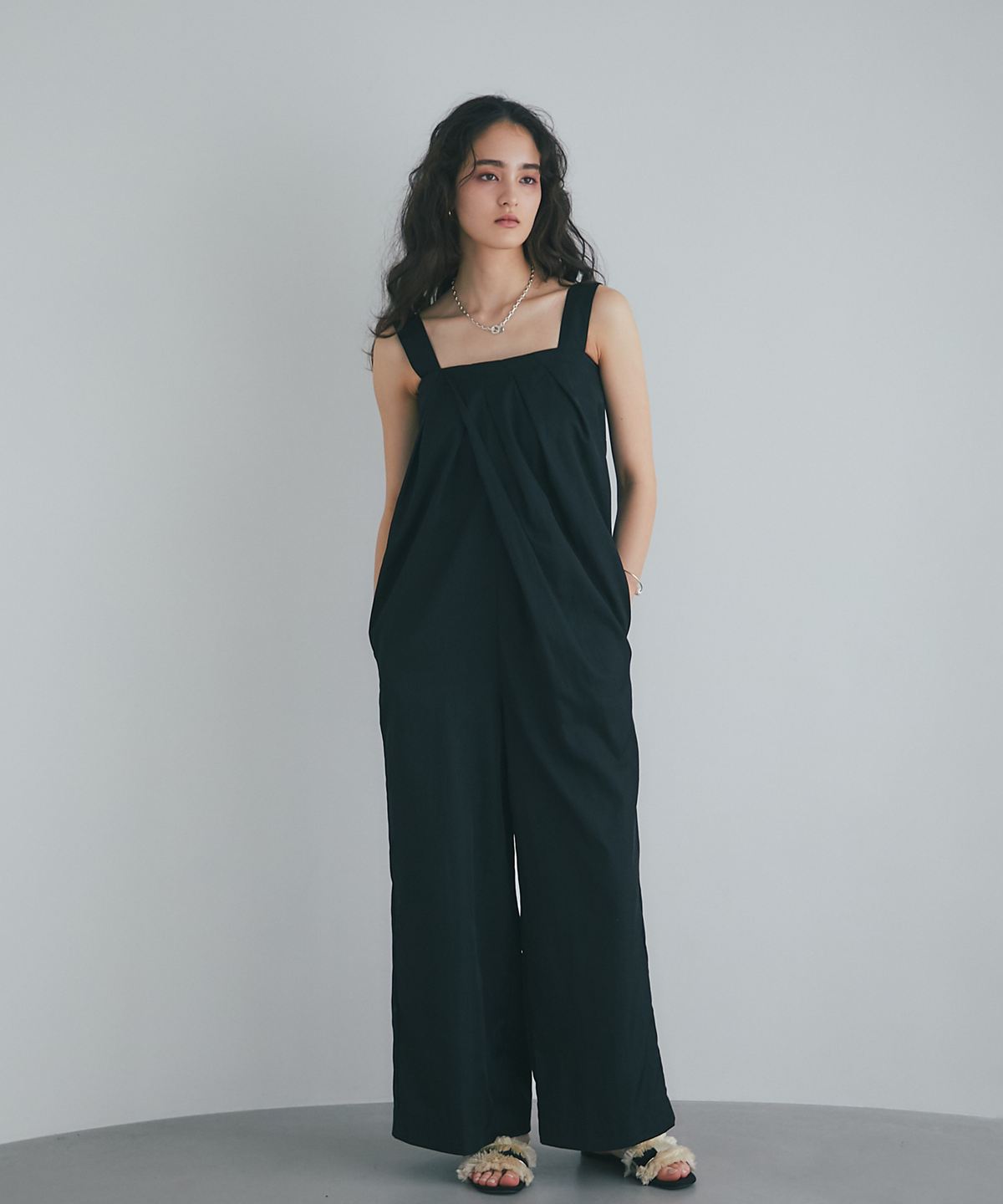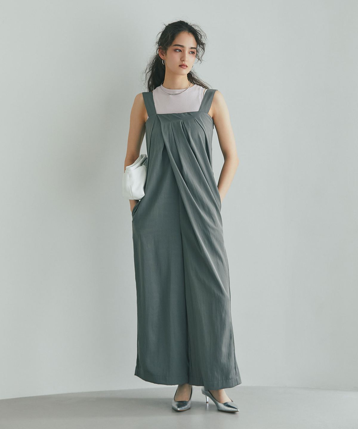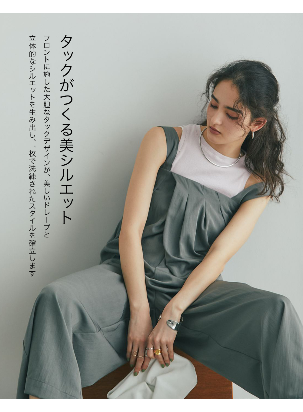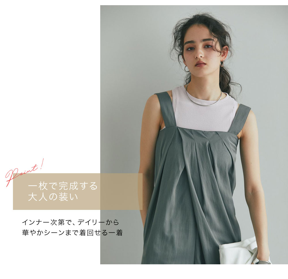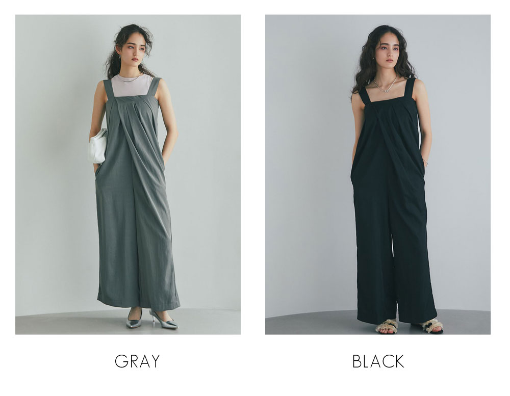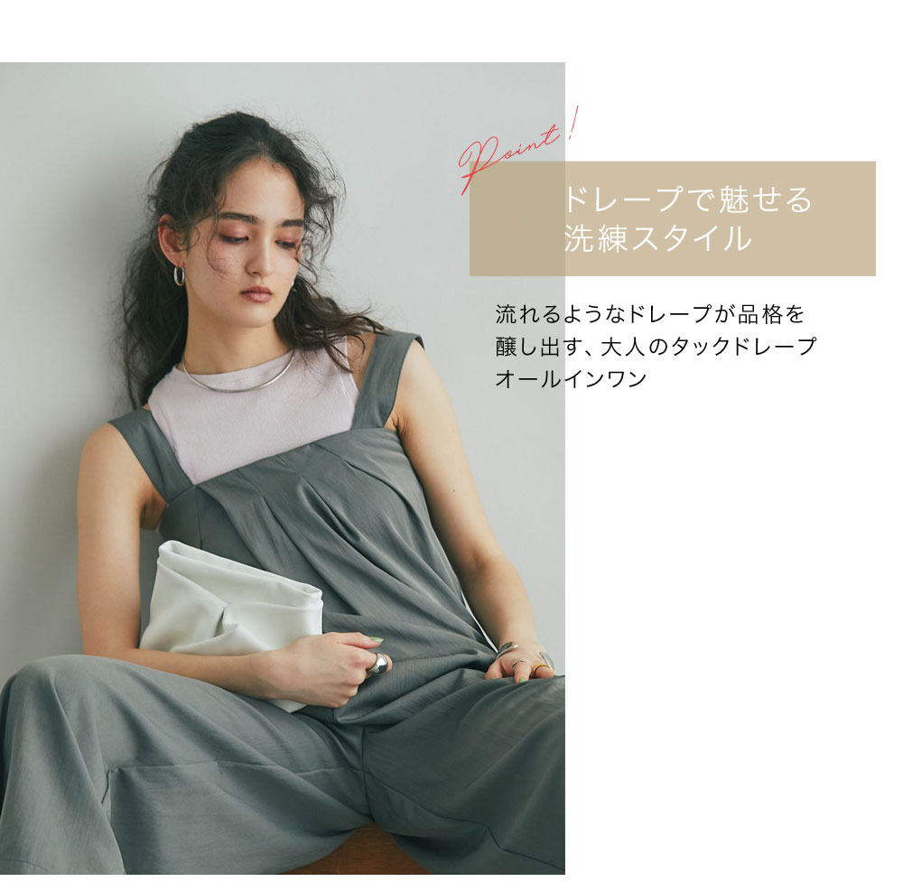 流れるようなドレープが品格を醸し出す、大人のタックドレープオールインワン。