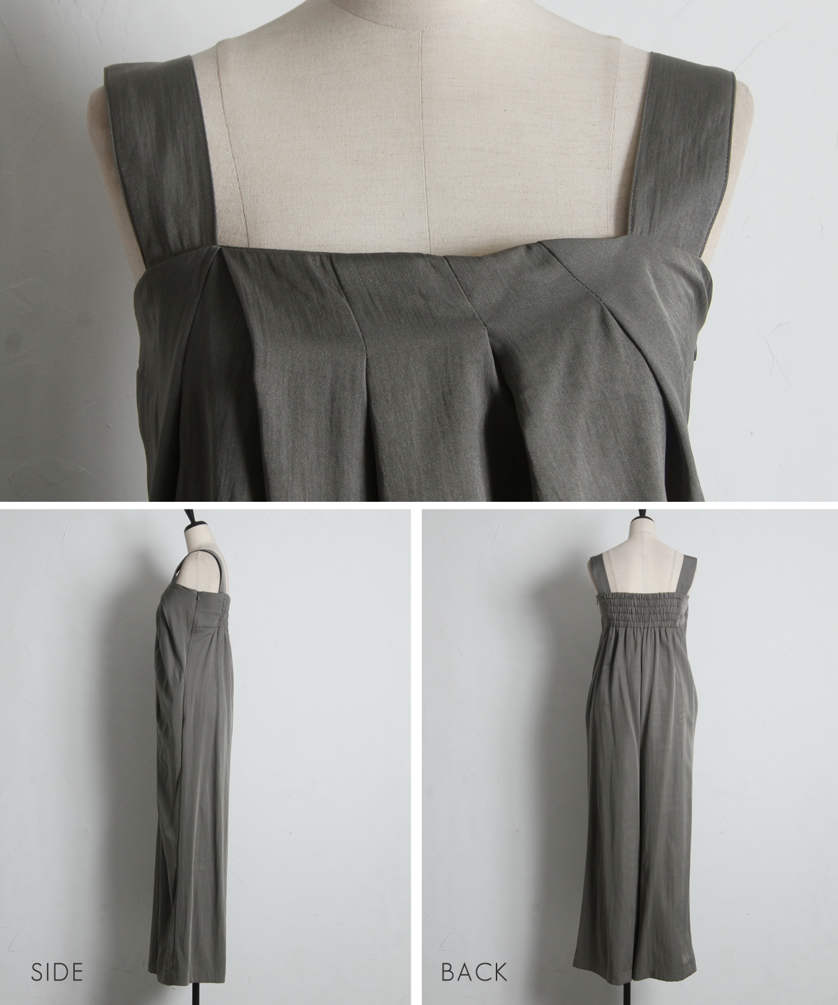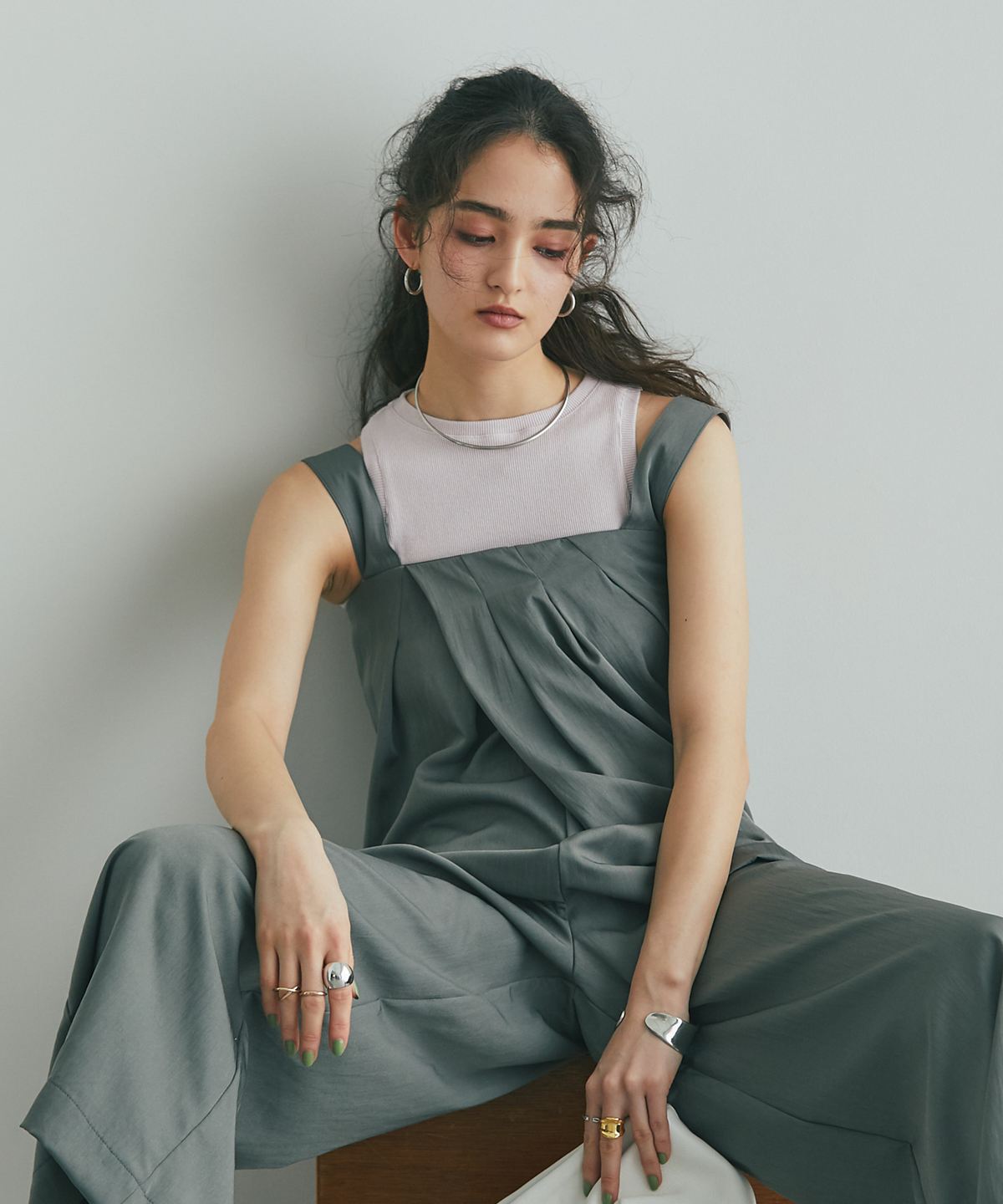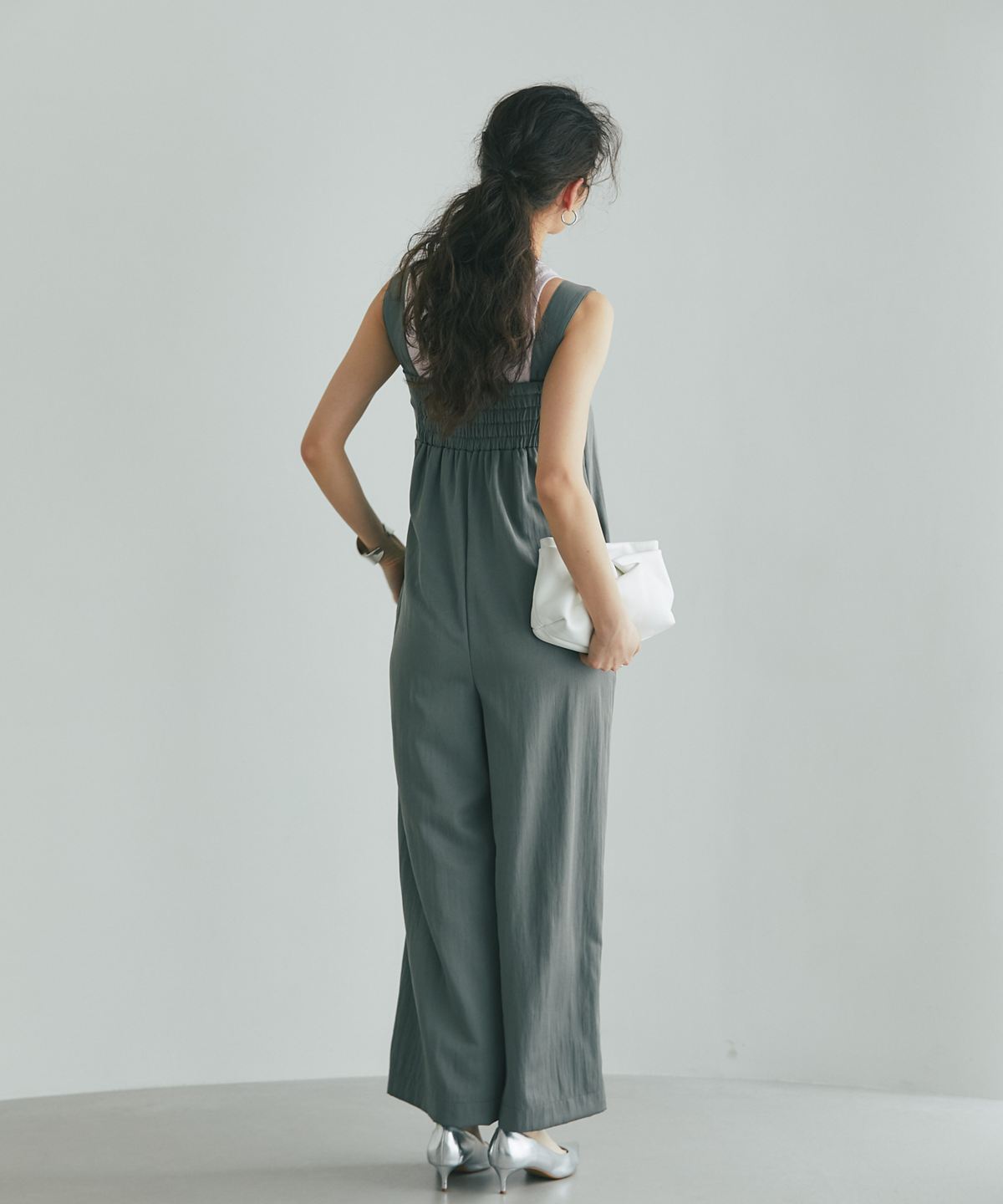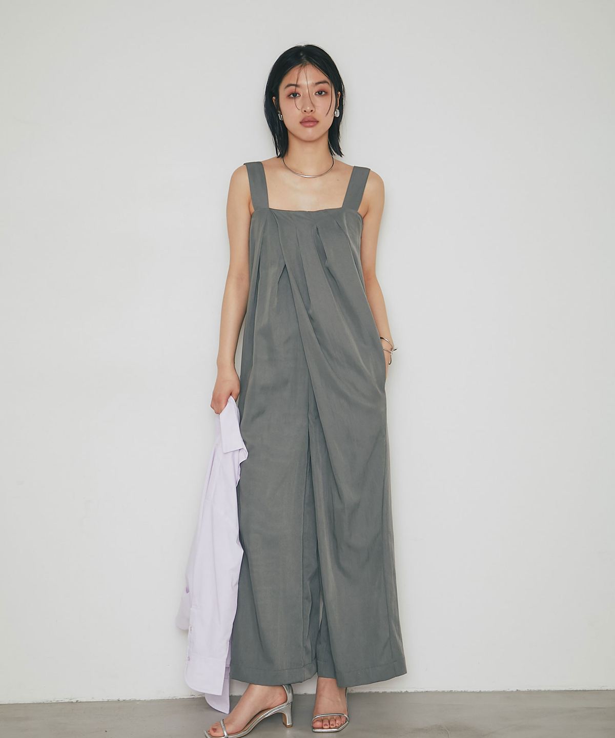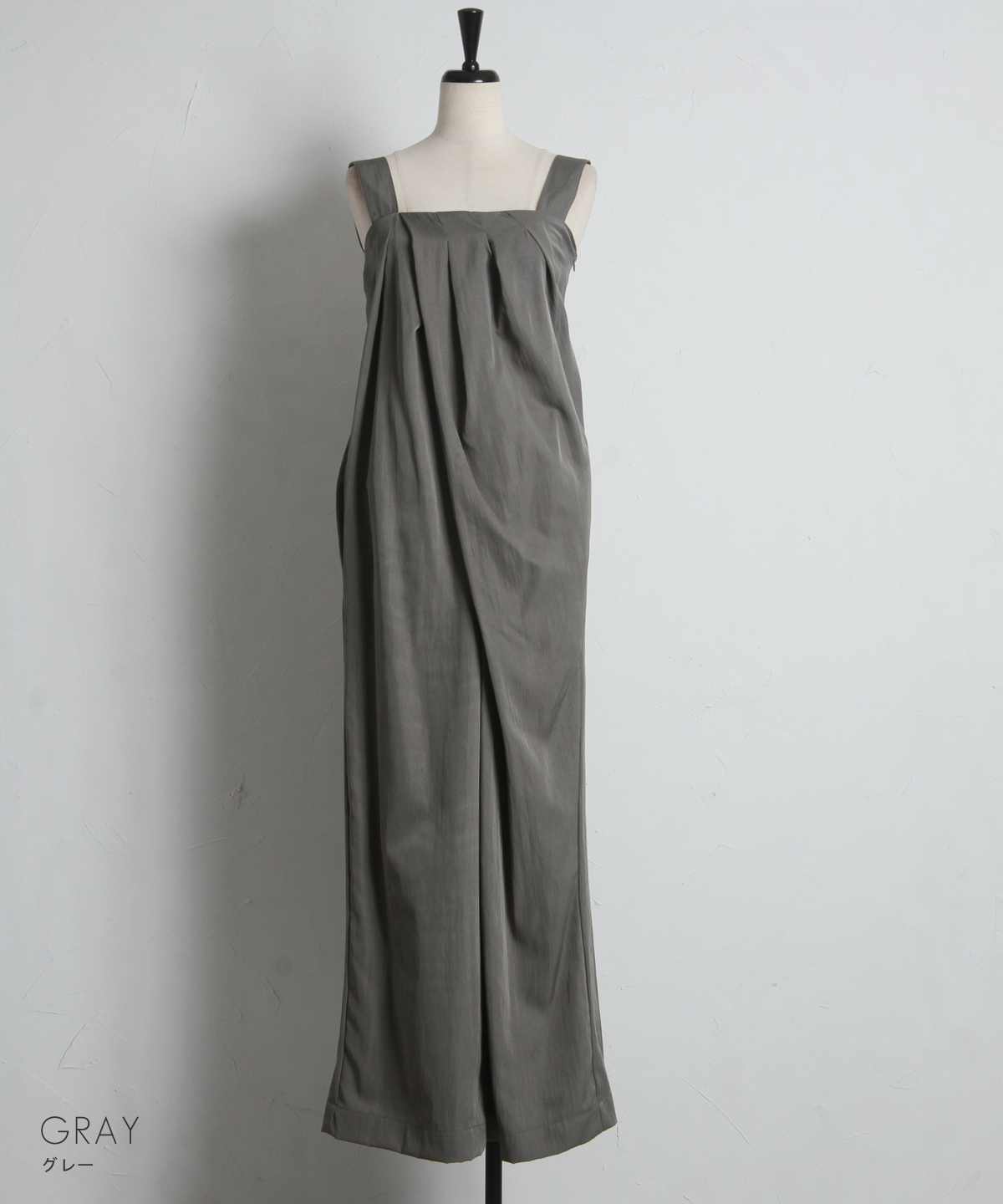 流れるようなドレープが品格を醸し出す、大人のタックドレープオールインワン。