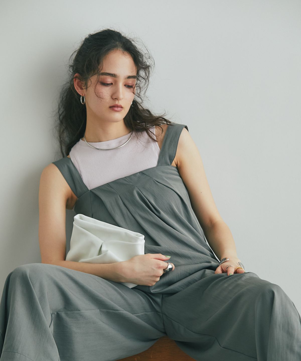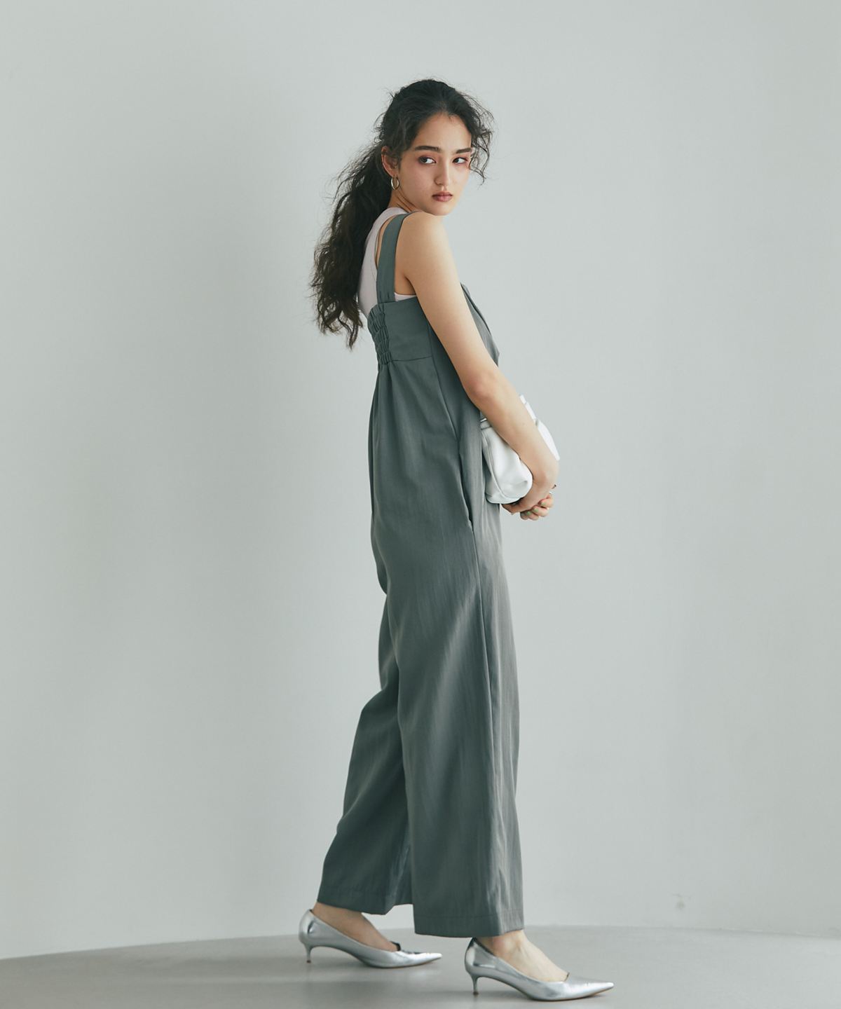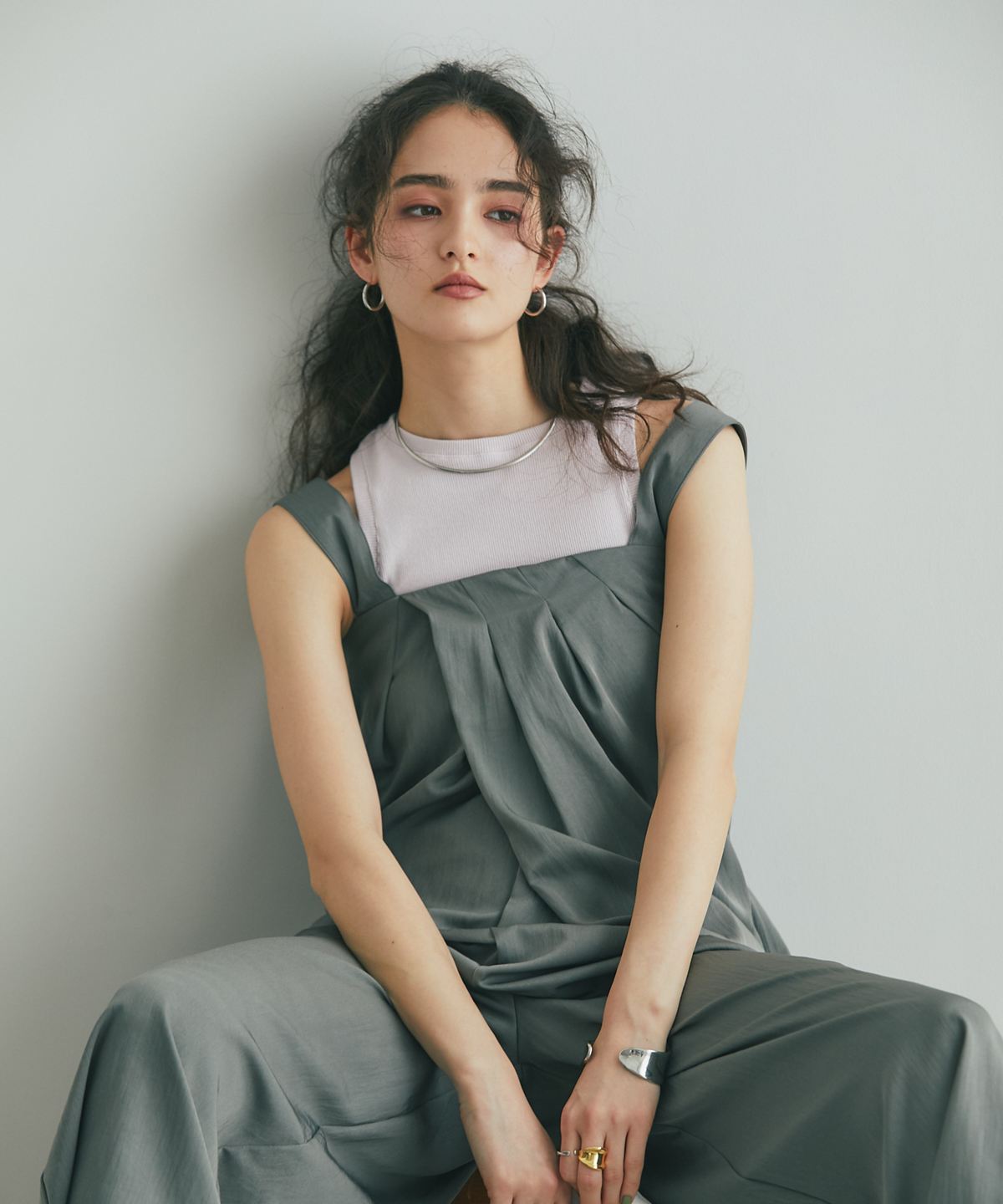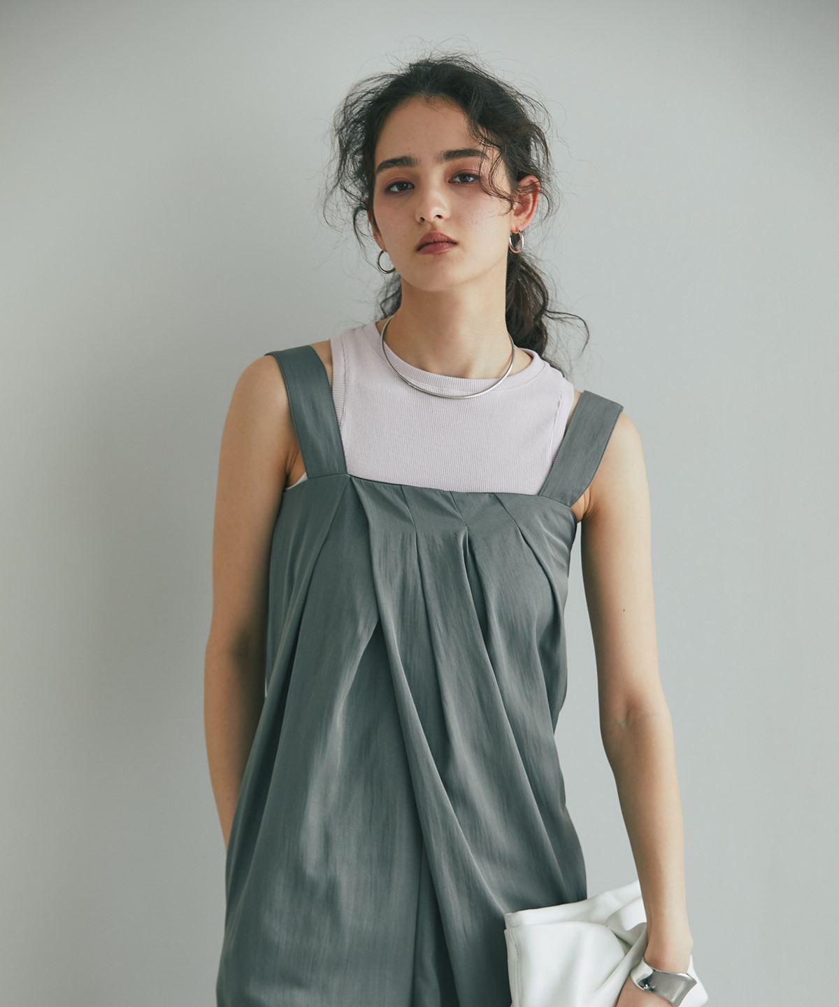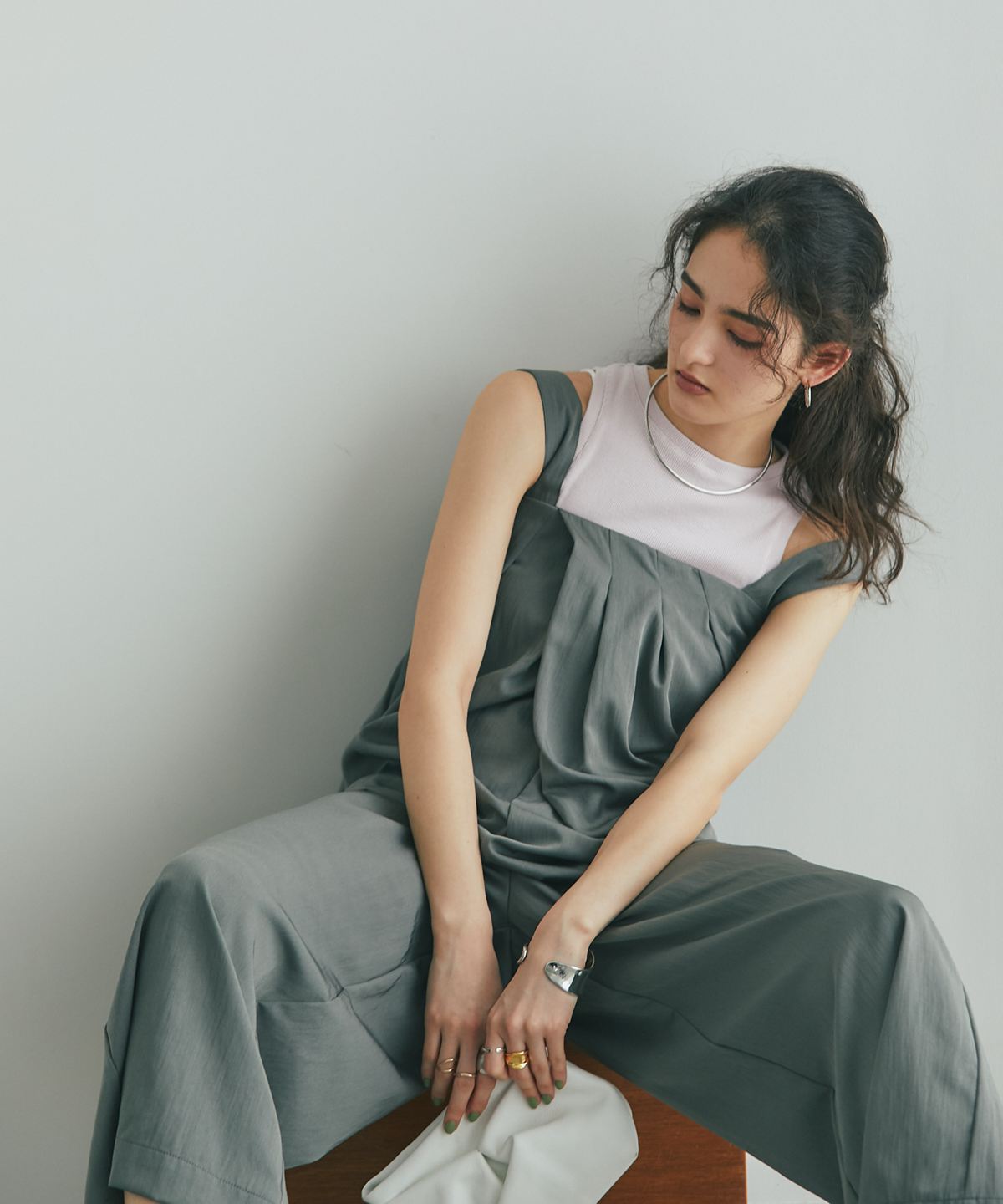 流れるようなドレープが品格を醸し出す、大人のタックドレープオールインワン。