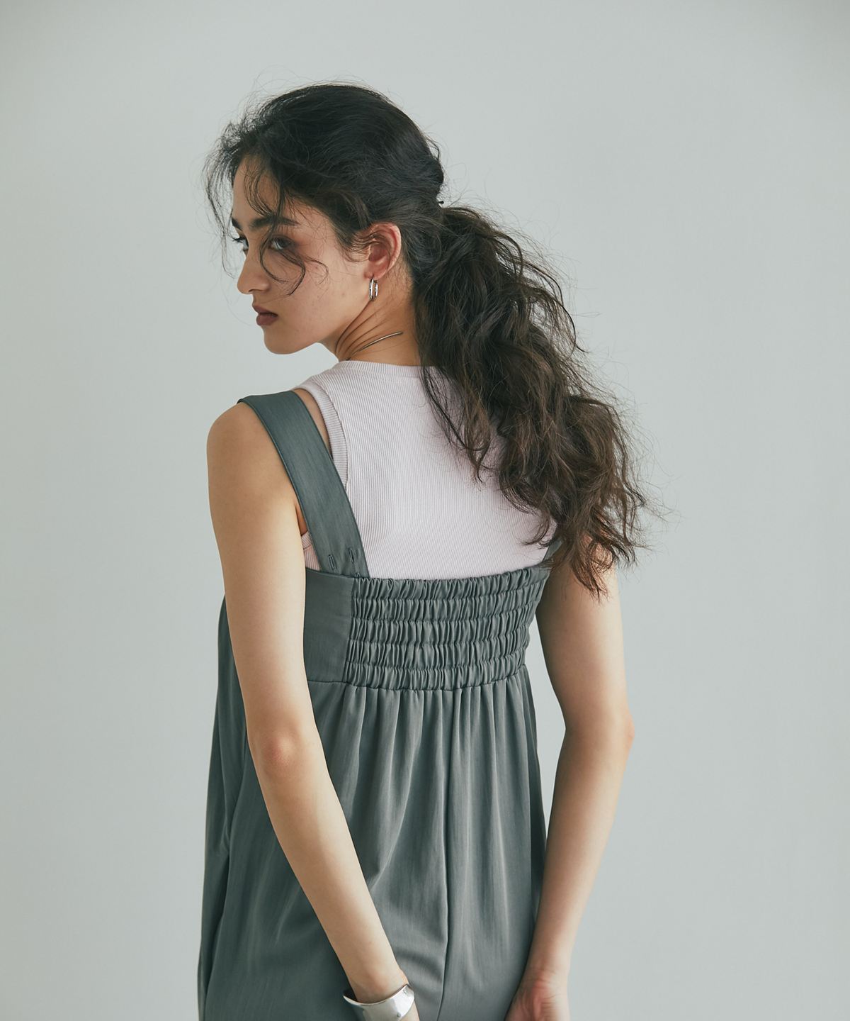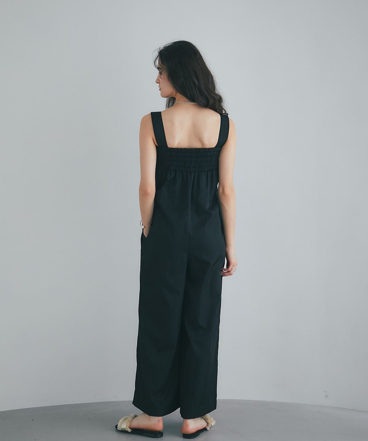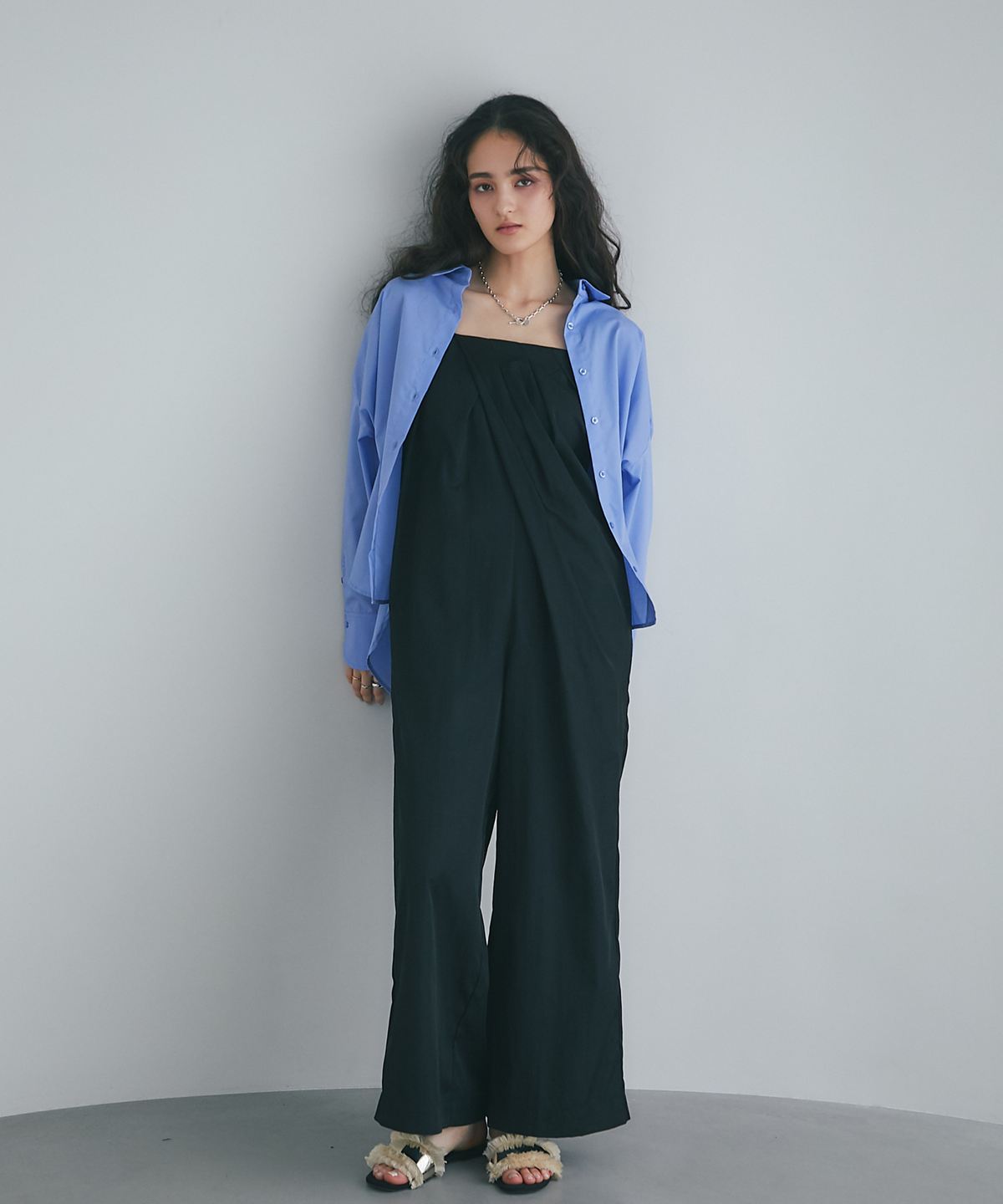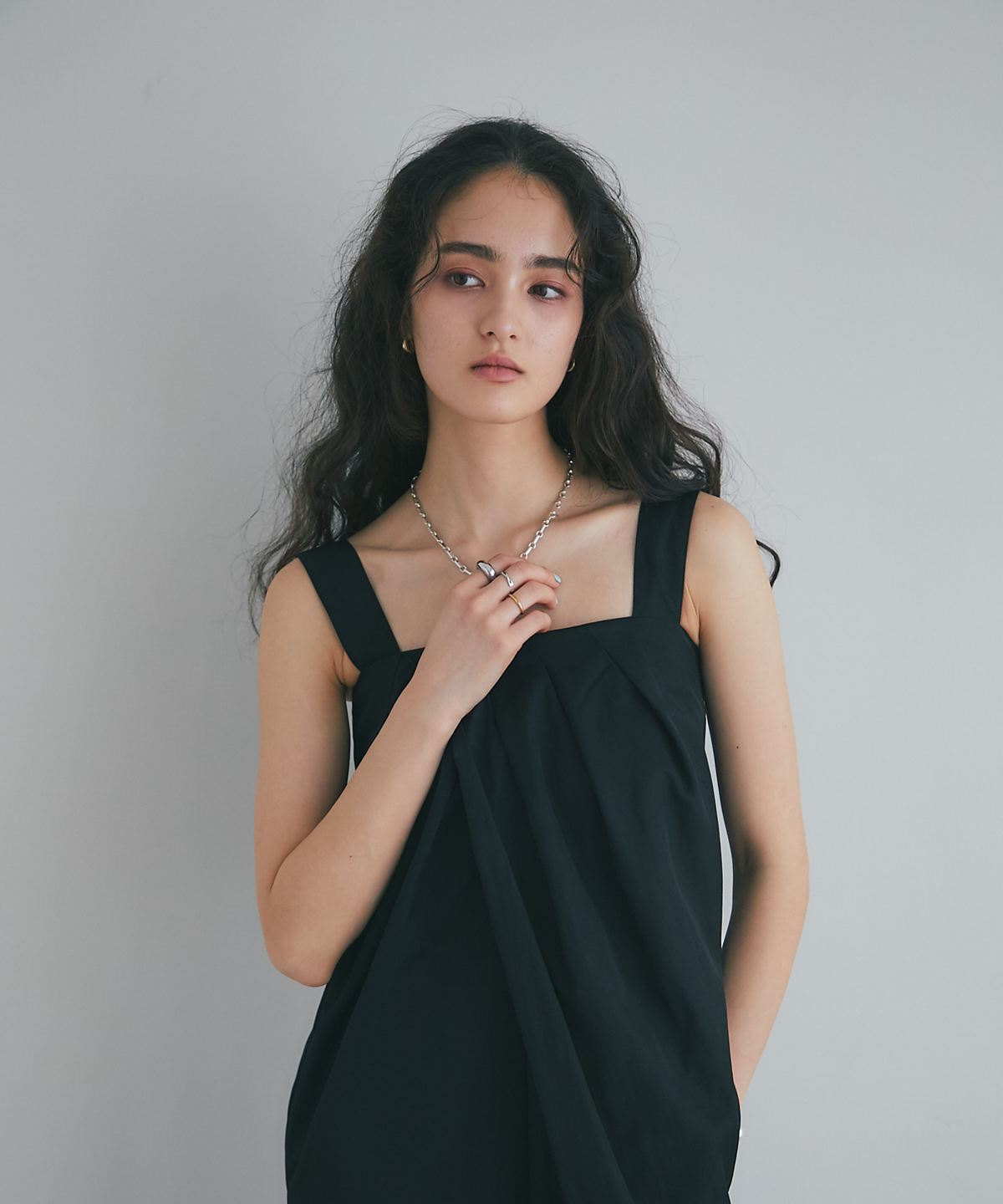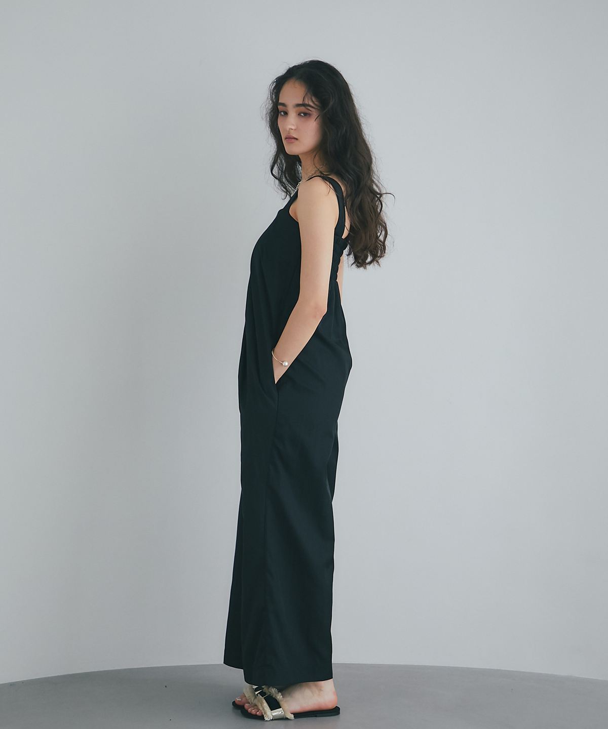 流れるようなドレープが品格を醸し出す、大人のタックドレープオールインワン。