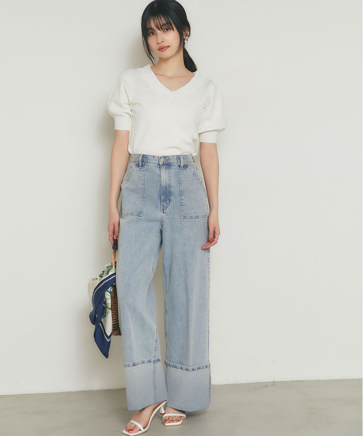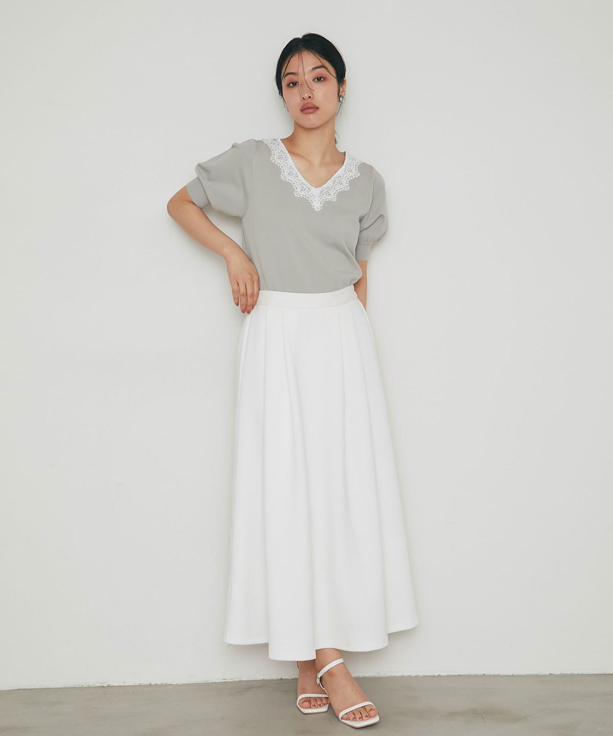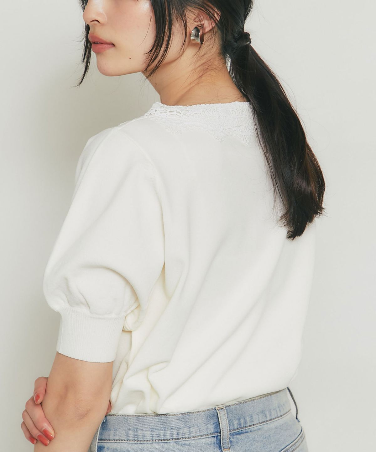 程よくふんわりとしたパフスリーブが、二の腕をカバーしつつ女性らしい柔らかなシルエットを演出。
