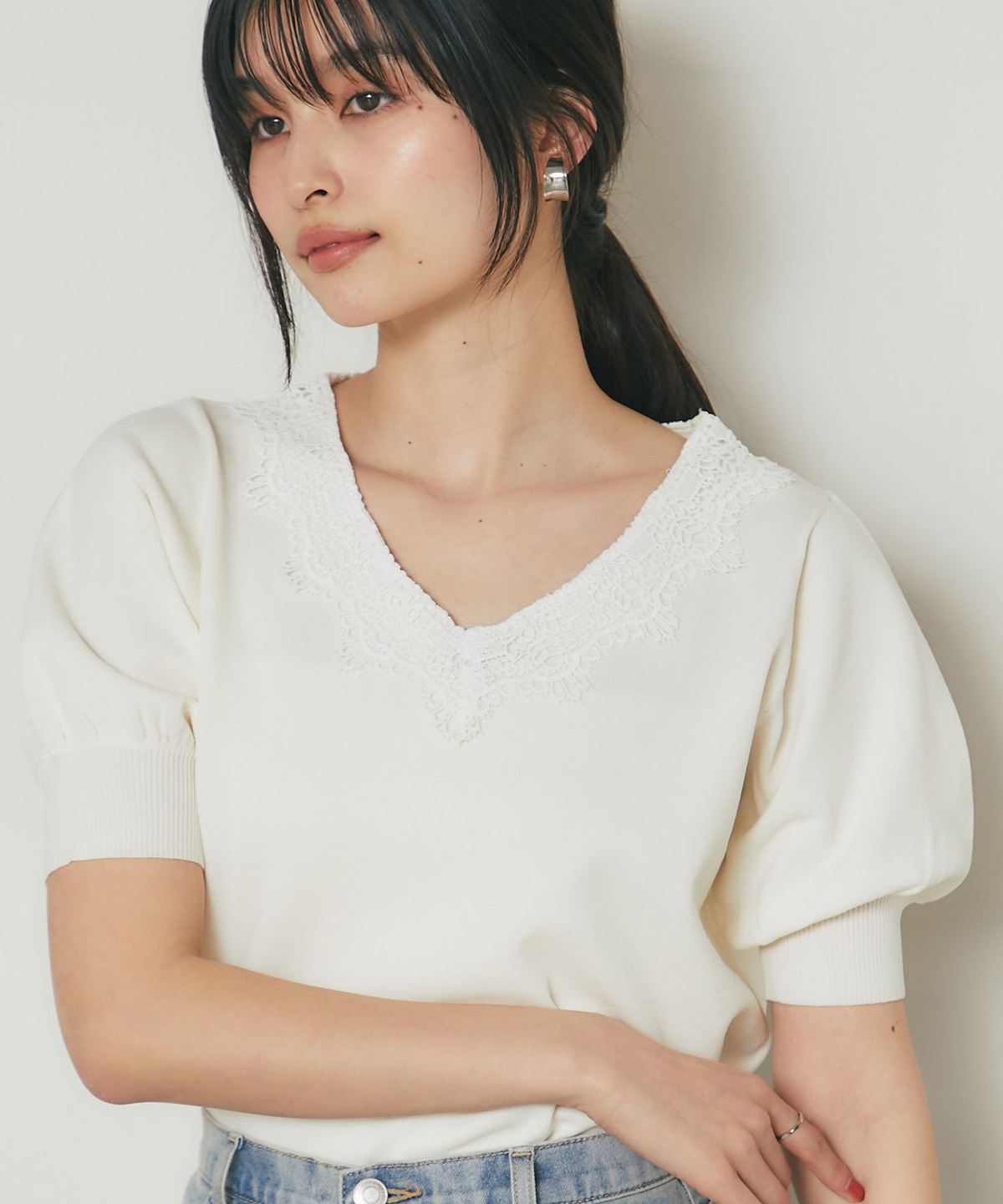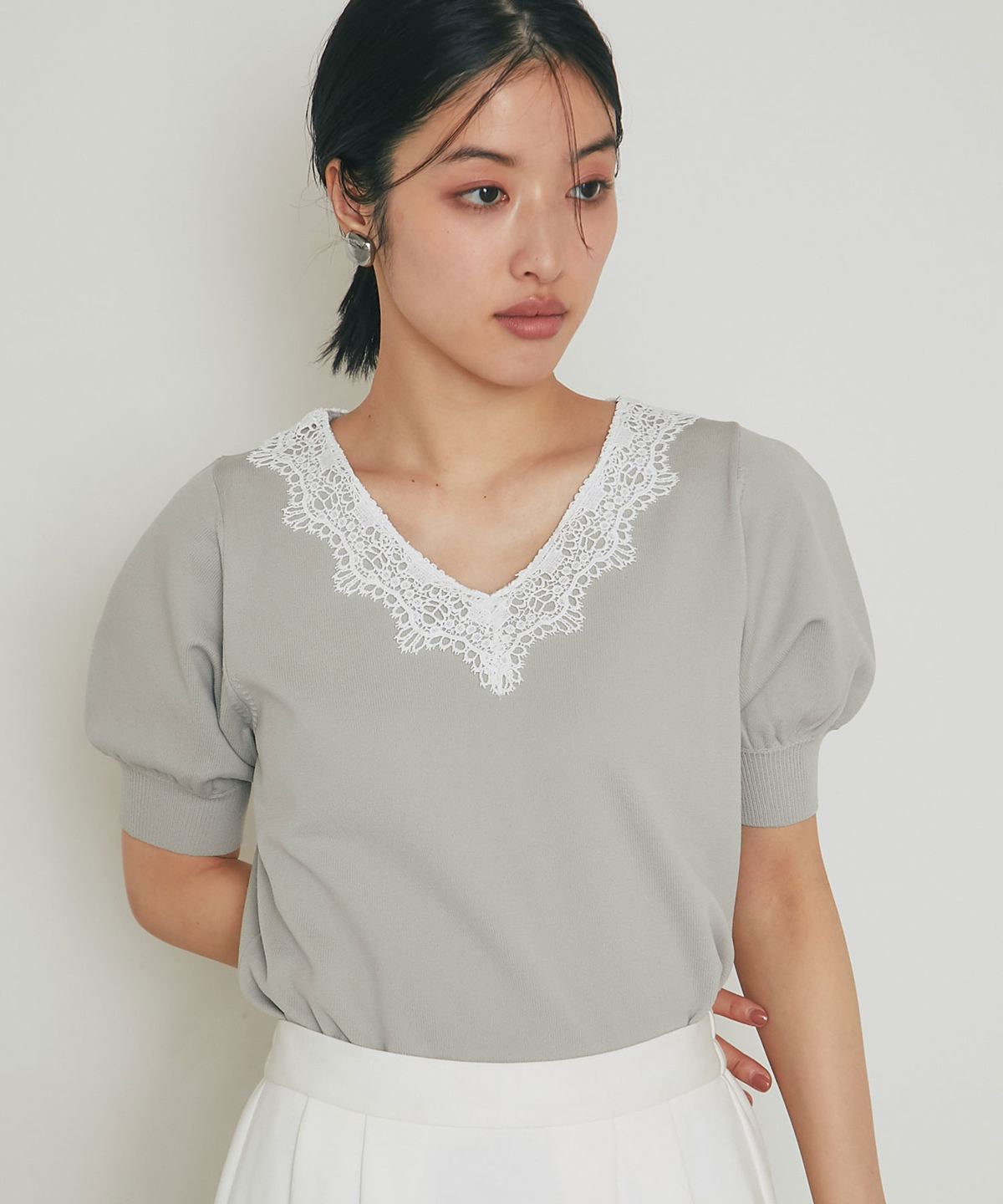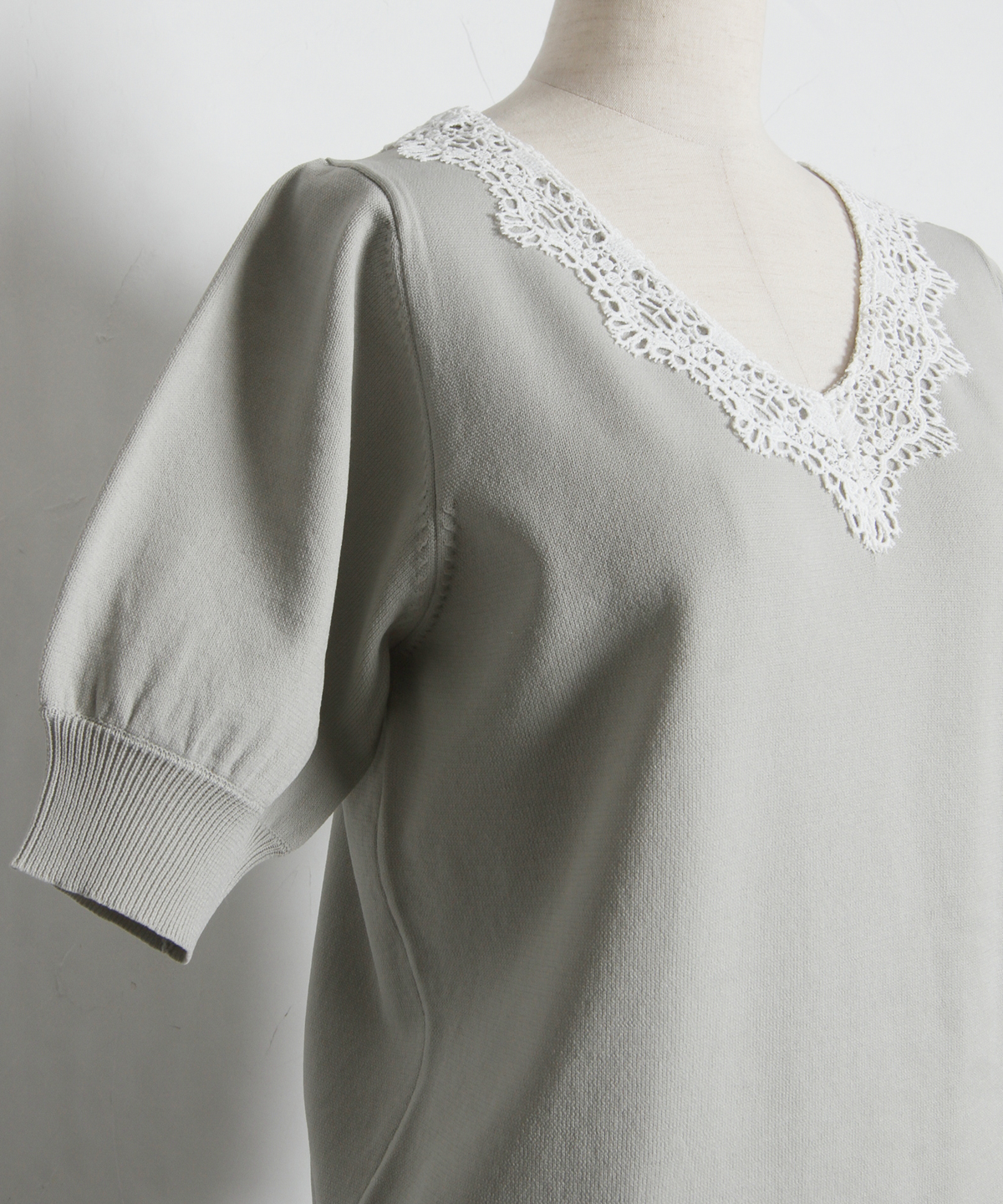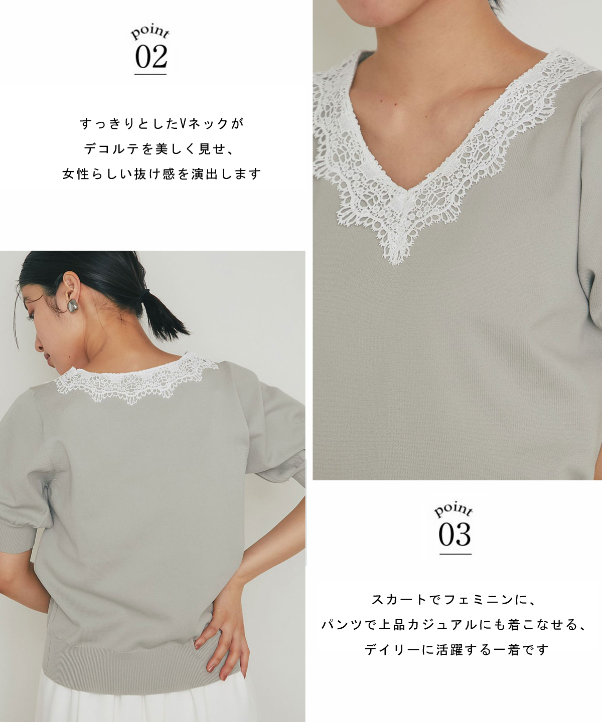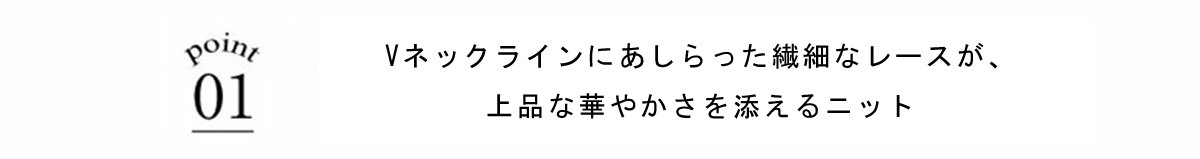 Vネックに沿ってあしらわれた繊細なレースが、デコルテを美しく見せてくれる一枚です。