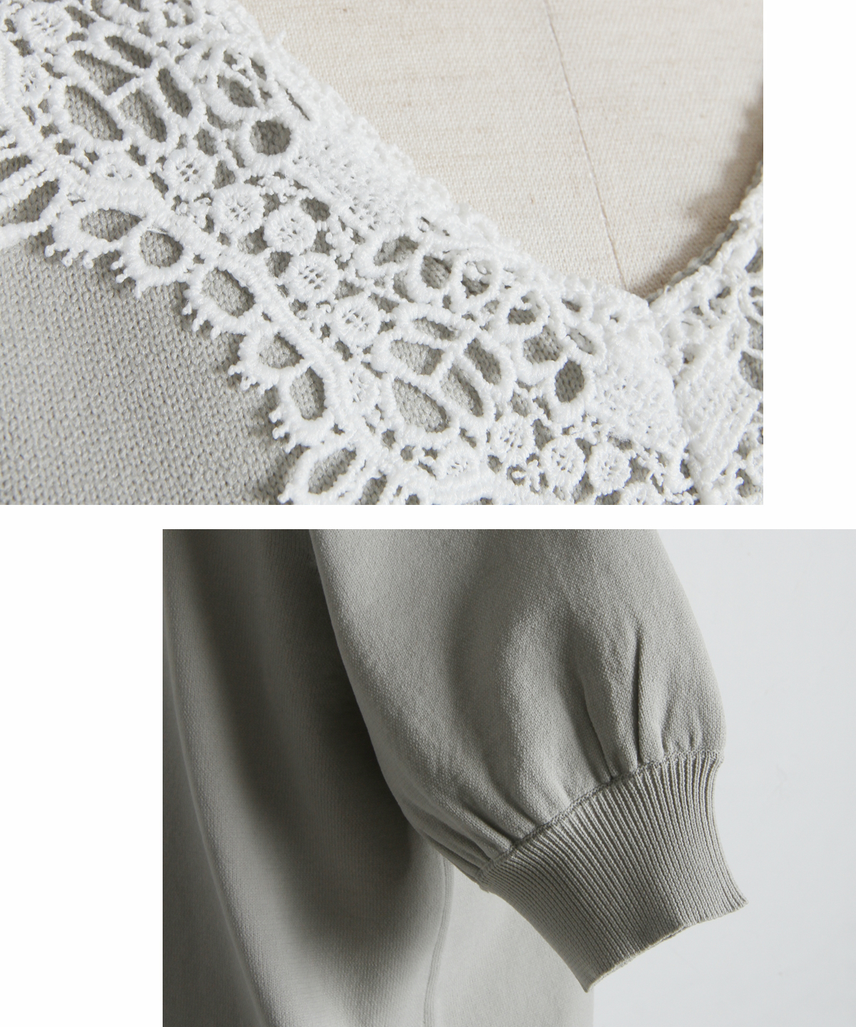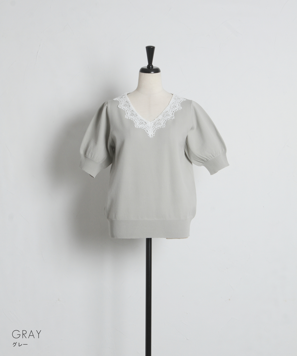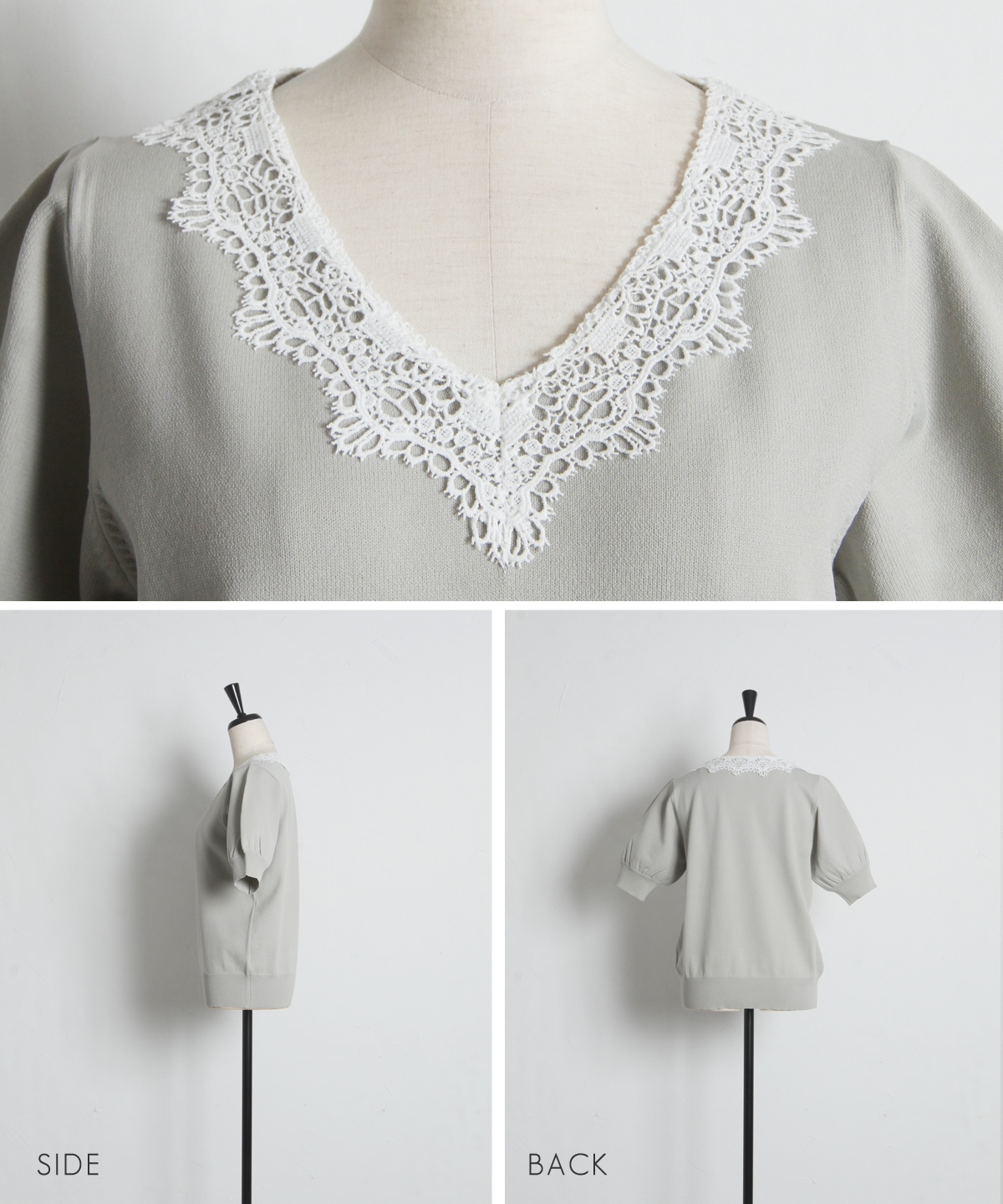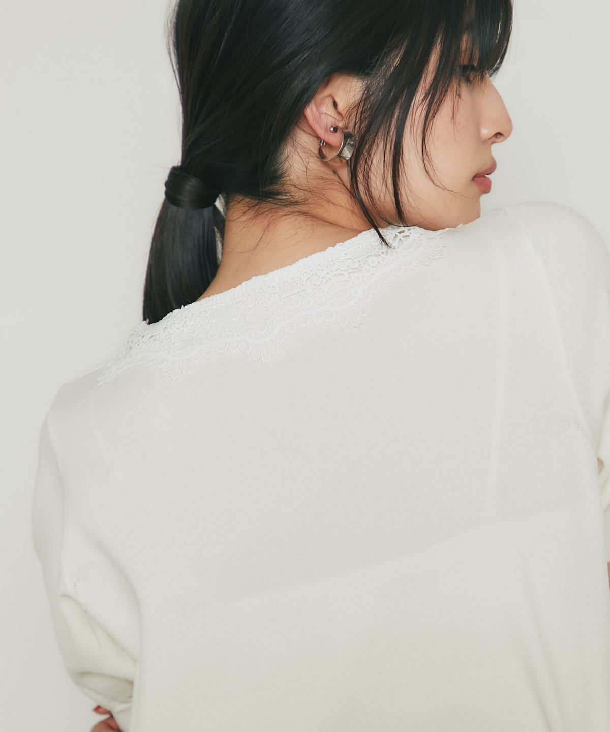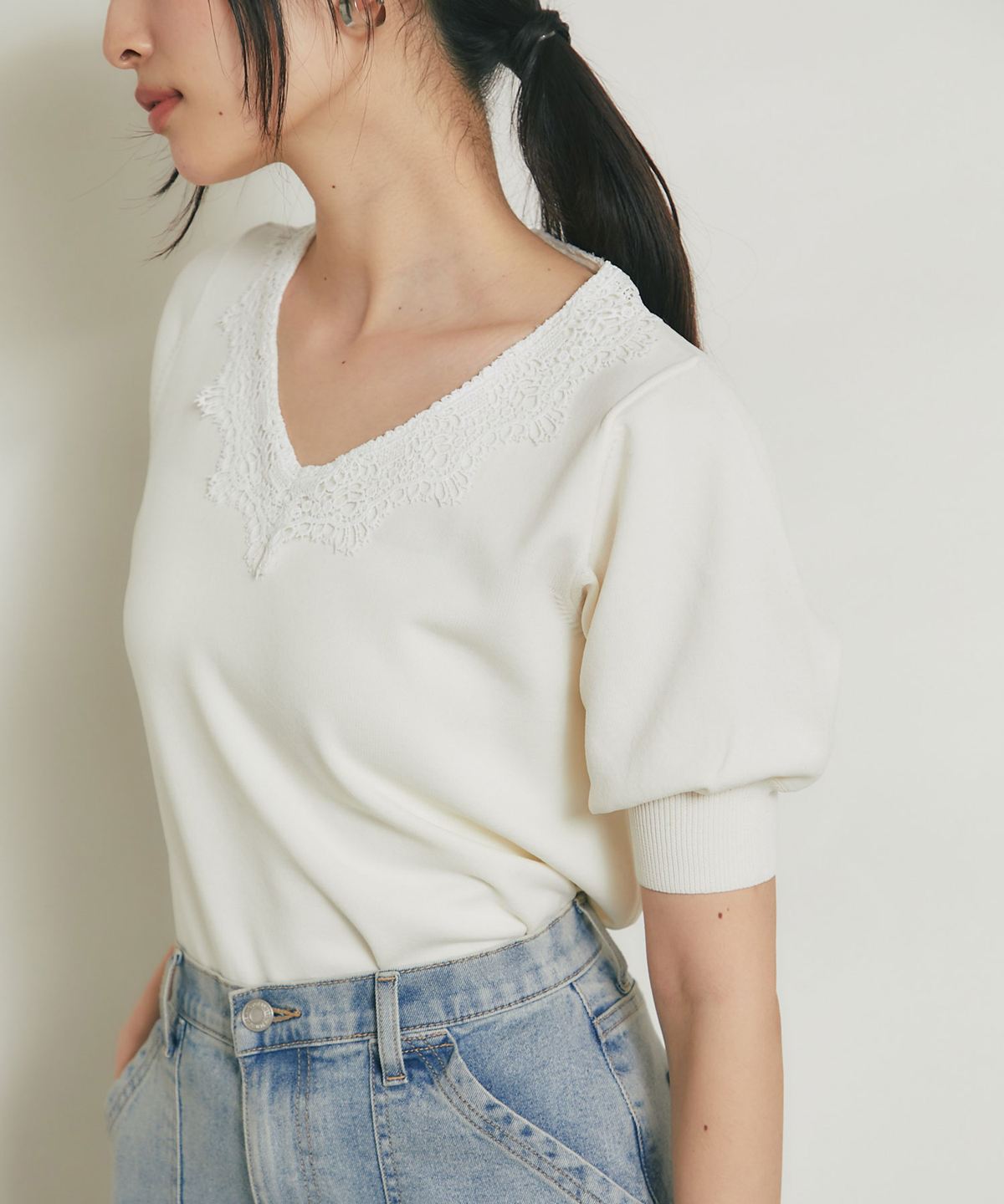 Vネックに沿ってあしらわれた繊細なレースが、デコルテを美しく見せてくれる一枚です。