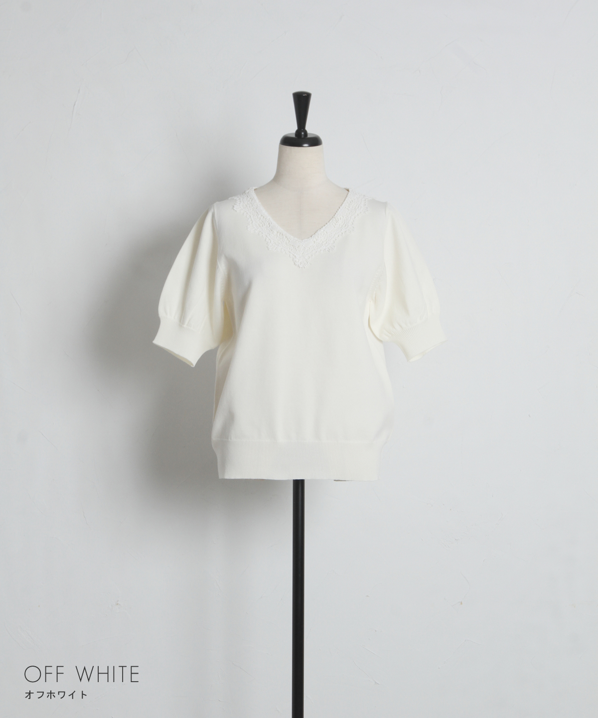 胸元のレース刺繍が顔周りを華やかに彩る、大人フェミニンな半袖ニット。