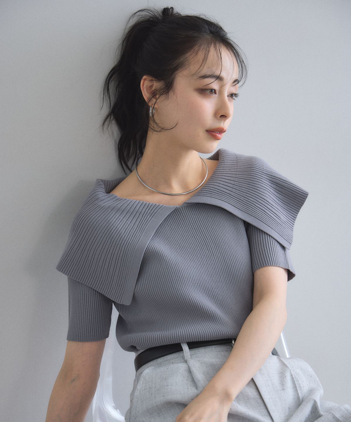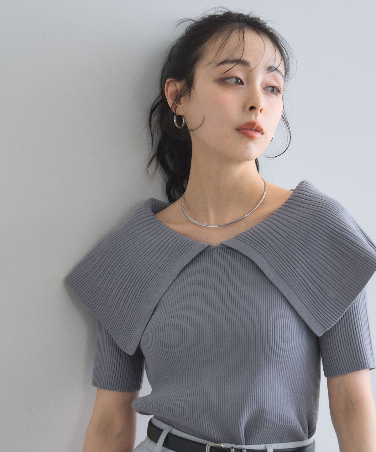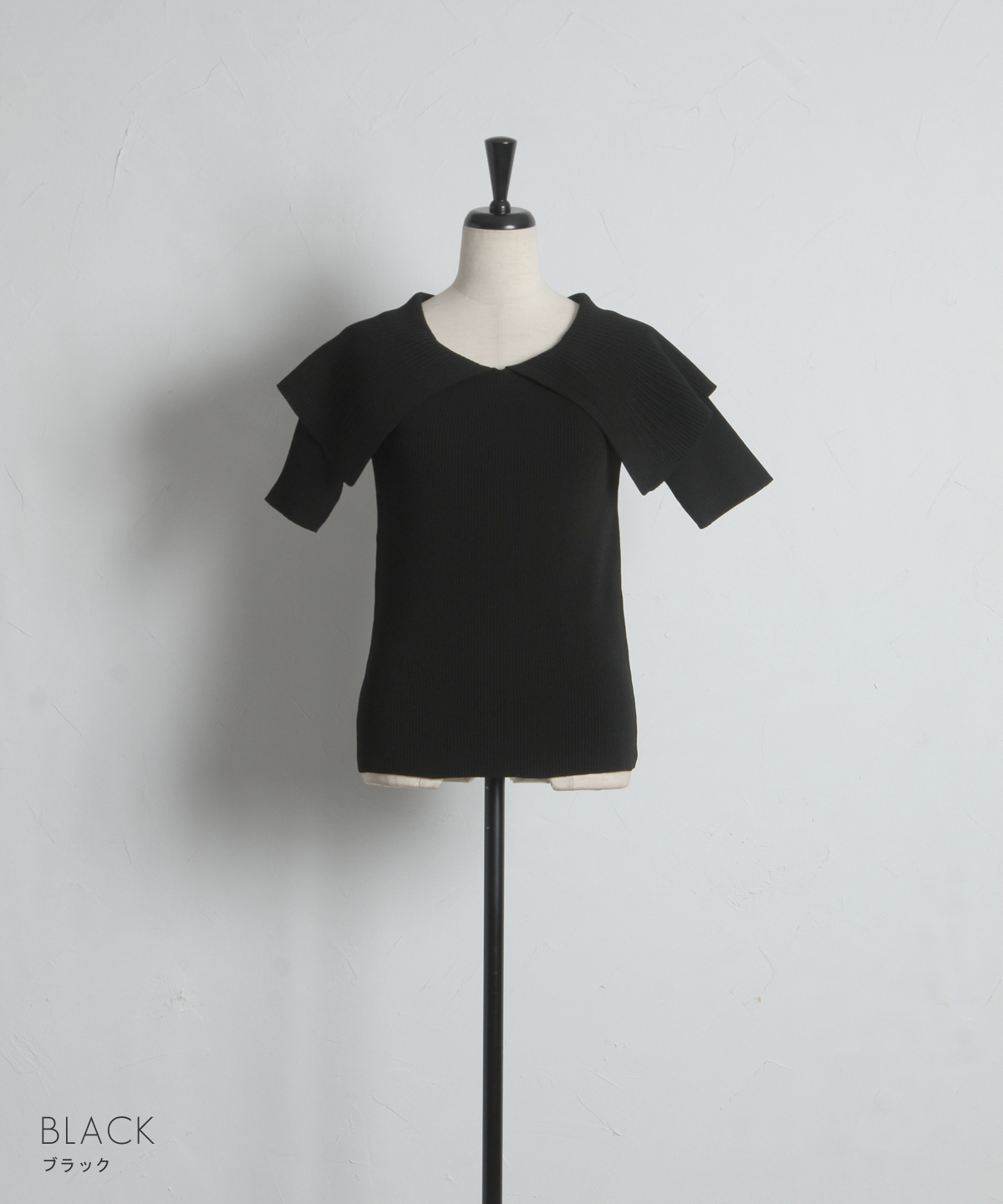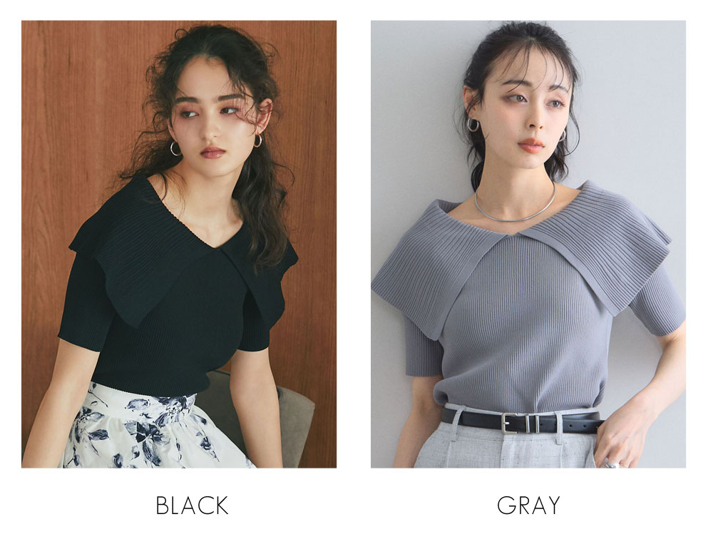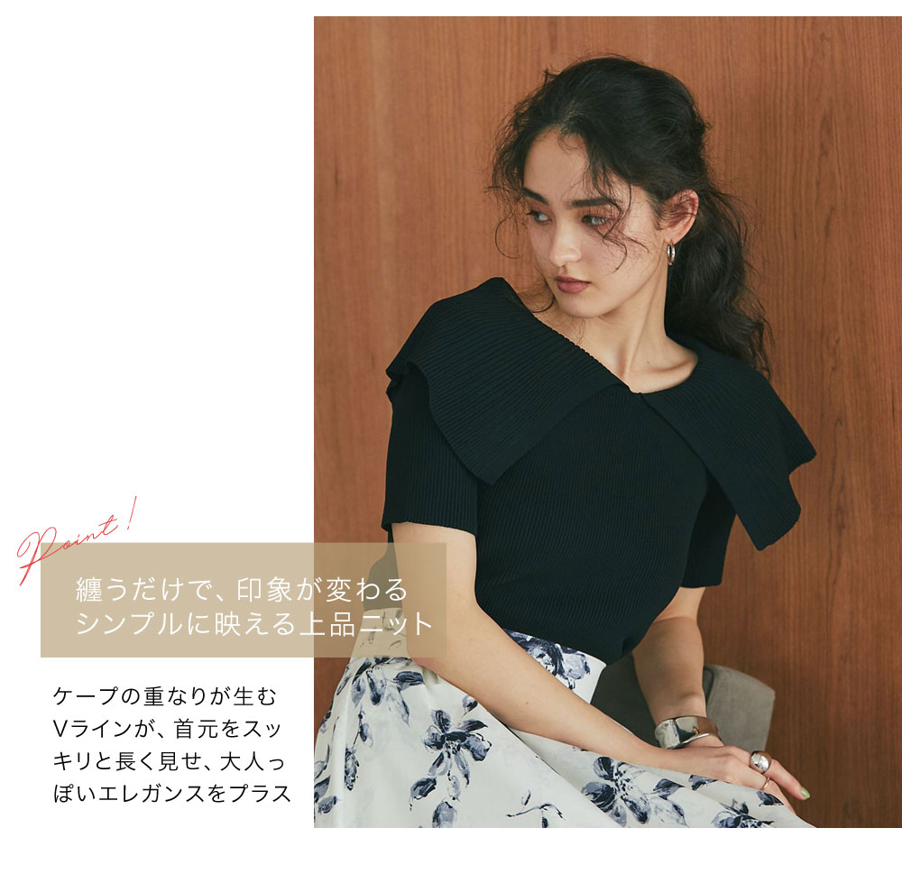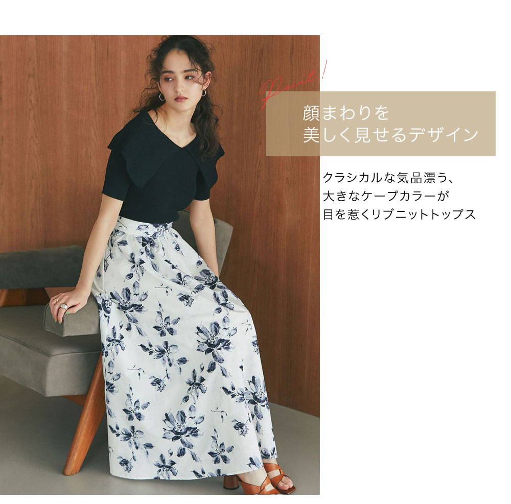 クラシカルな気品漂う、大きなケープカラーが目を惹くリブニットトップス。