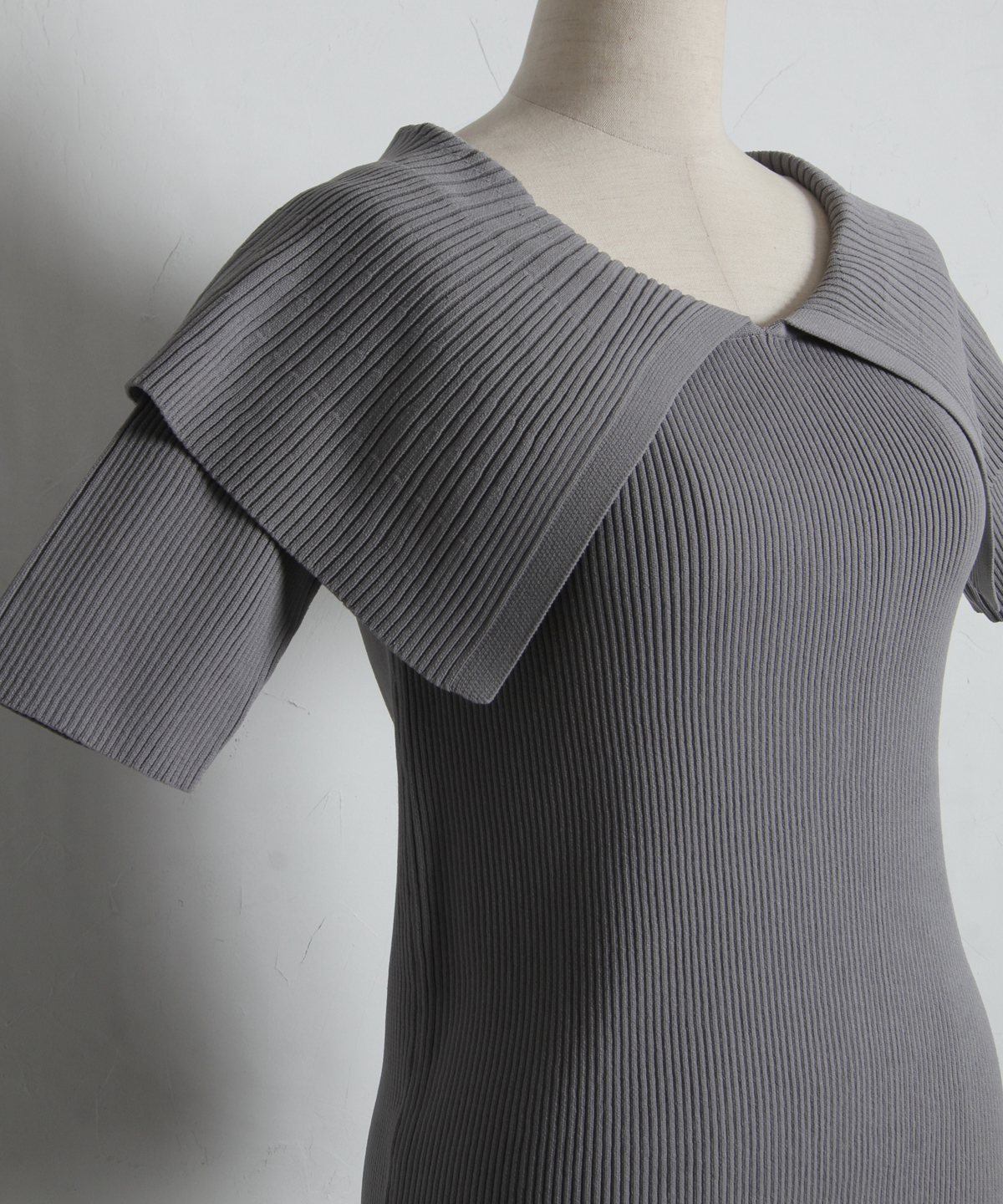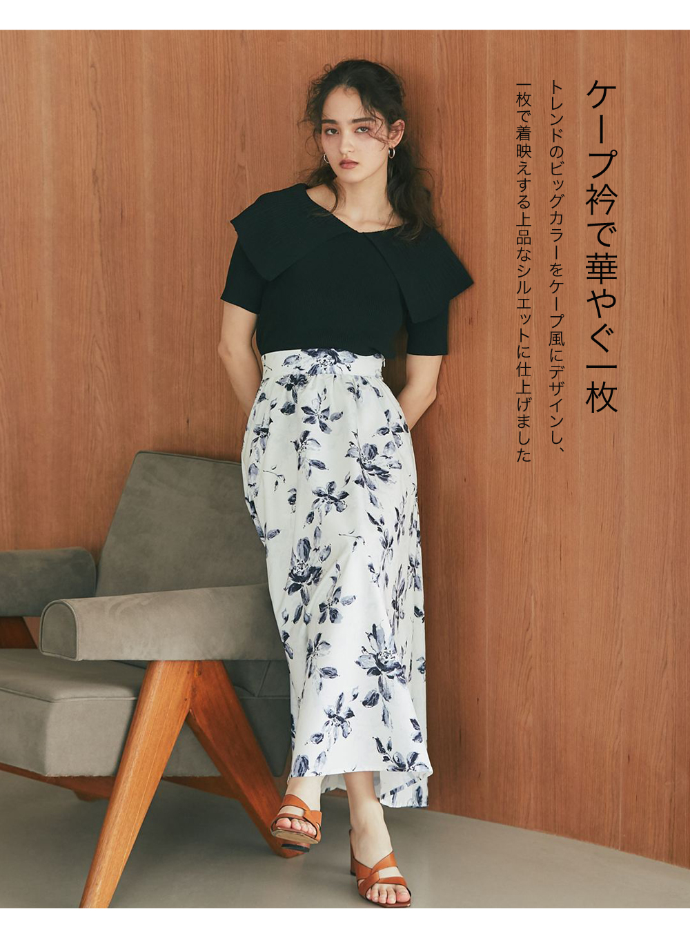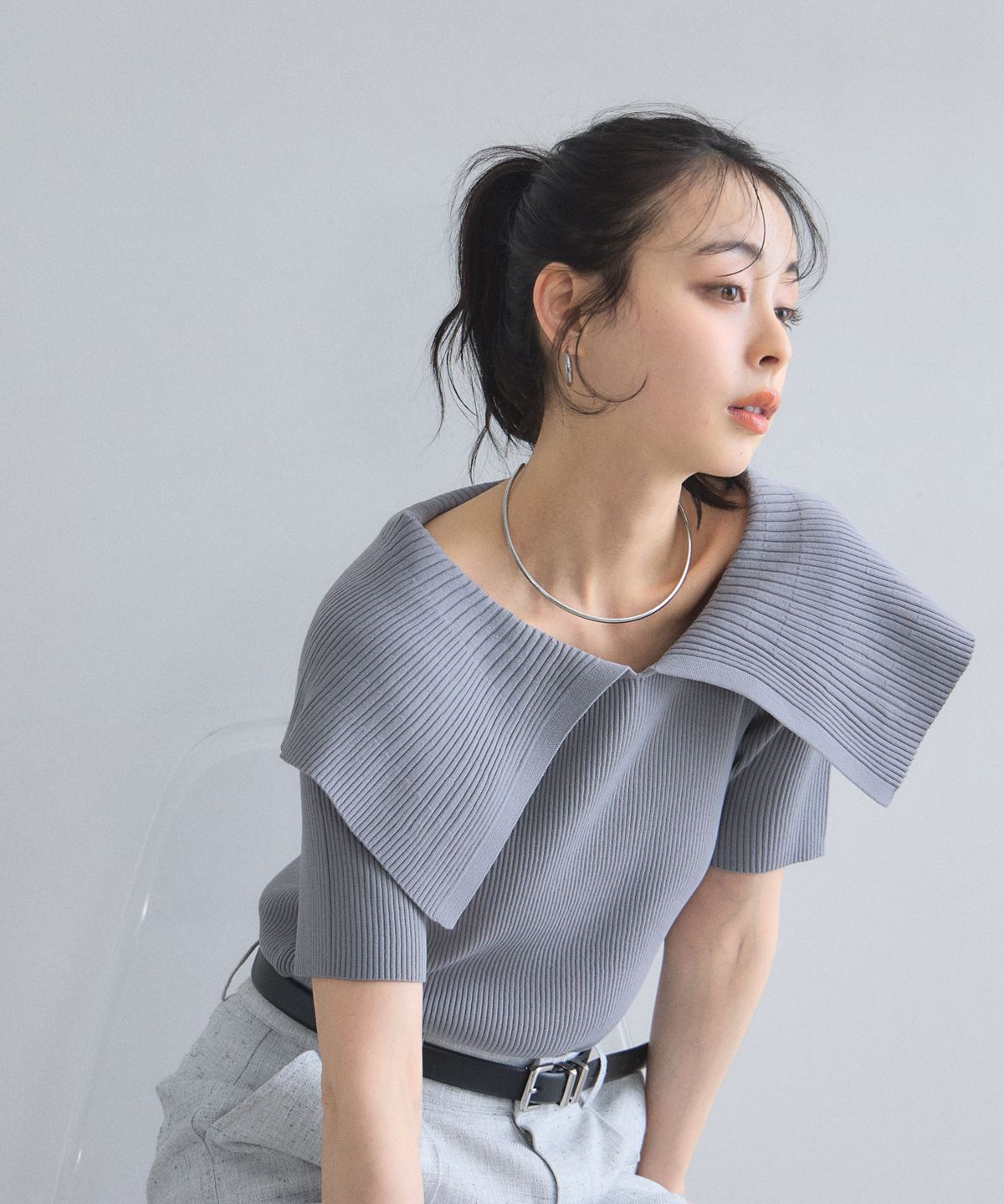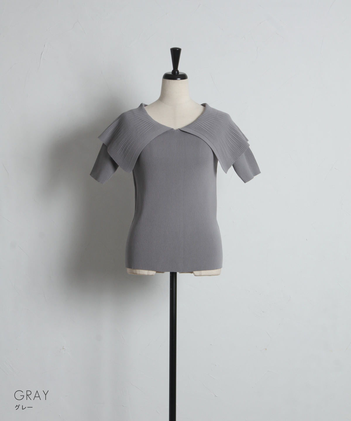 クラシカルな気品漂う、大きなケープカラーが目を惹くリブニットトップス。
