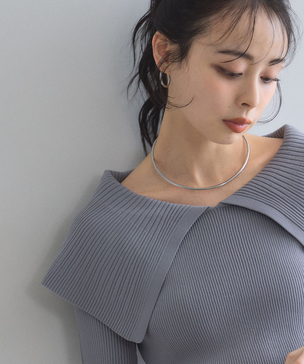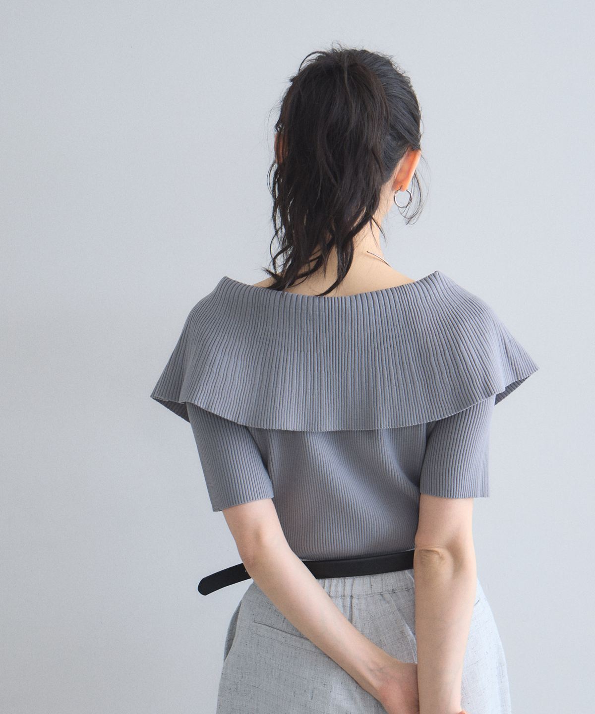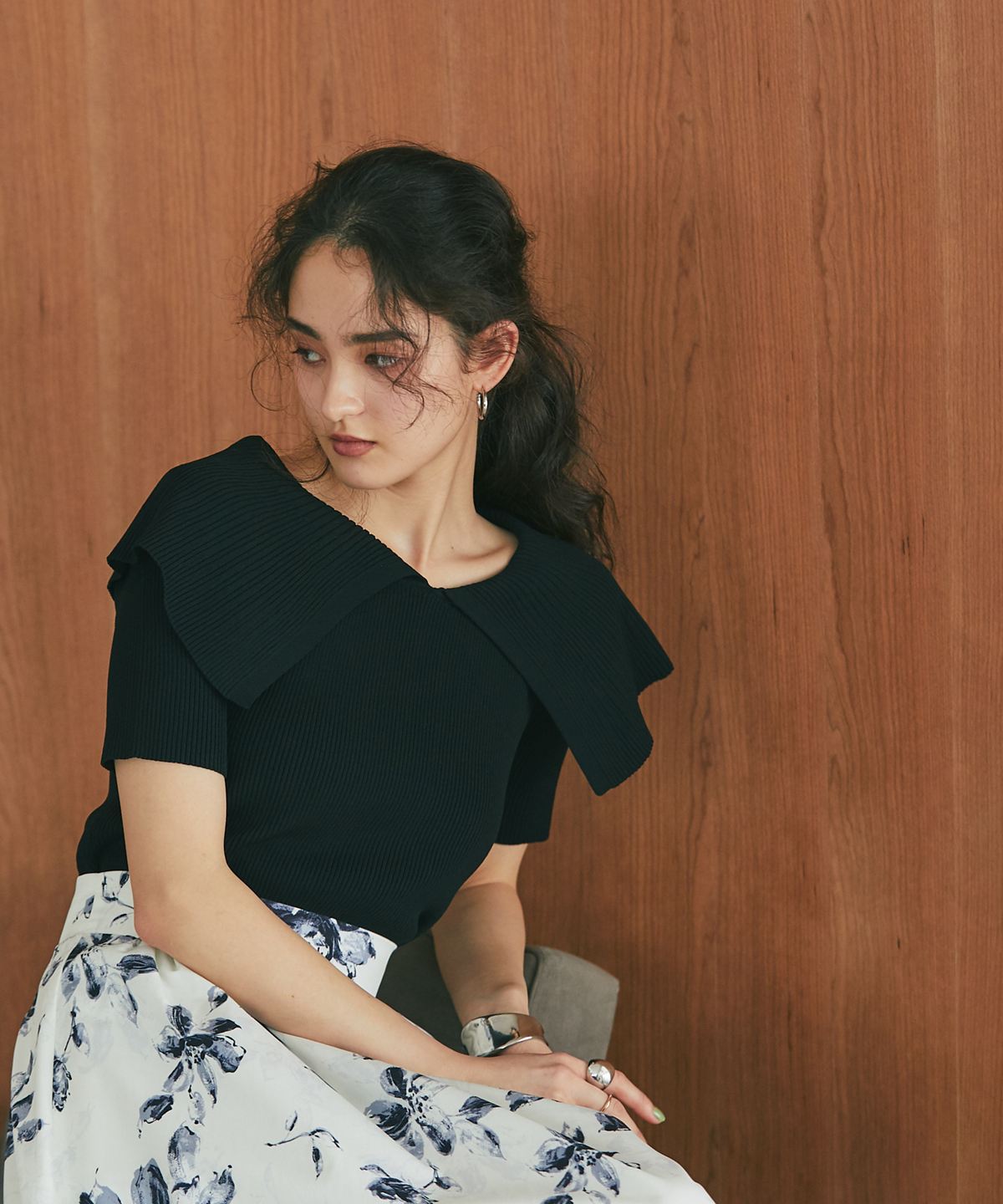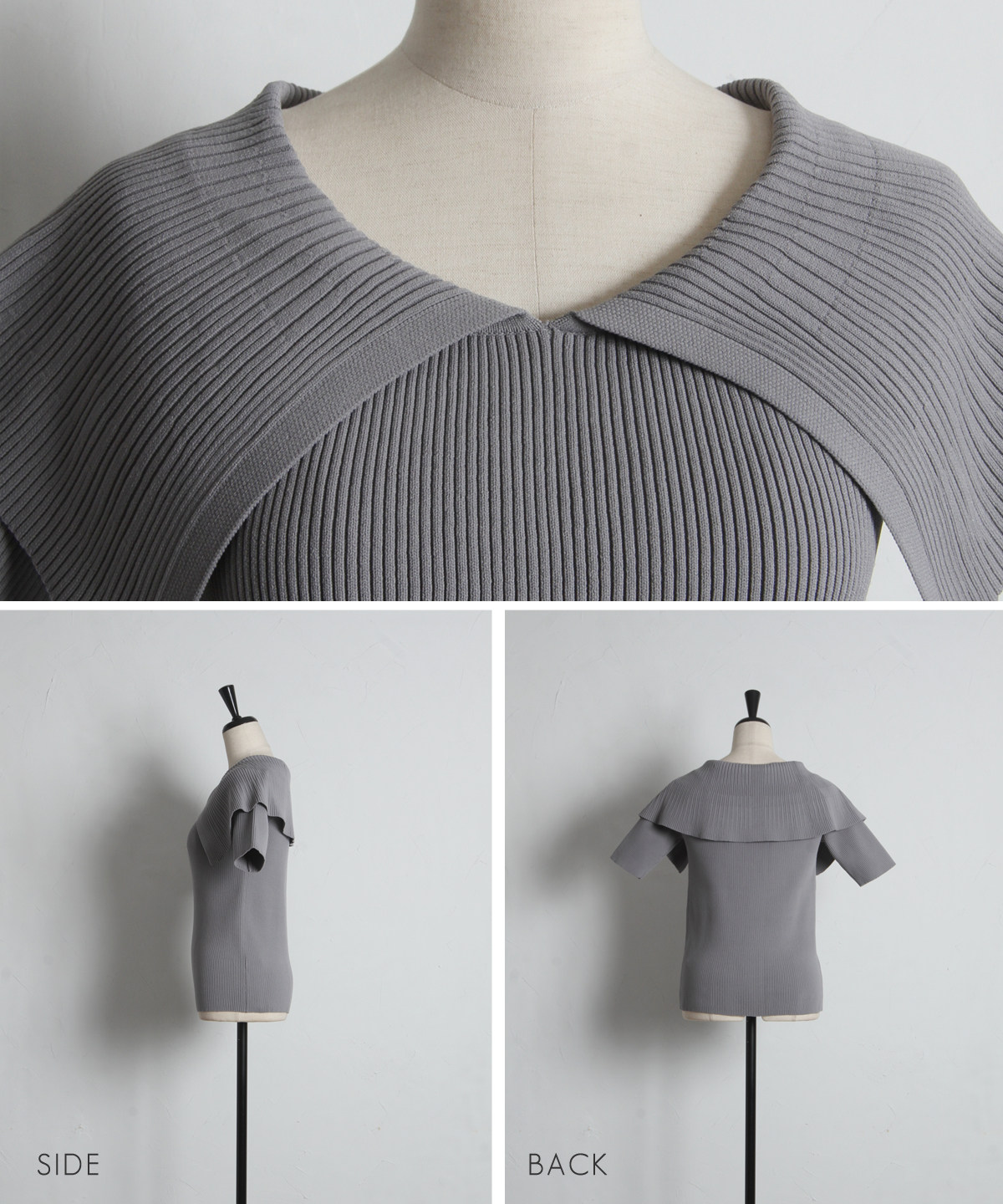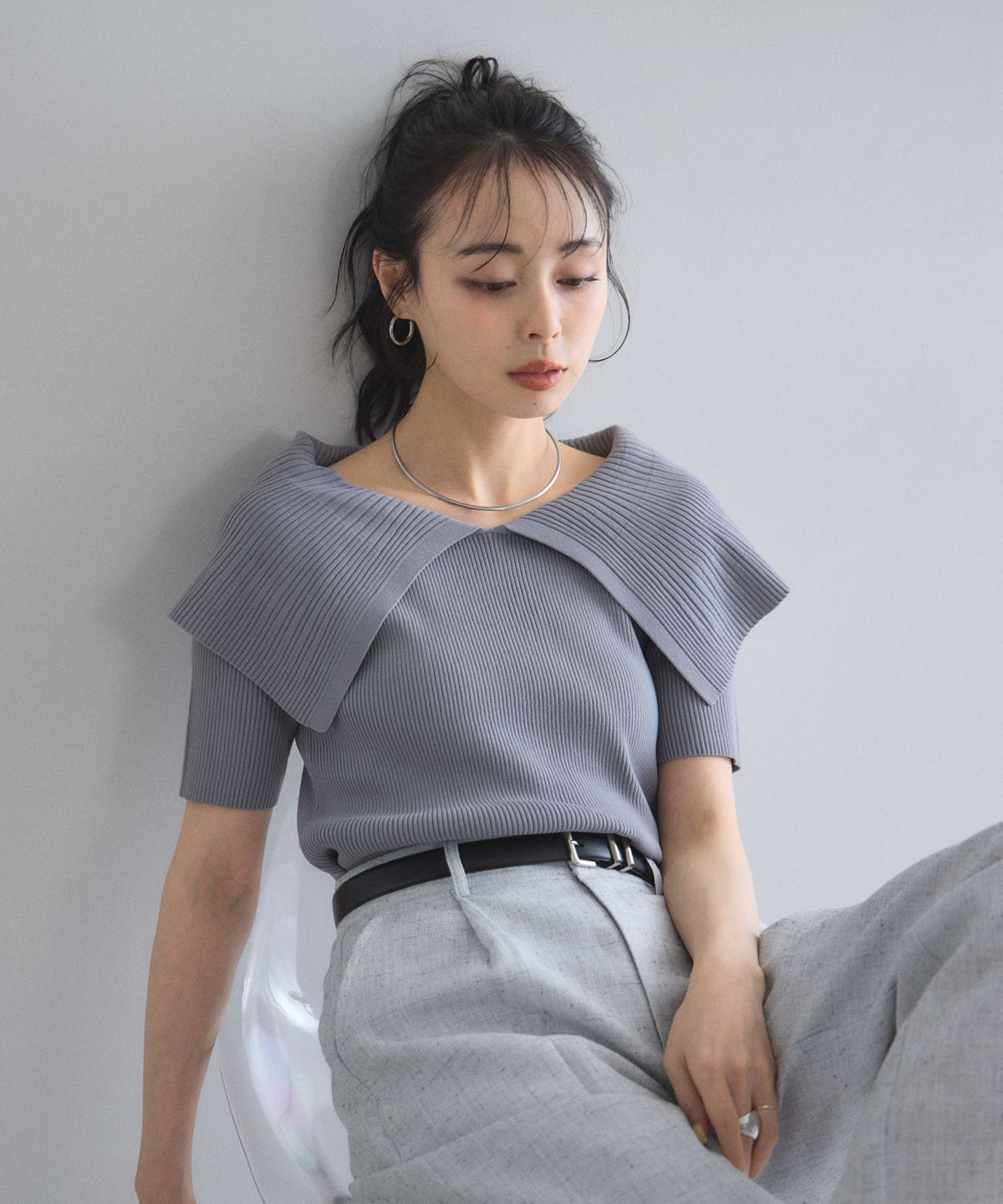 クラシカルな気品漂う、大きなケープカラーが目を惹くリブニットトップス。