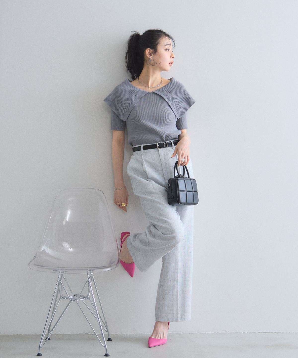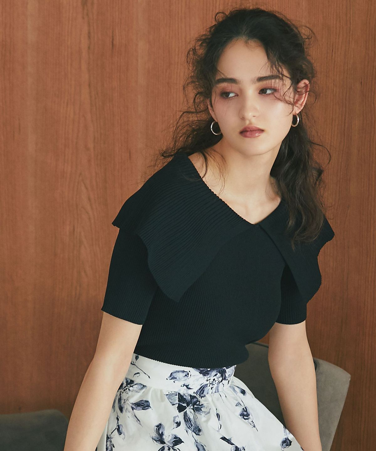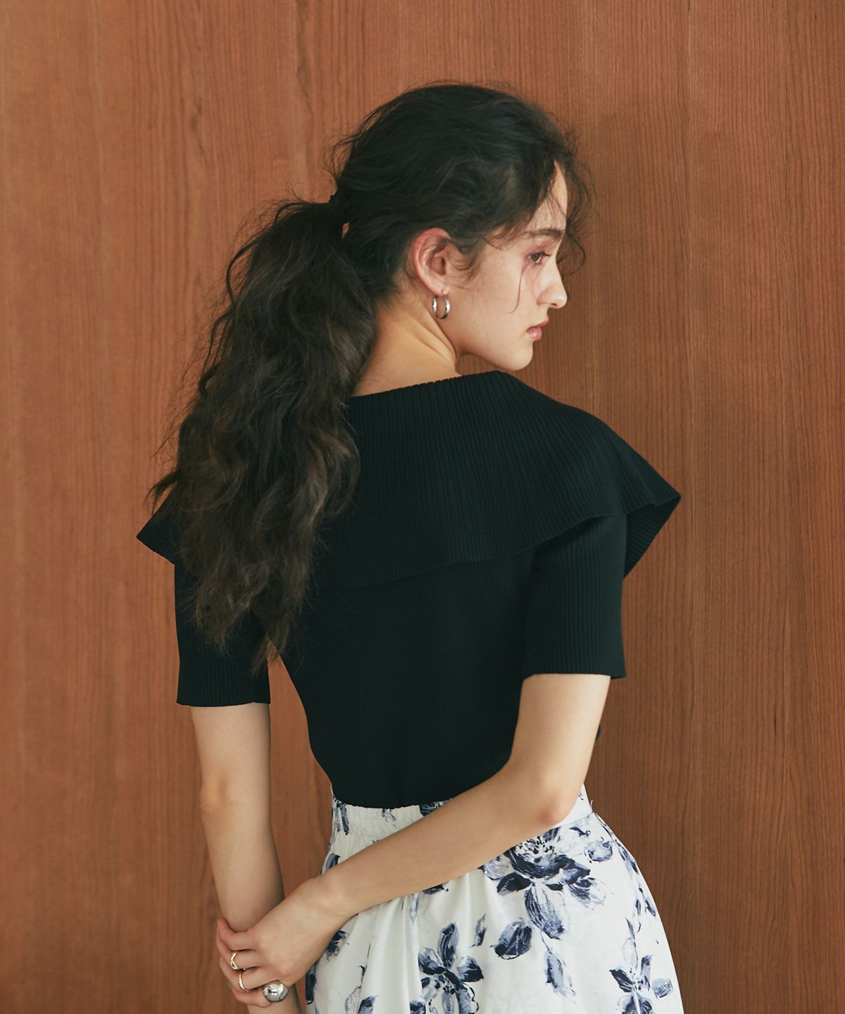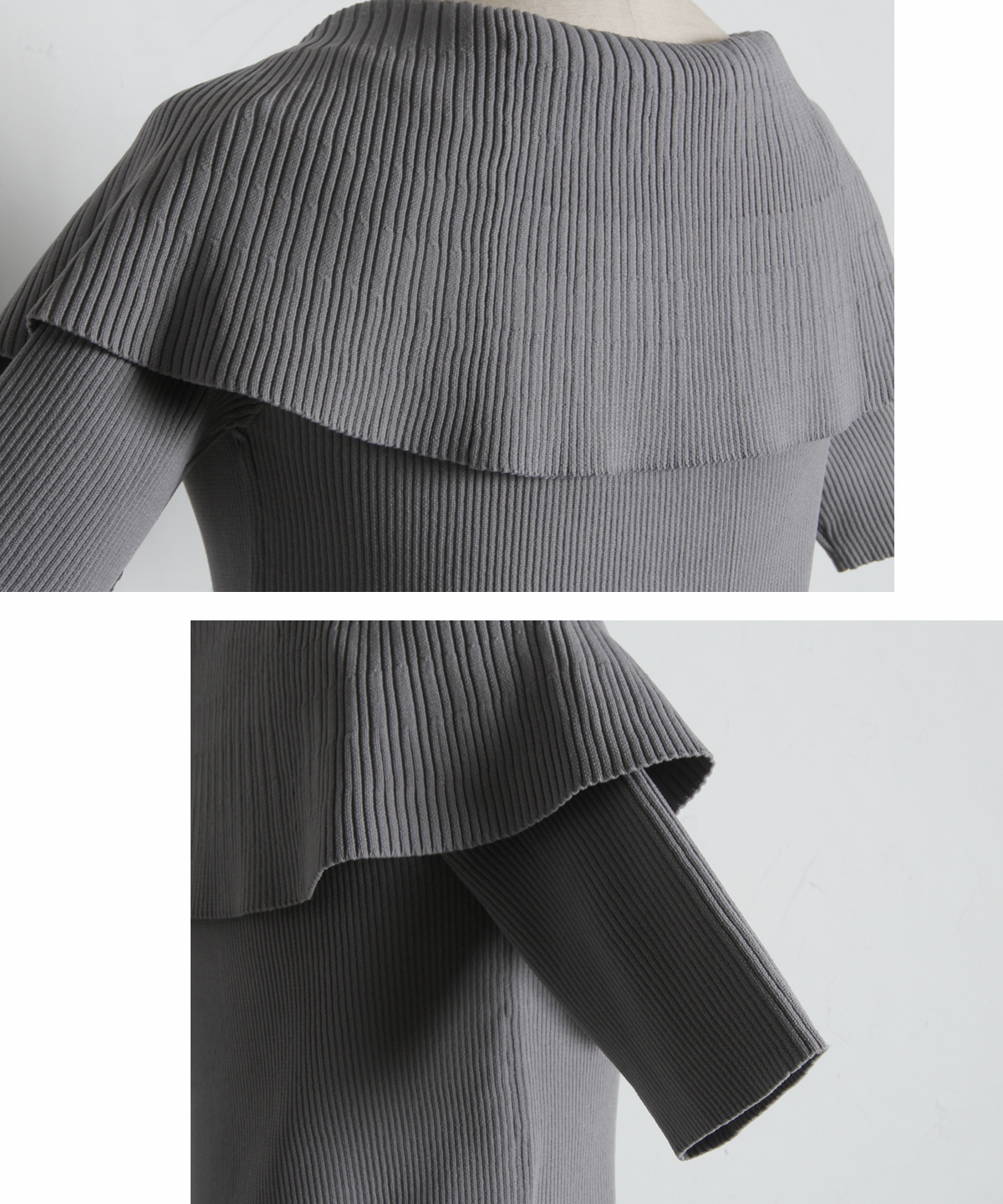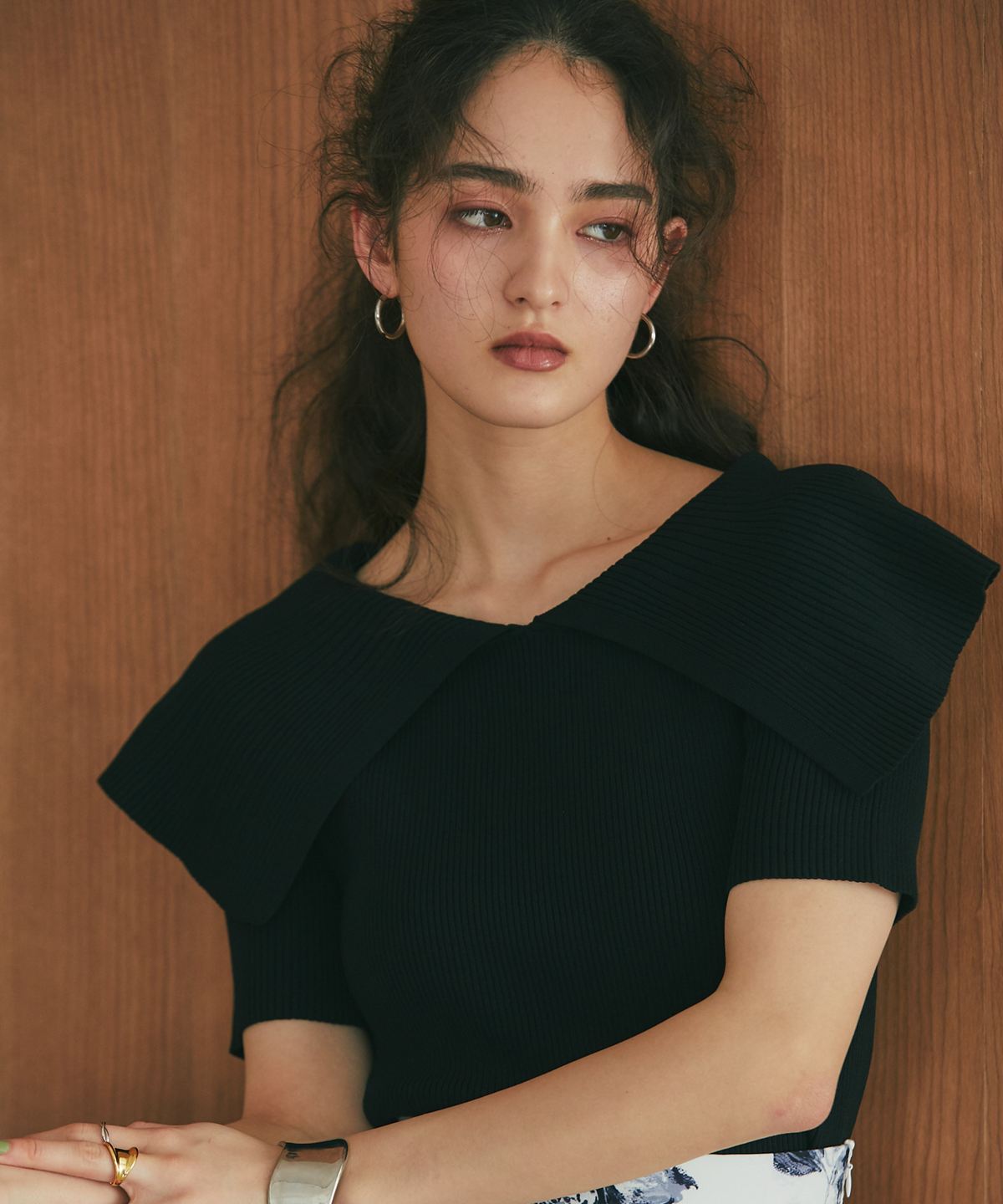 クラシカルな気品漂う、大きなケープカラーが目を惹くリブニットトップス。