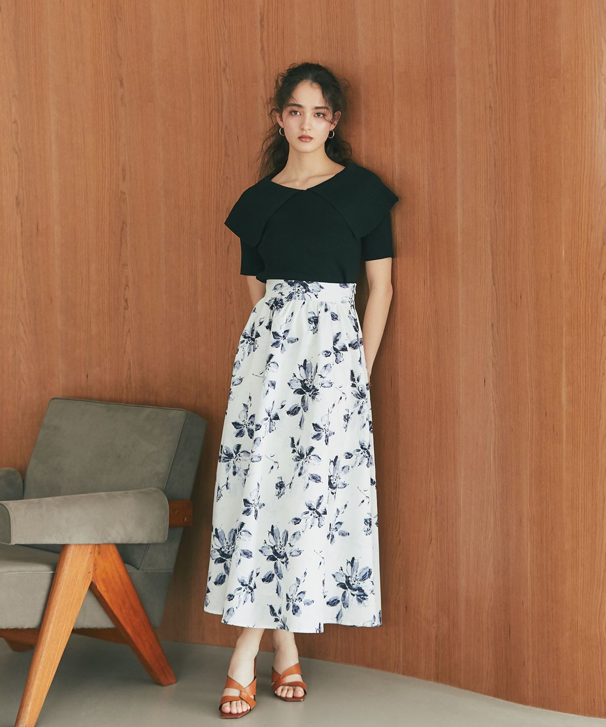 肩周りを優しく覆う大きな襟が、顔周りを華やかに見せてくれます。