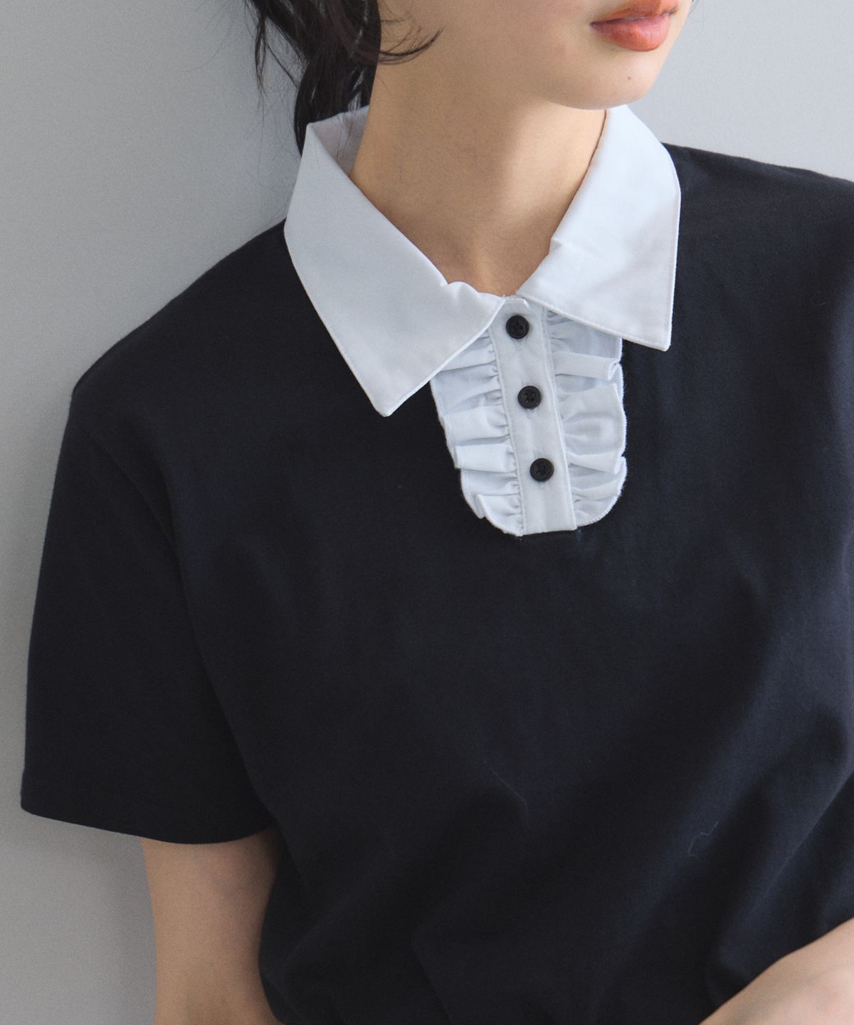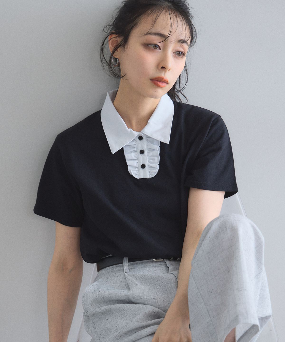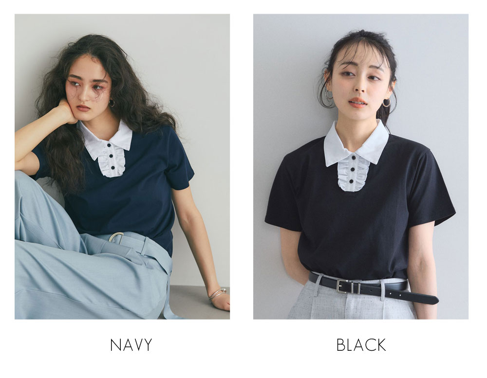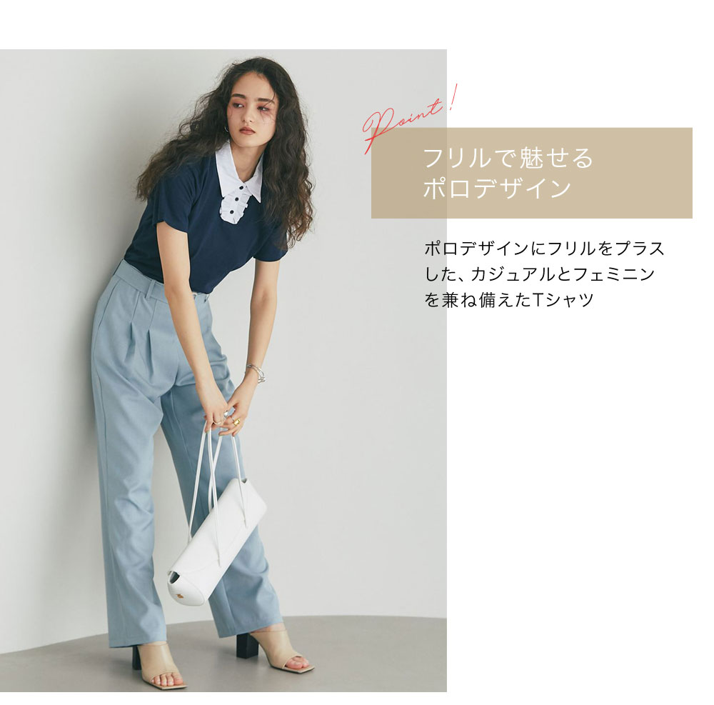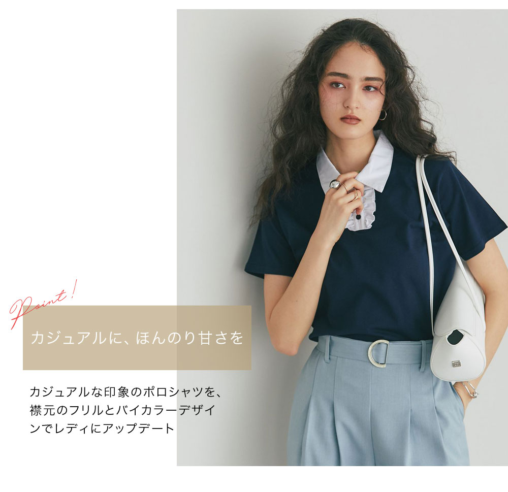 カジュアルな印象のポロシャツを、襟元のフリルとバイカラーデザインでレディにアップデート。