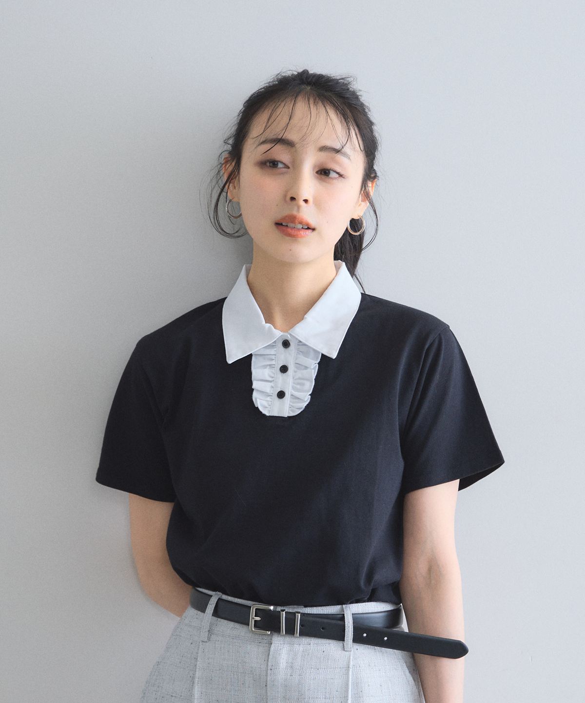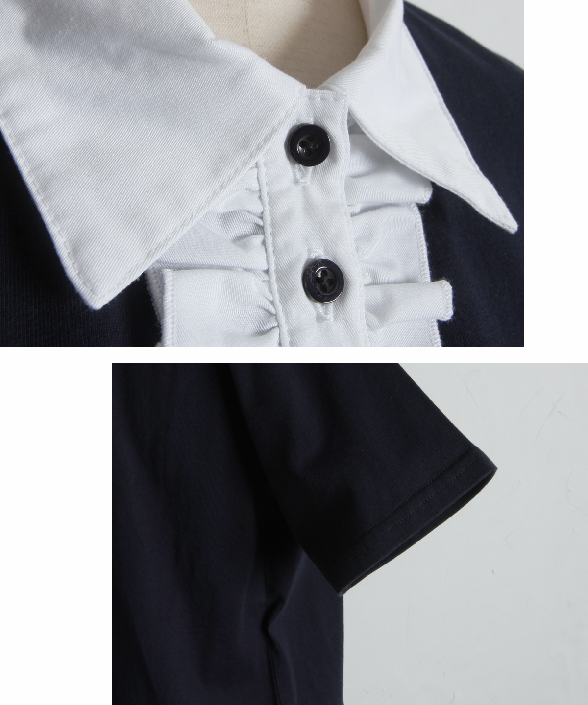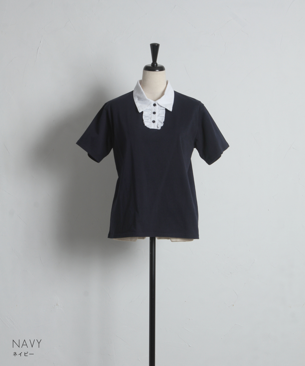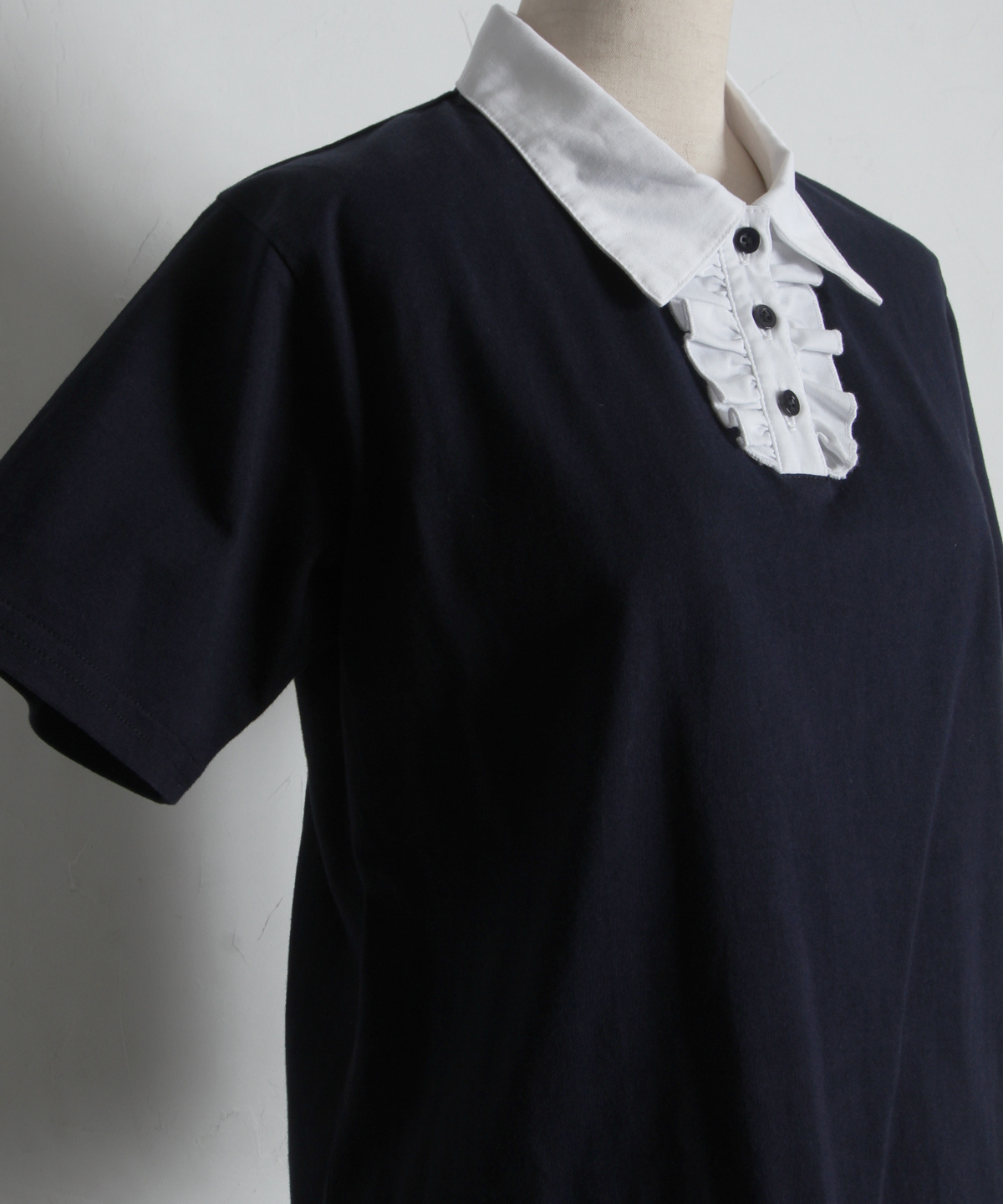 カジュアルな印象のポロシャツを、襟元のフリルとバイカラーデザインでレディにアップデート。