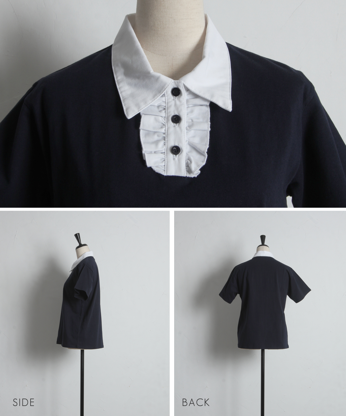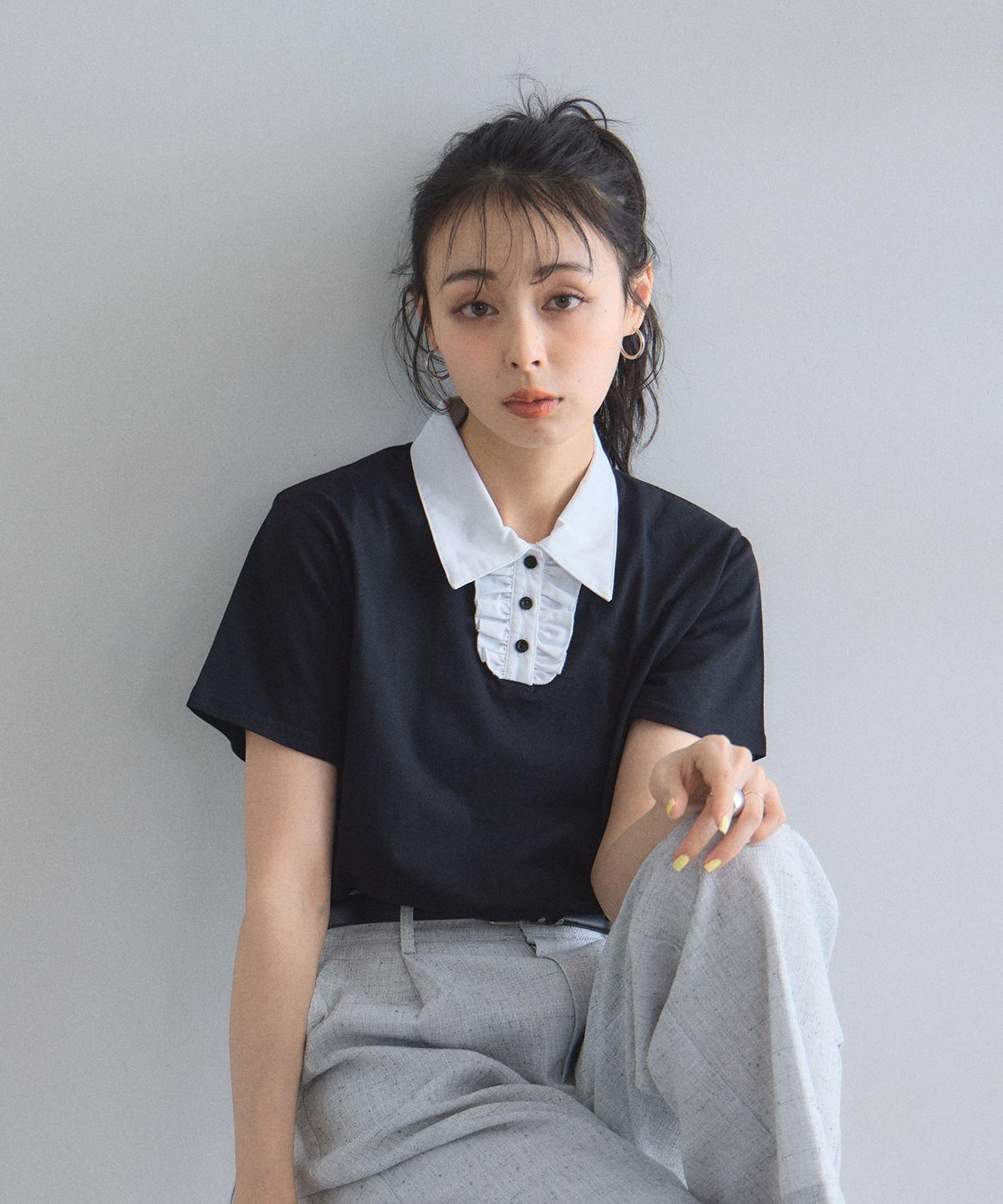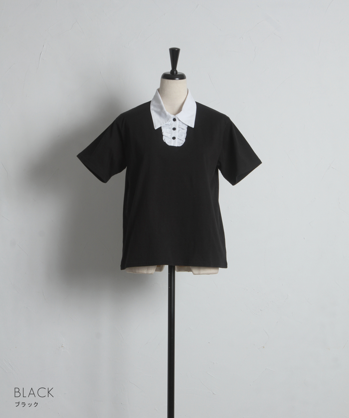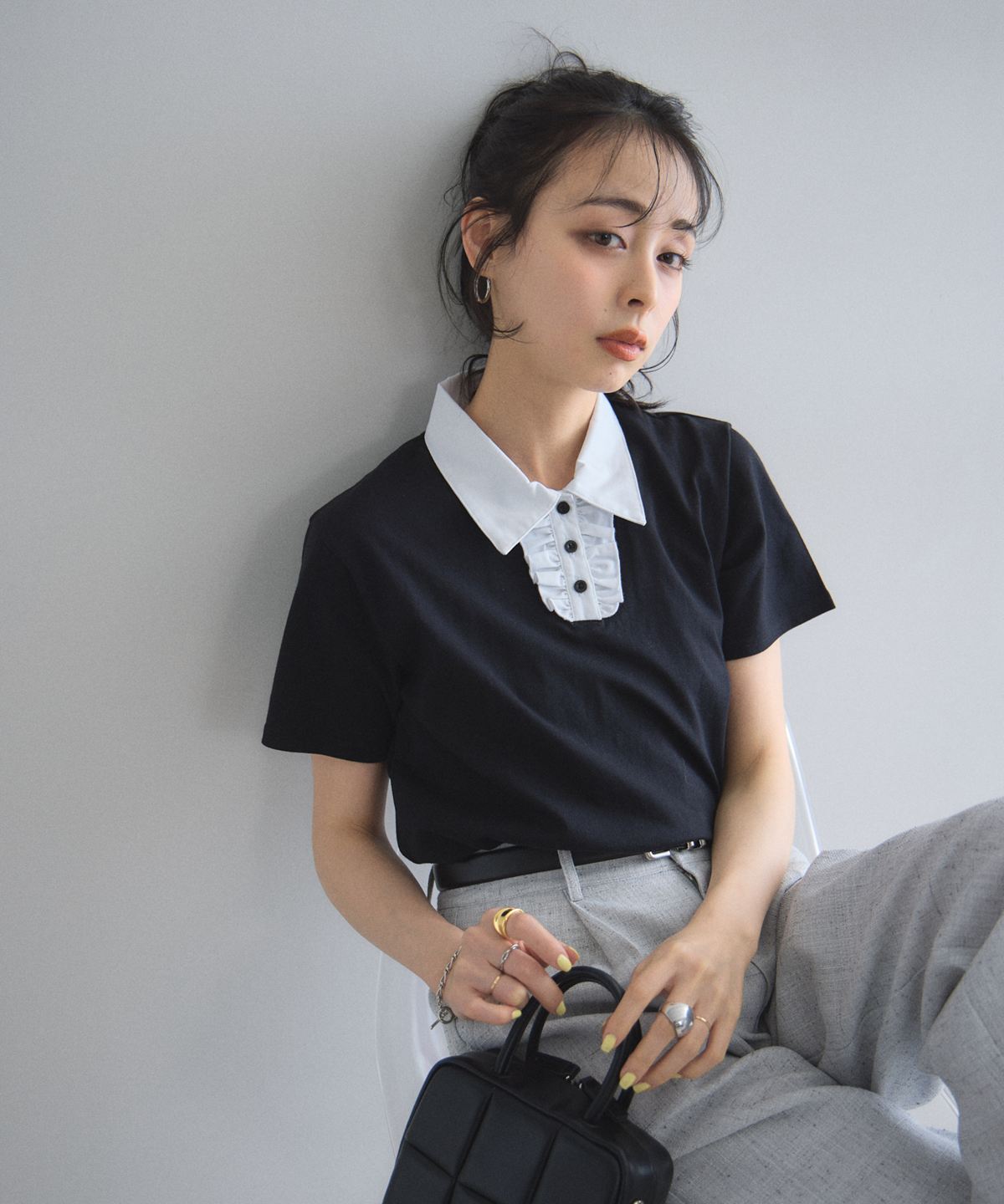 カジュアルな印象のポロシャツを、襟元のフリルとバイカラーデザインでレディにアップデート。