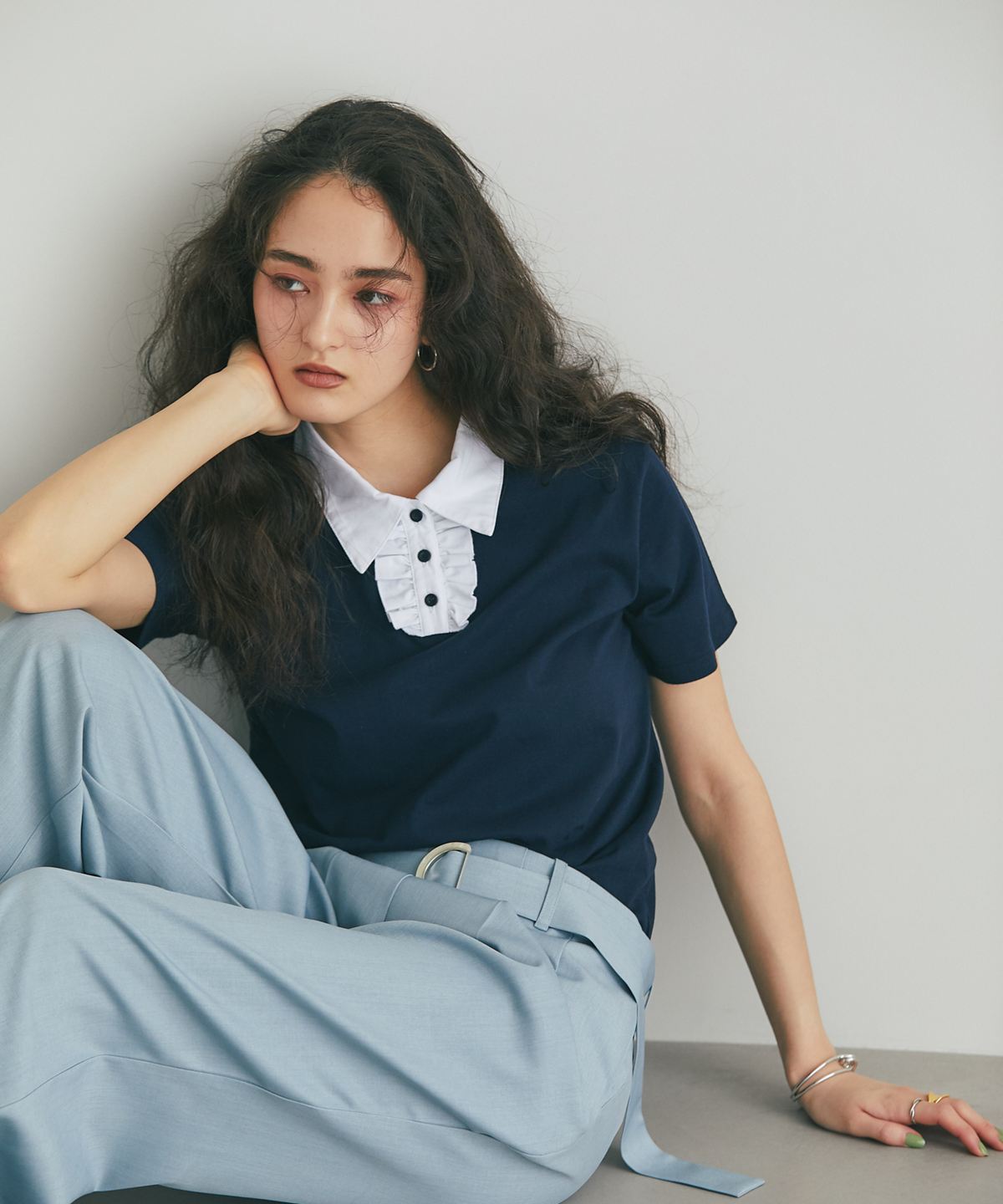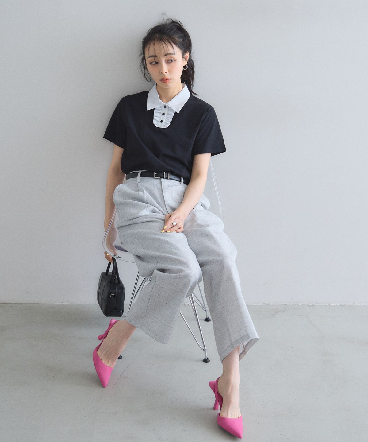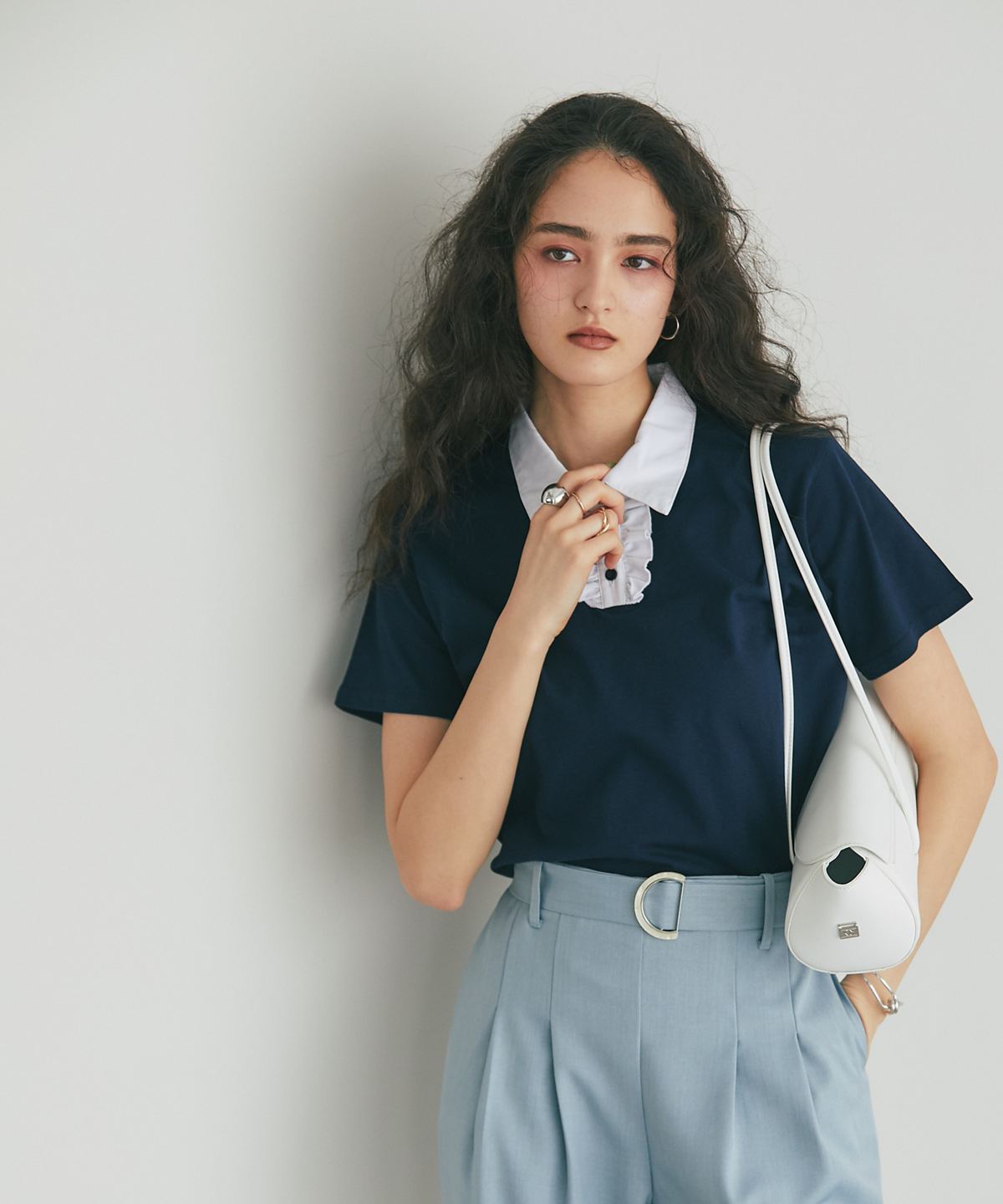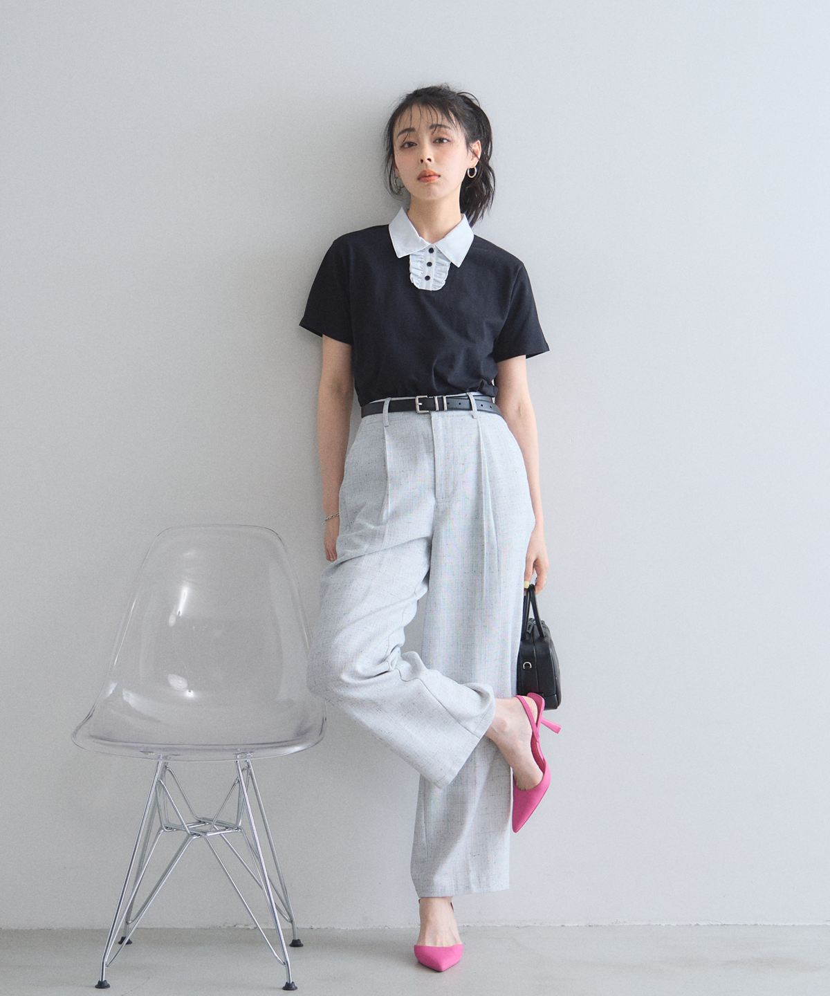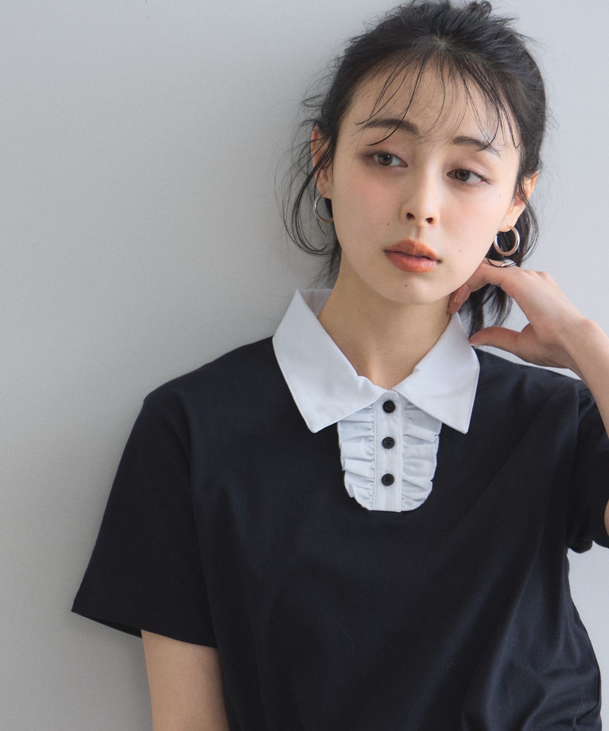 カジュアルな印象のポロシャツを、襟元のフリルとバイカラーデザインでレディにアップデート。