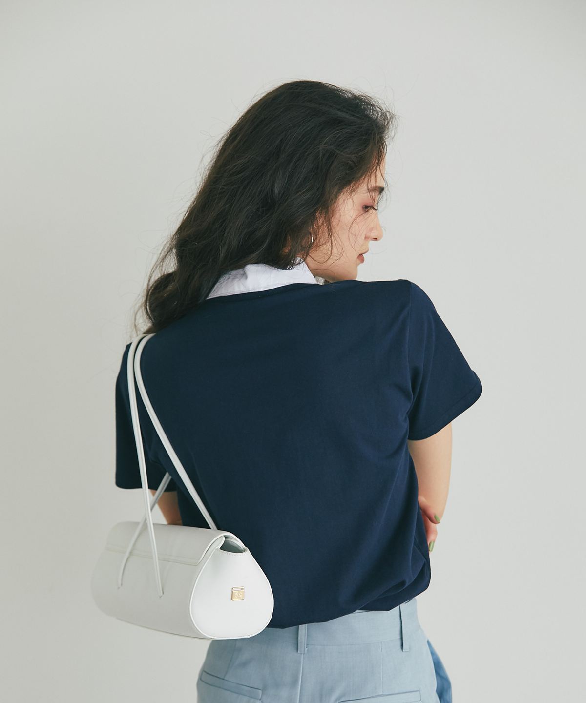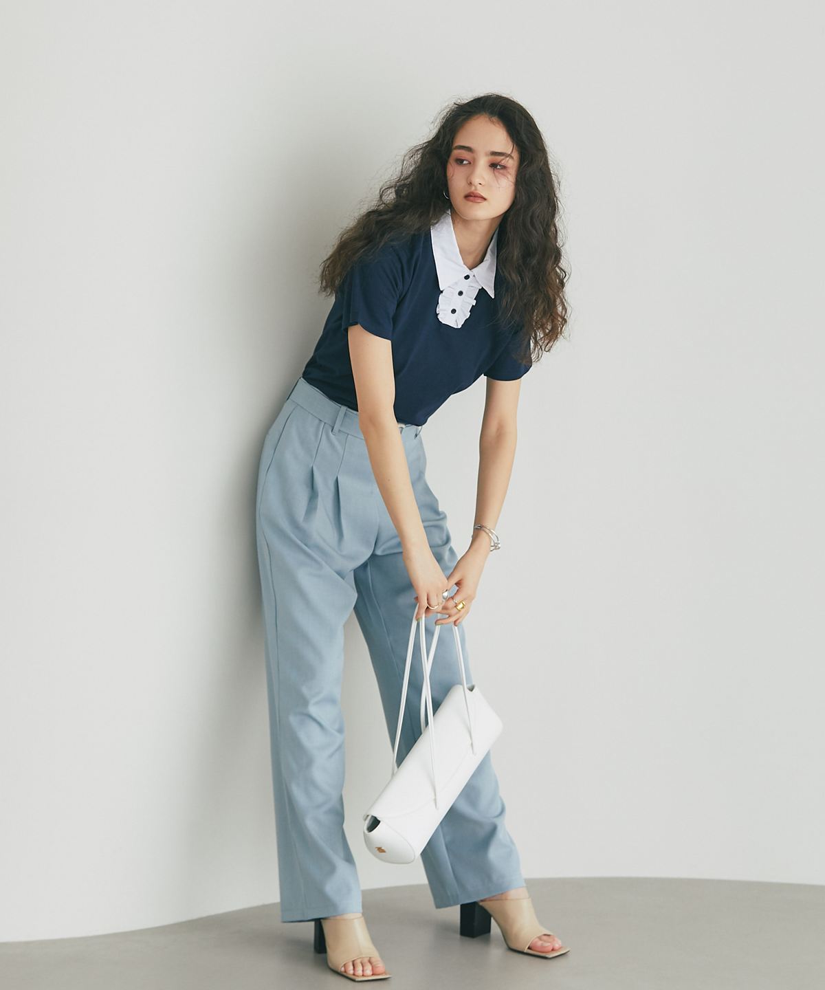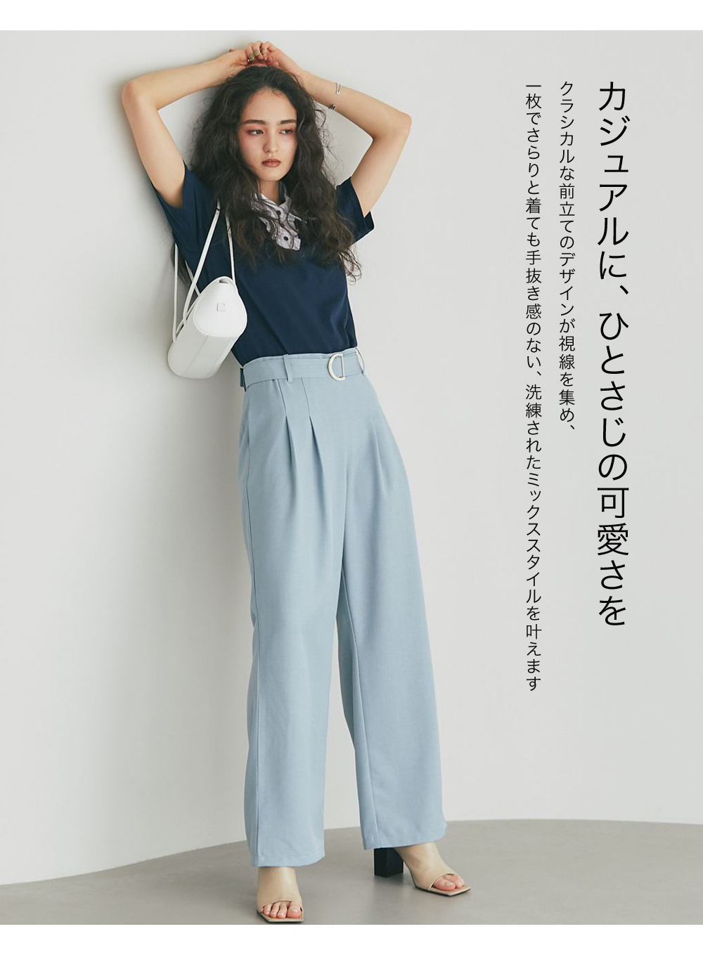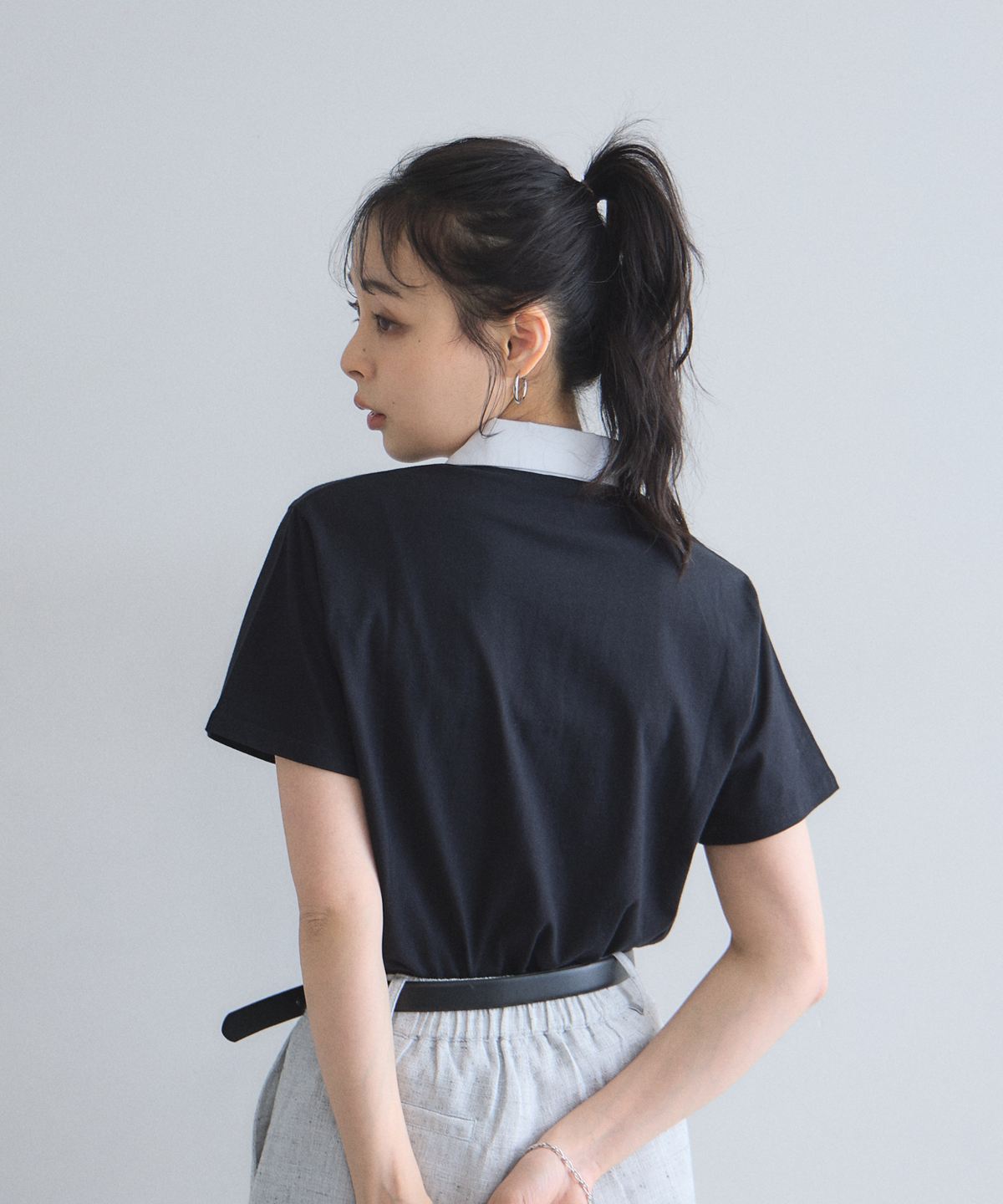 カジュアルな印象のポロシャツを、襟元のフリルとバイカラーデザインでレディにアップデート。
