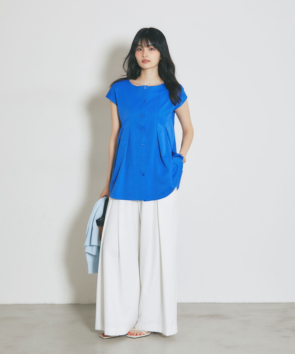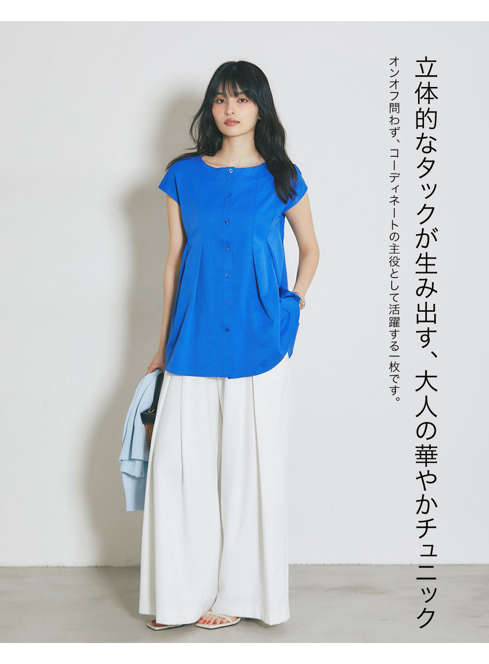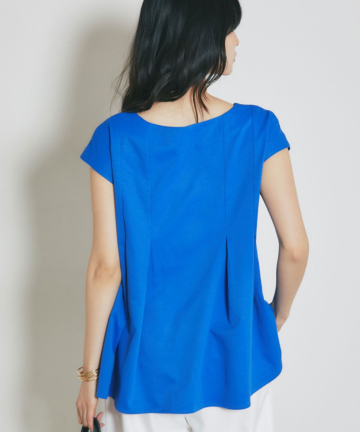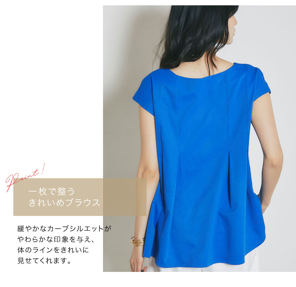 肩にかかる絶妙な袖丈は二の腕をすっきりと見せ、