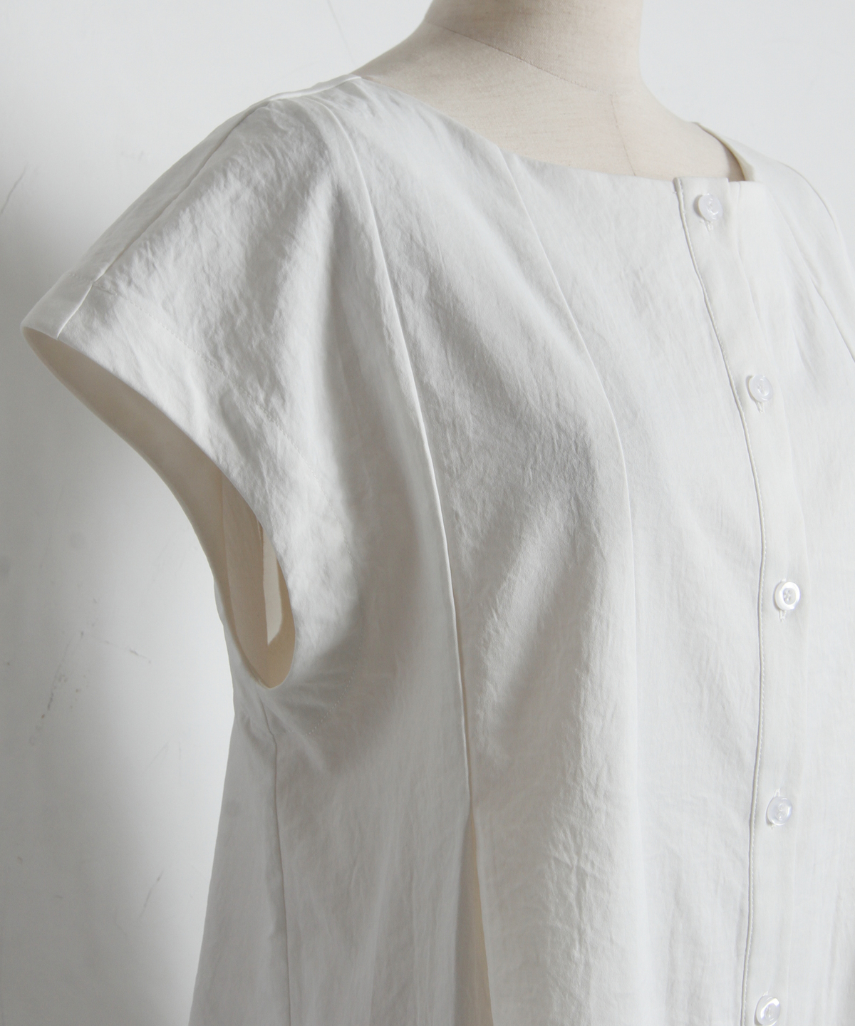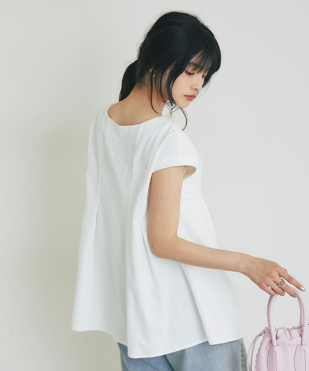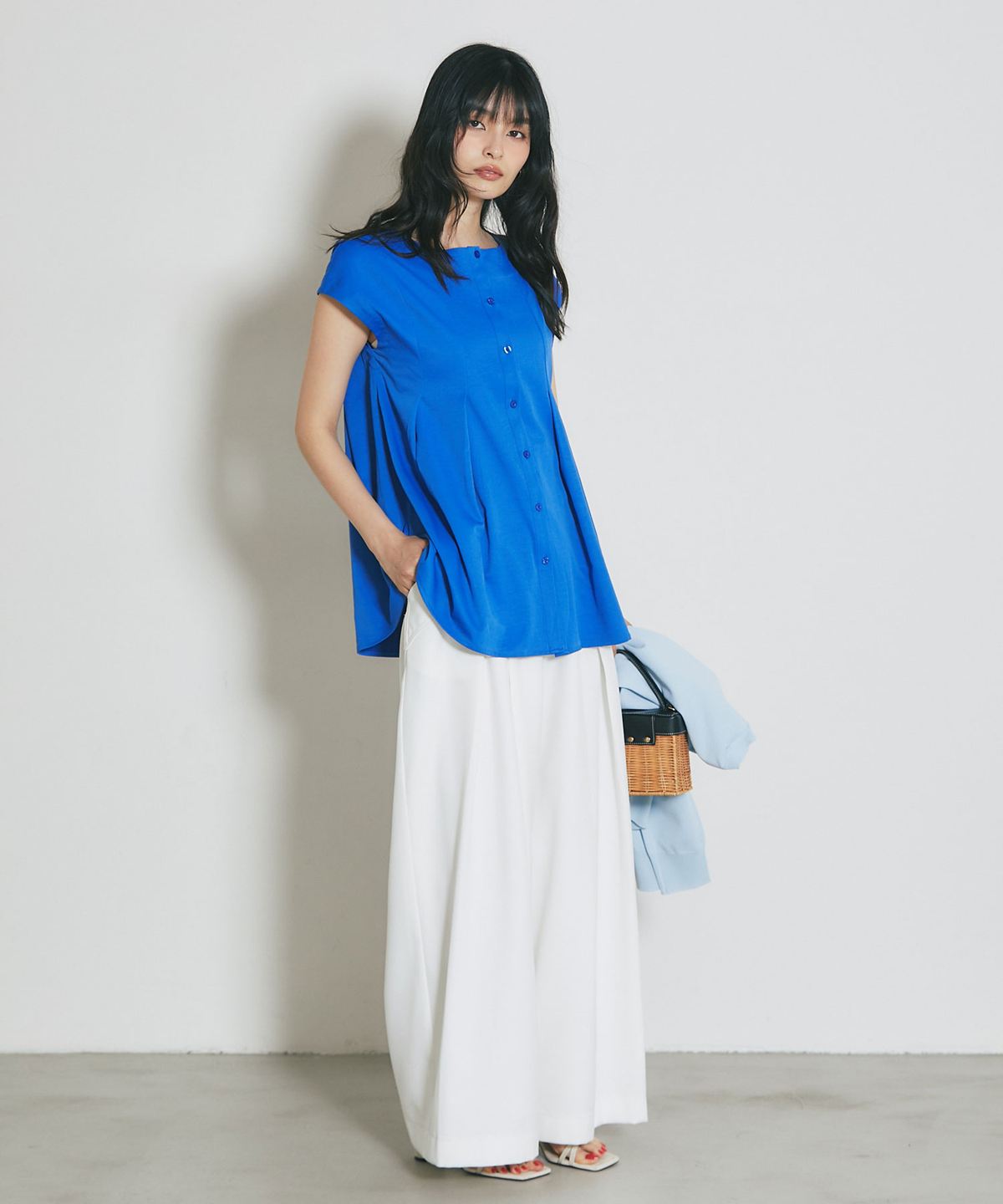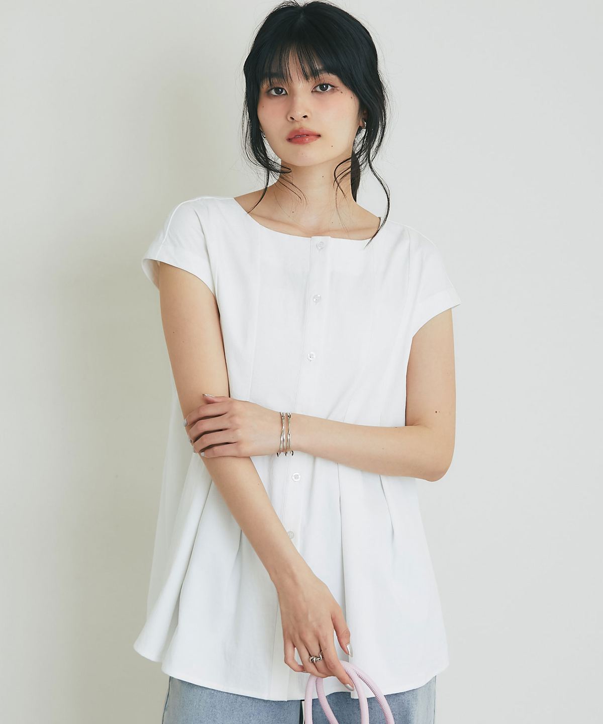 肩にかかる絶妙な袖丈は二の腕をすっきりと見せ、